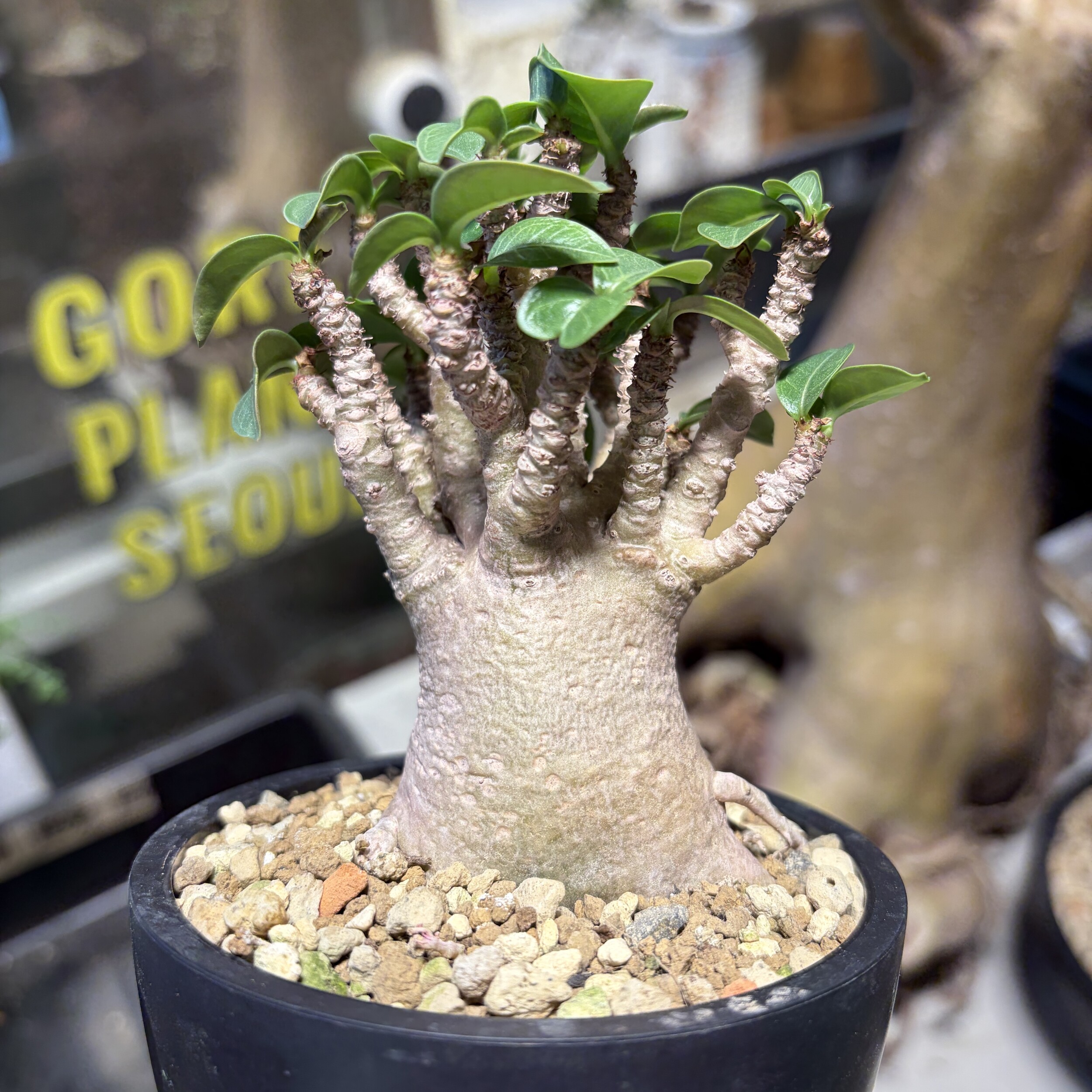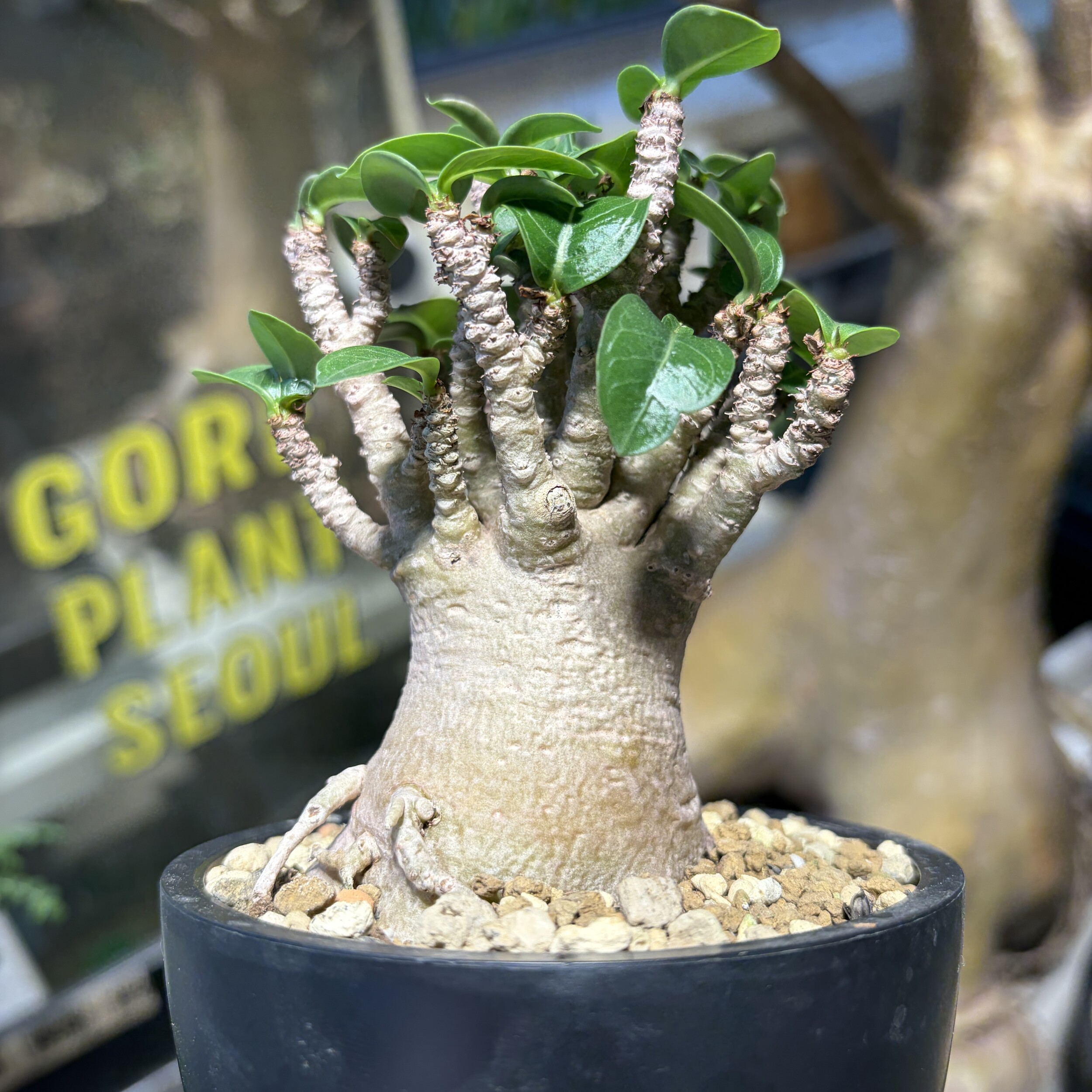 아프리카 예멘 소코트라 섬에서 유래한 식물로 독특한 보틀 트리 형태와 우아한 꽃으로 세계적으로 오랫동안 사랑받아온 대표 코덱스 식물입니다. 바오밥과 닮은 외형이 특징입니다.