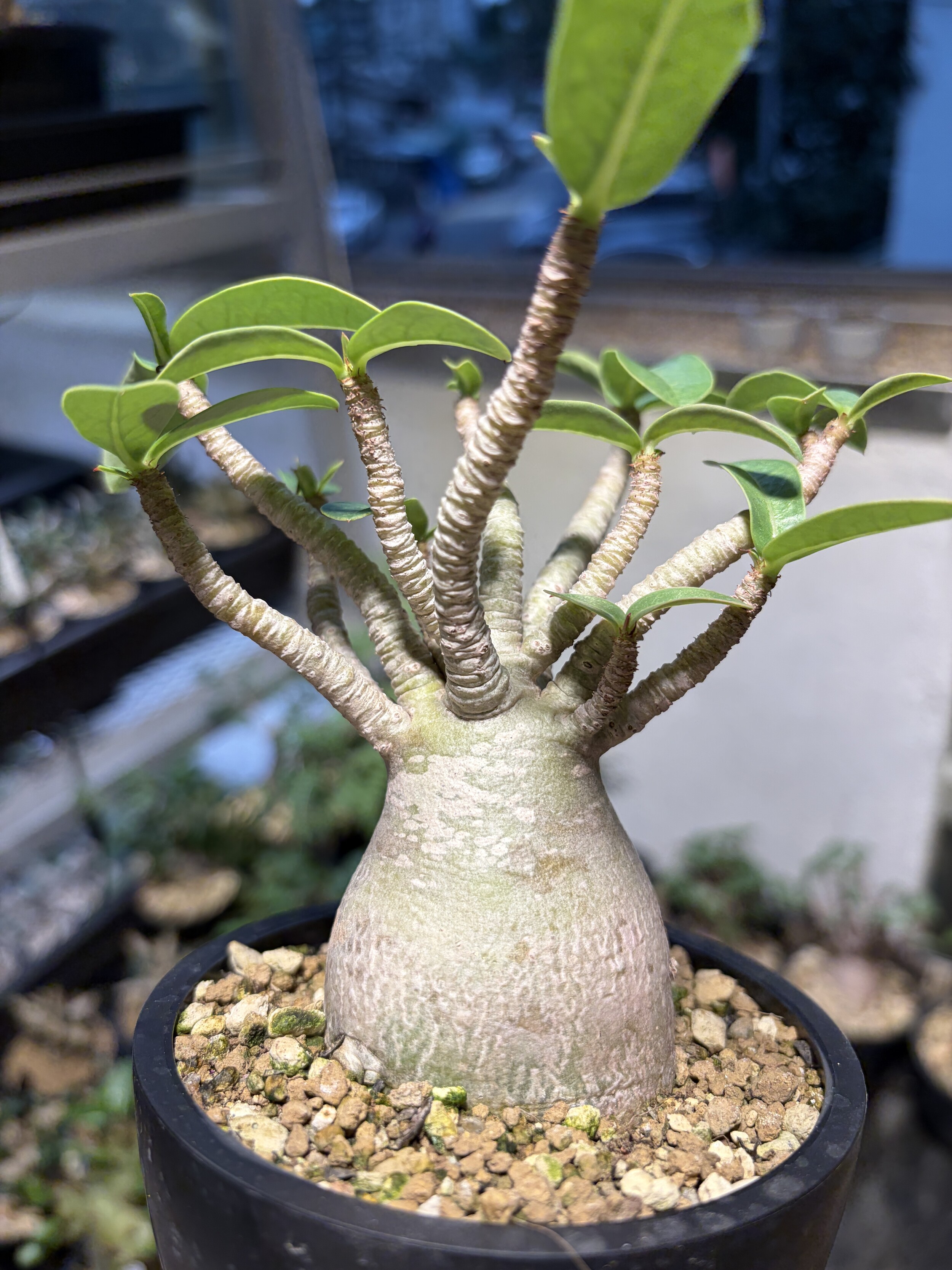 'Caudex' 식물들은 늦가을부터 자연스럽게 잎이 떨어집니다. (환경에 따라 잎이 지지 않을 수 있습니다.) 잎이 떨어지기 시작하면 서서히 물을 줄여나가며 휴면기인 겨울 동안에는 2-3주 1회 가볍게 분무 해주시면 됩니다.
