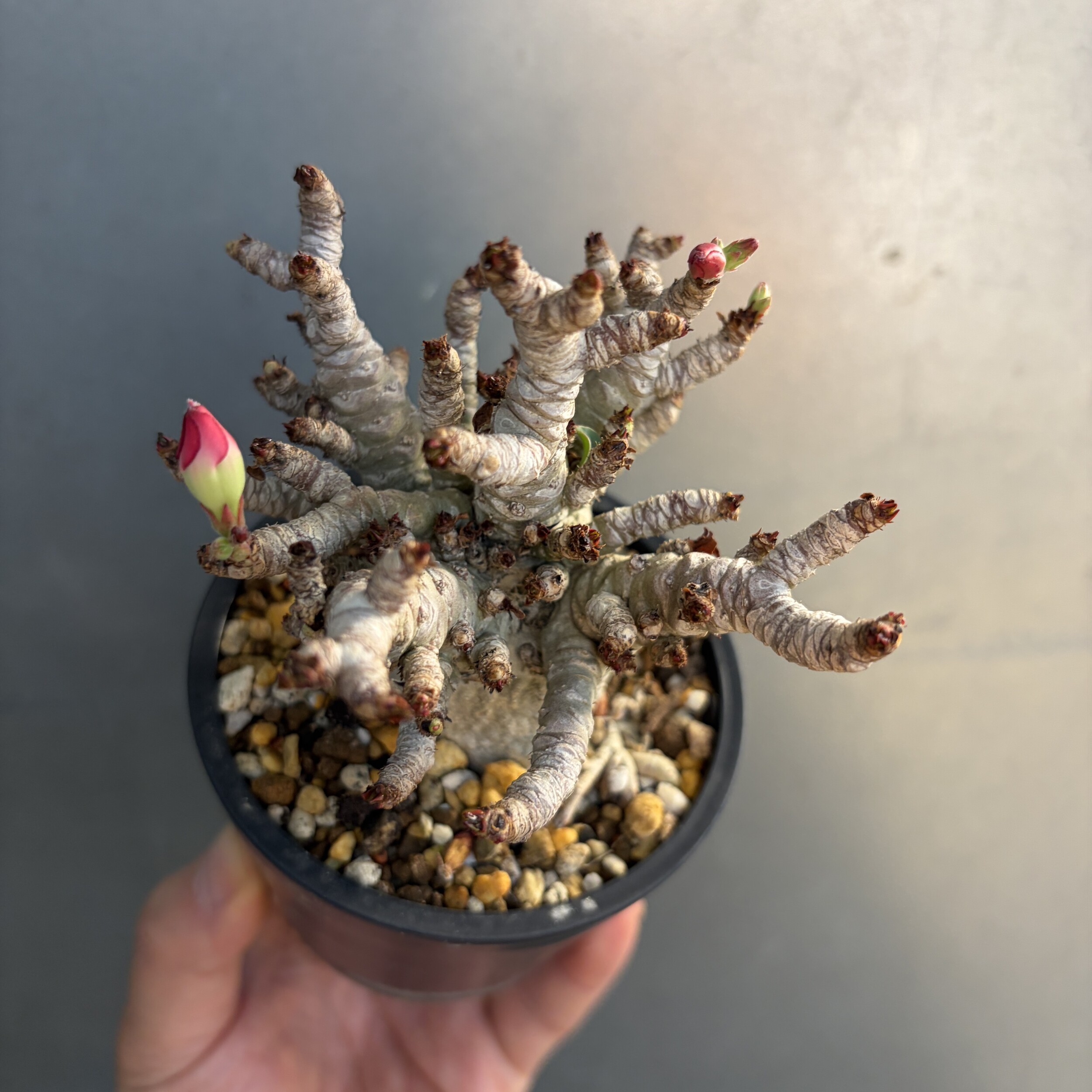 'Caudex' 식물들은 늦가을부터 자연스럽게 잎이 떨어집니다. (환경에 따라 잎이 지지 않을 수 있습니다.) 잎이 떨어지기 시작하면 서서히 물을 줄여나가며 휴면기인 겨울 동안에는 2-3주 1회 가볍게 분무 해주시면 됩니다.