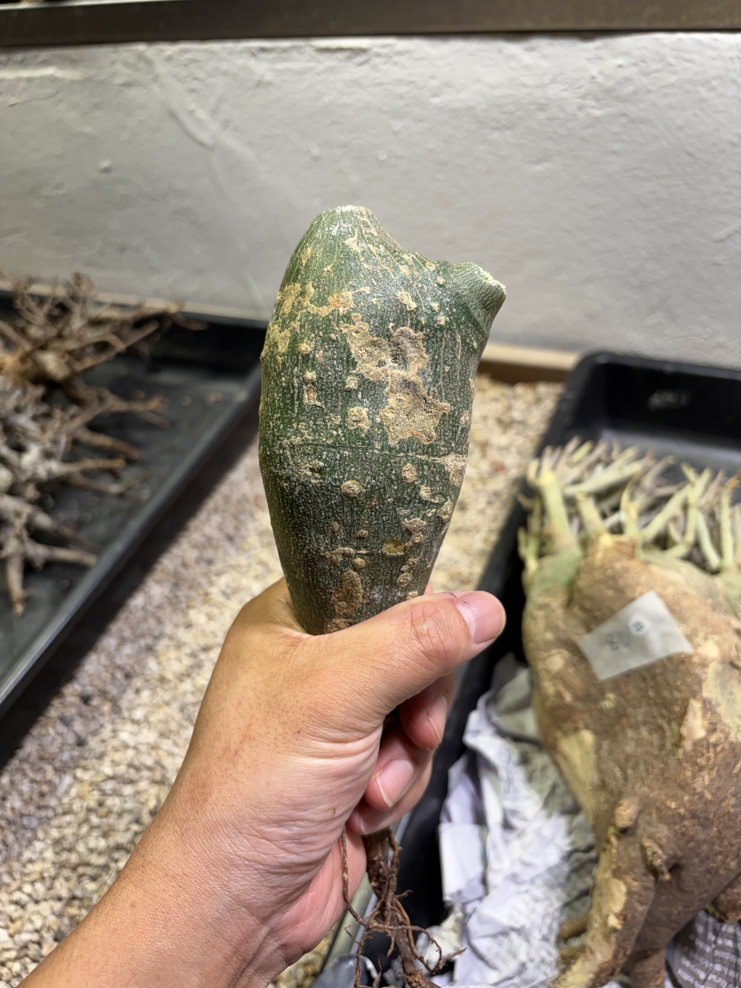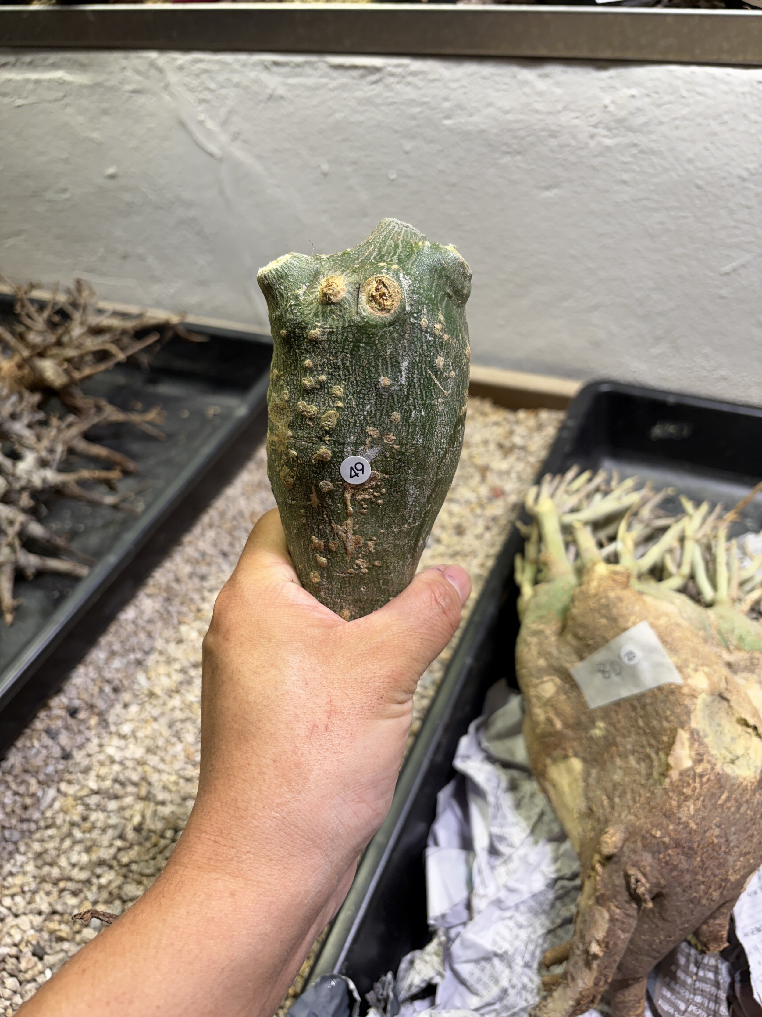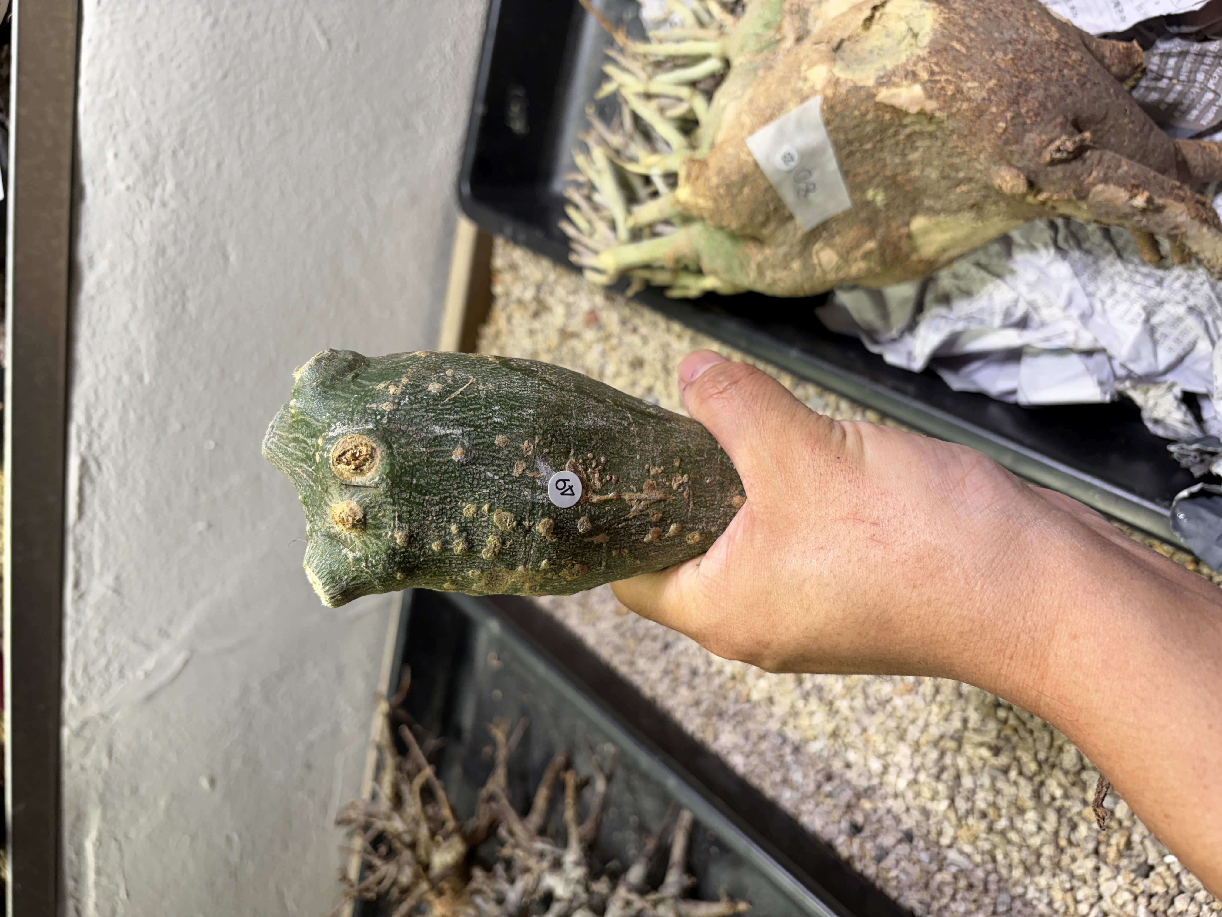 'Caudex' 식물들은 늦가을부터 자연스럽게 잎이 떨어집니다. (환경에 따라 잎이 지지 않을 수 있습니다.) 잎이 떨어지기 시작하면 서서히 물을 줄여나가며 휴면기인 겨울 동안에는 2-3주 1회 가볍게 분무 해주시면 됩니다.