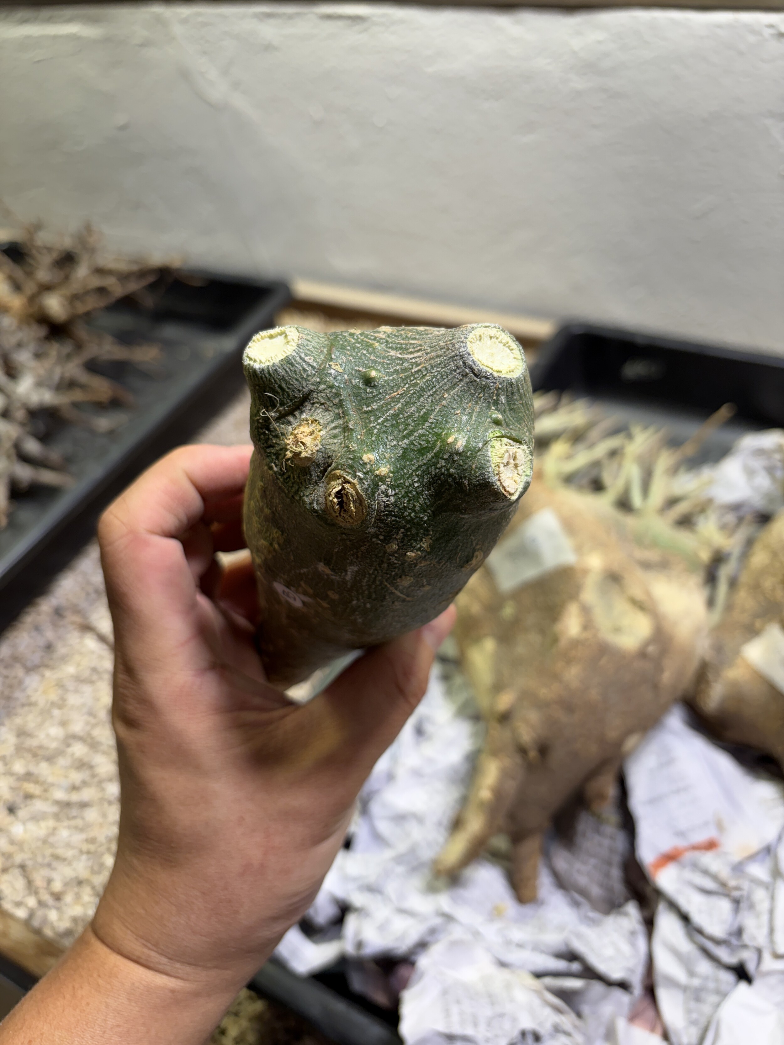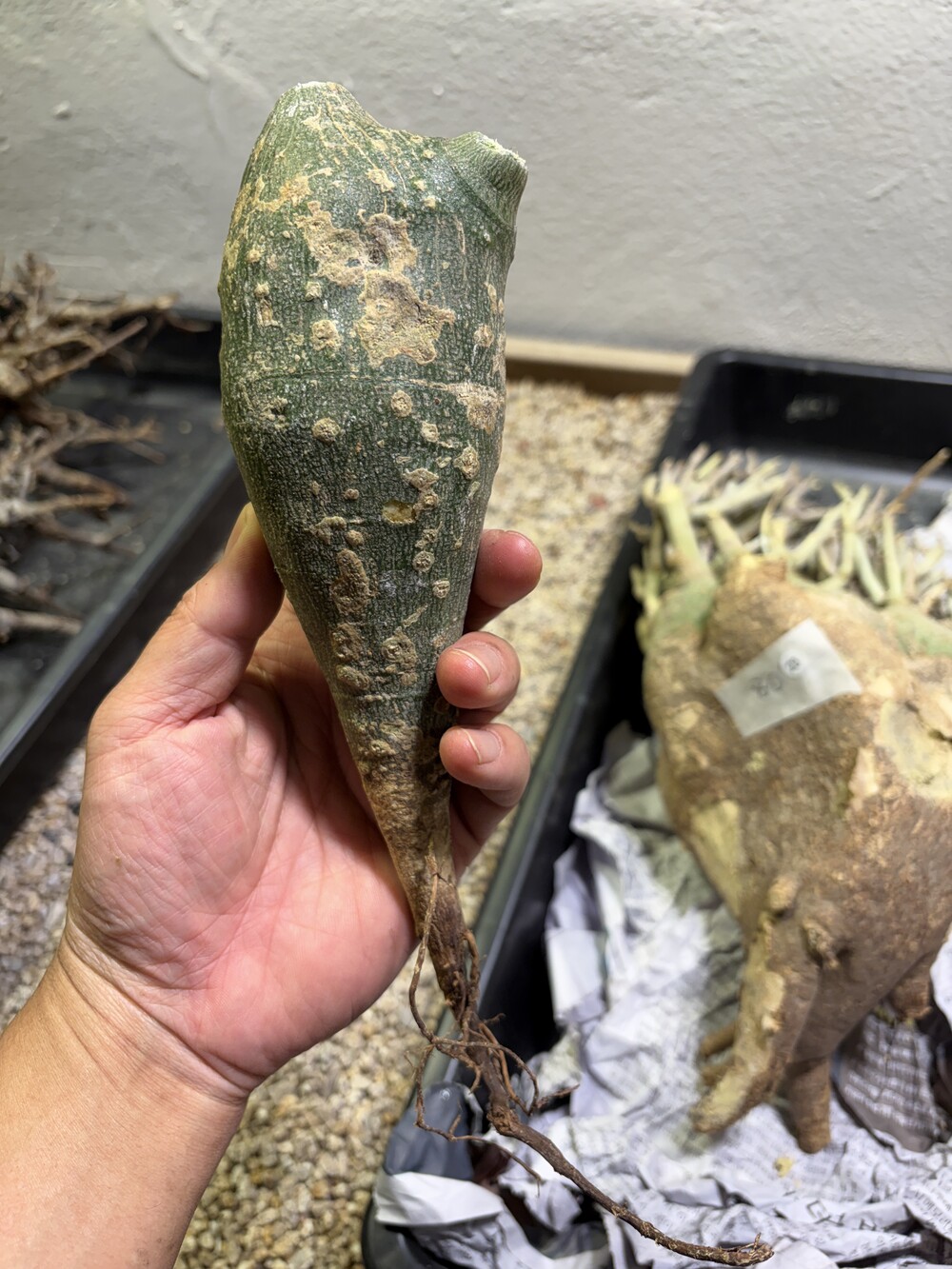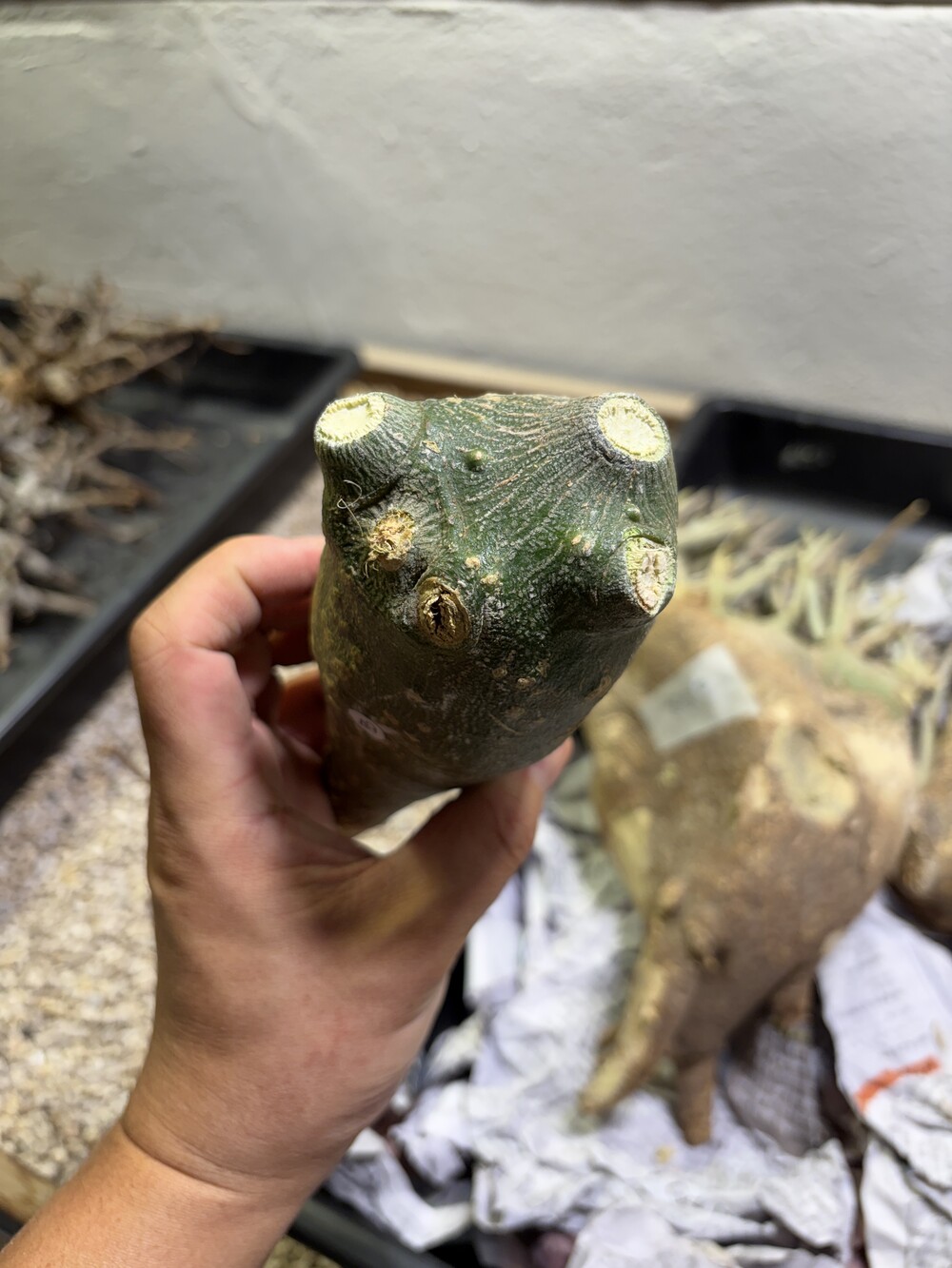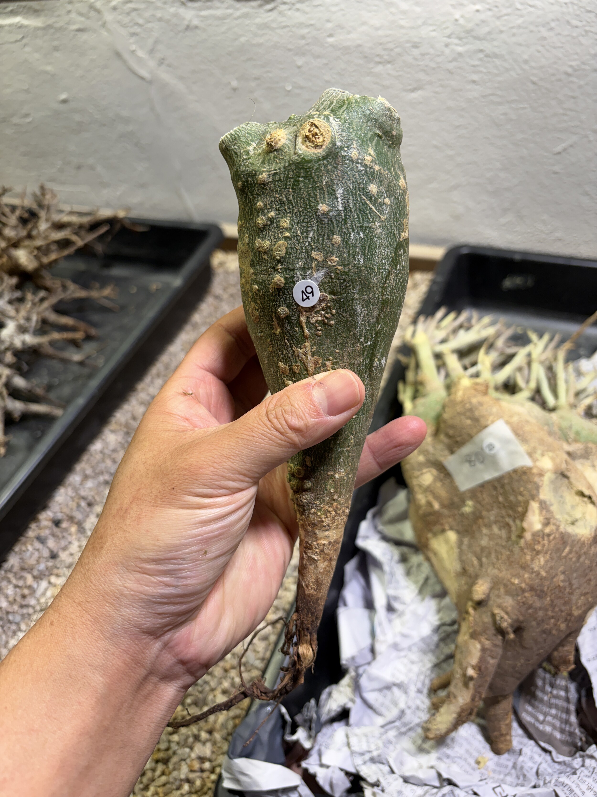 'Caudex' 식물들은 늦가을부터 자연스럽게 잎이 떨어집니다. (환경에 따라 잎이 지지 않을 수 있습니다.) 잎이 떨어지기 시작하면 서서히 물을 줄여나가며 휴면기인 겨울 동안에는 2-3주 1회 가볍게 분무 해주시면 됩니다.