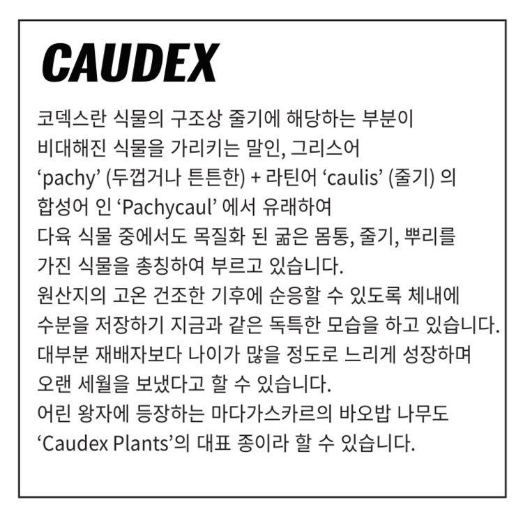 'Caudex' 식물들은 늦가을부터 자연스럽게 잎이 떨어집니다. 잎이 떨어지기 시작하면 서서히 물을 줄여나가며 휴면기인 겨울 동안에는 급수를 중단해야 합니다.