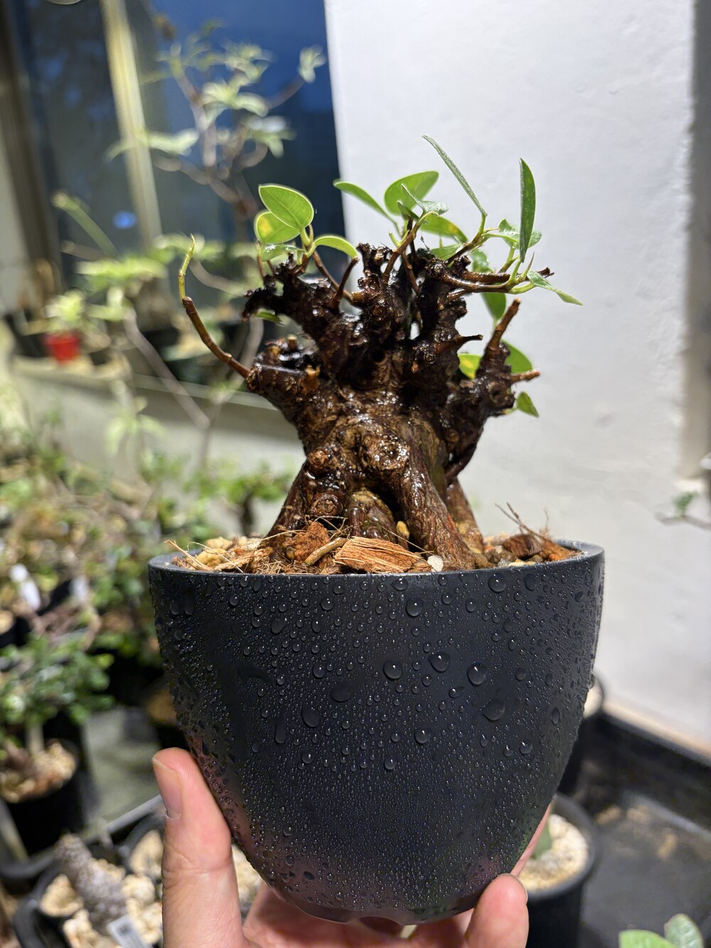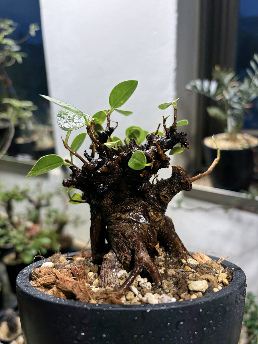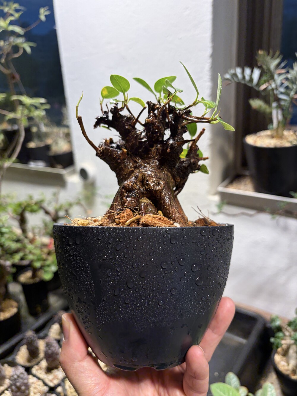 'Caudex' 식물들은 늦가을부터 자연스럽게 잎이 떨어집니다. (환경에 따라 잎이 지지 않을 수 있습니다.) 잎이 떨어지기 시작하면 서서히 물을 줄여나가며 휴면기인 겨울 동안에는 2-3주 1회 가볍게 분무 해주시면 됩니다.