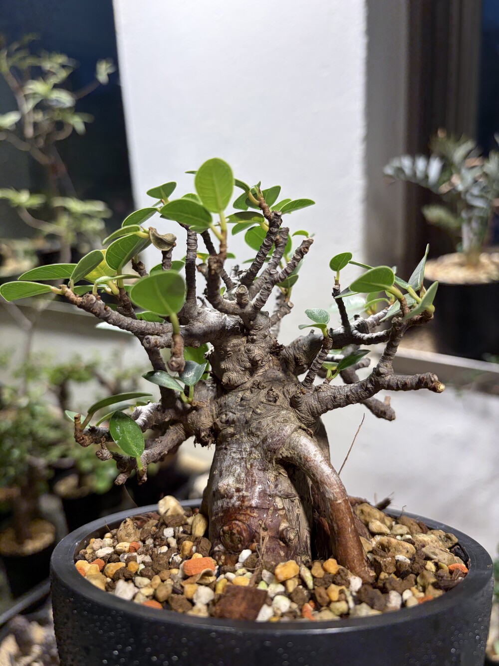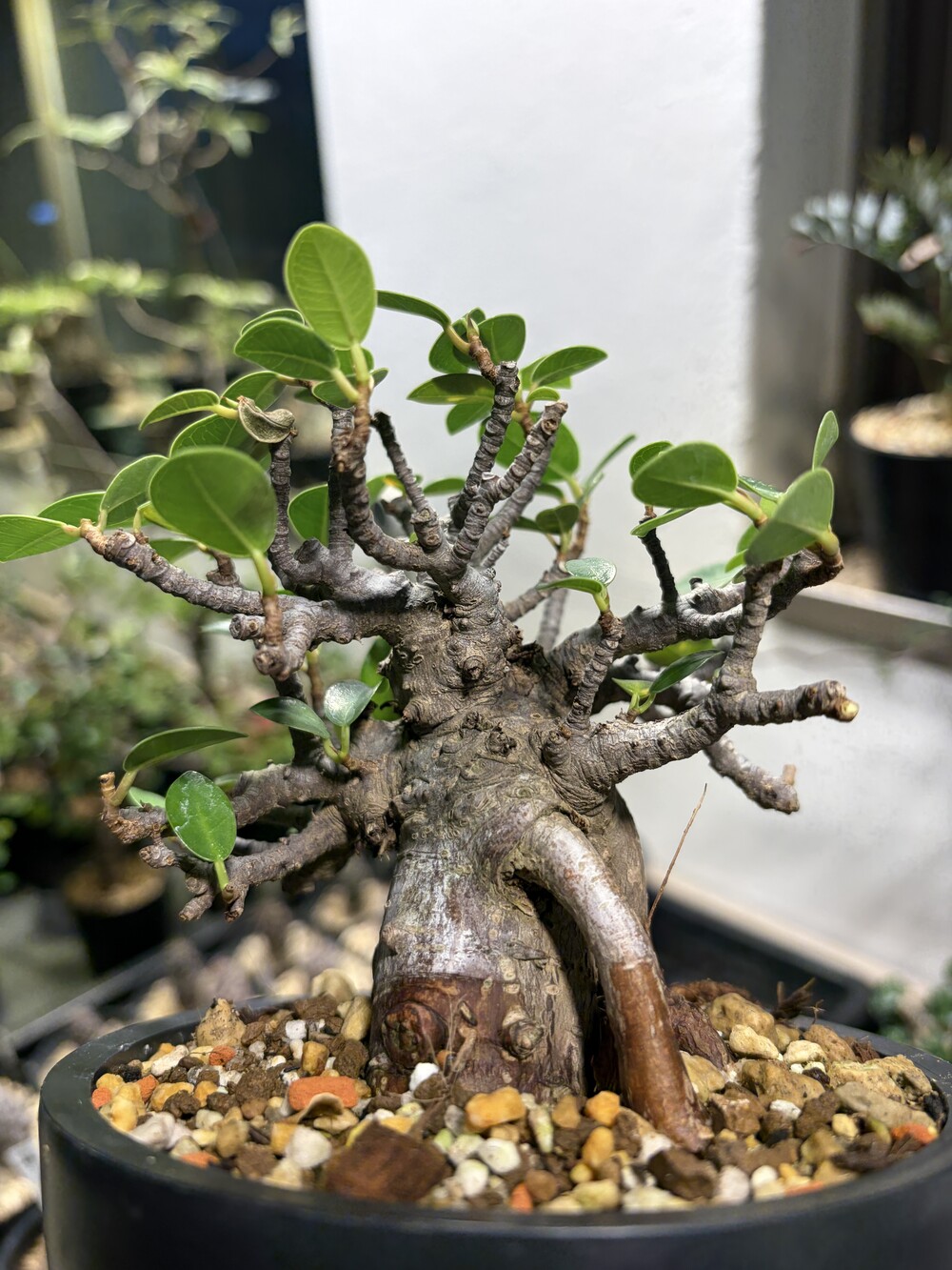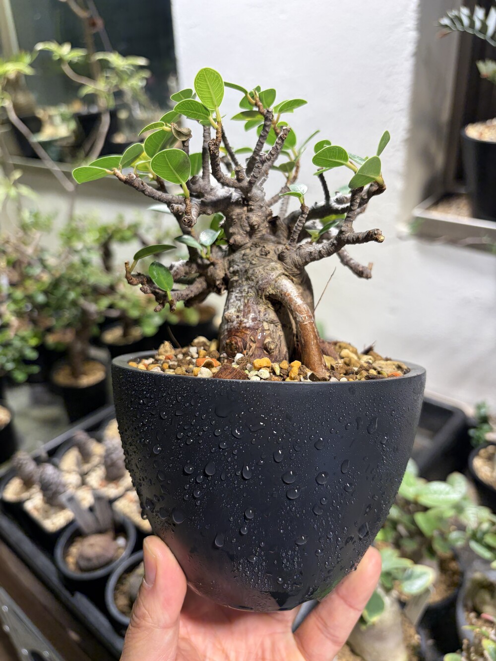 'Caudex' 식물들은 늦가을부터 자연스럽게 잎이 떨어집니다. (환경에 따라 잎이 지지 않을 수 있습니다.) 잎이 떨어지기 시작하면 서서히 물을 줄여나가며 휴면기인 겨울 동안에는 2-3주 1회 가볍게 분무 해주시면 됩니다.