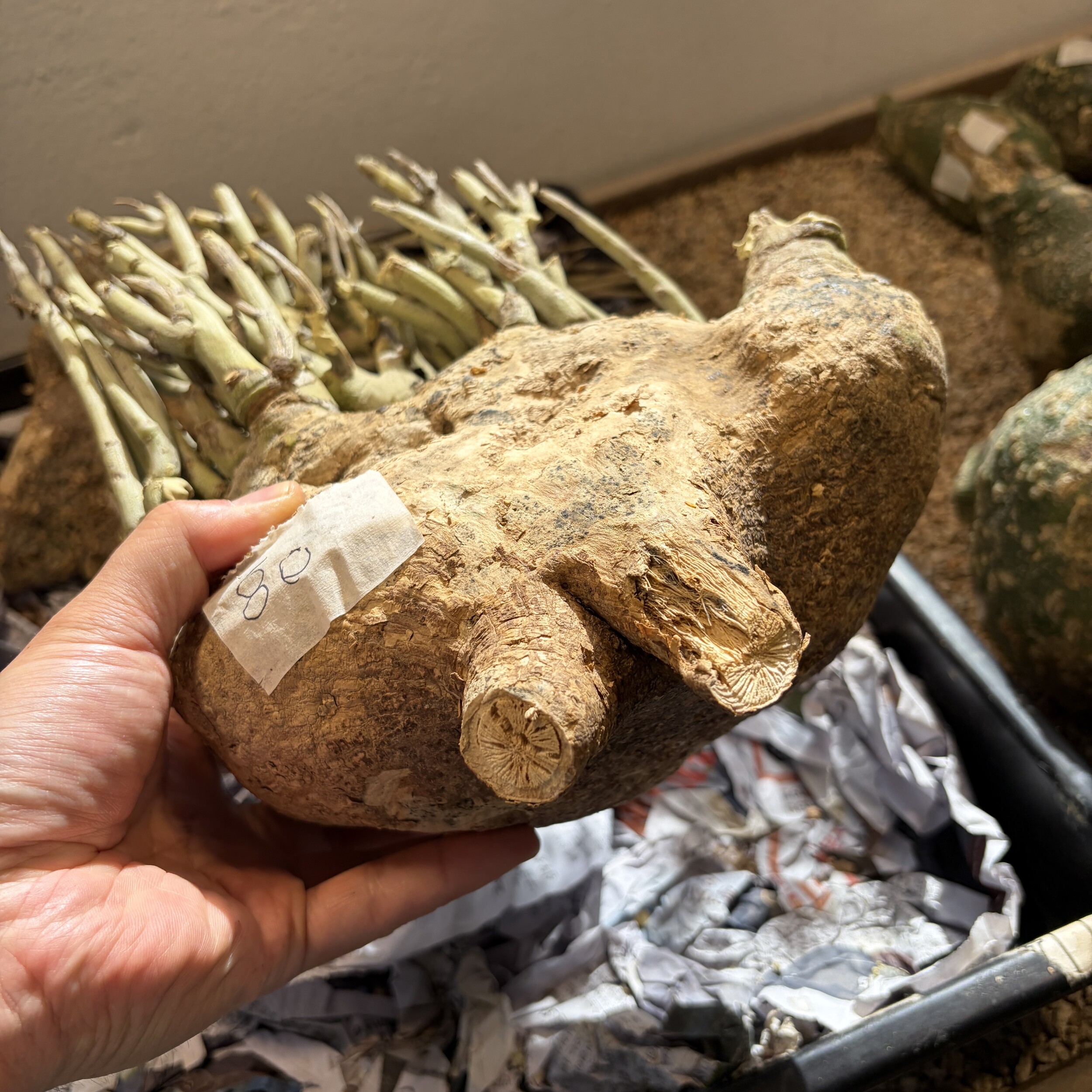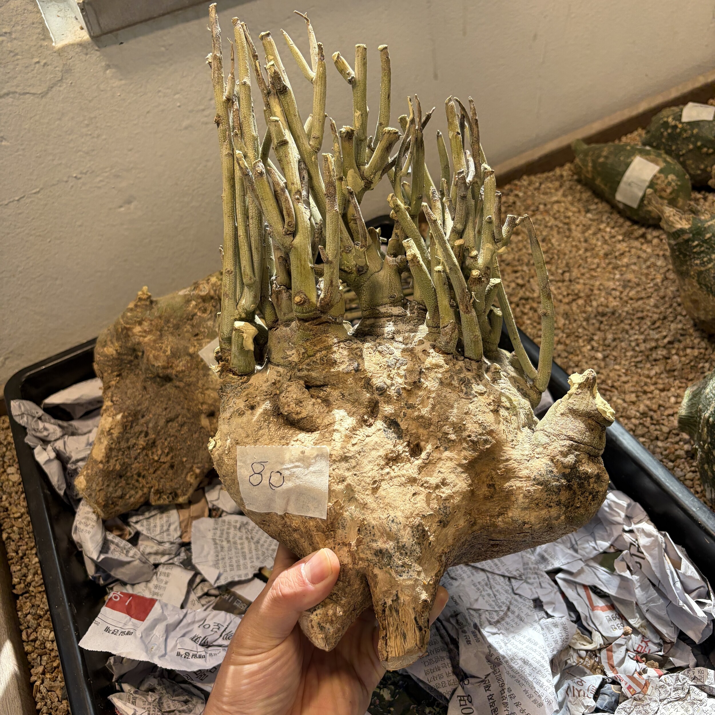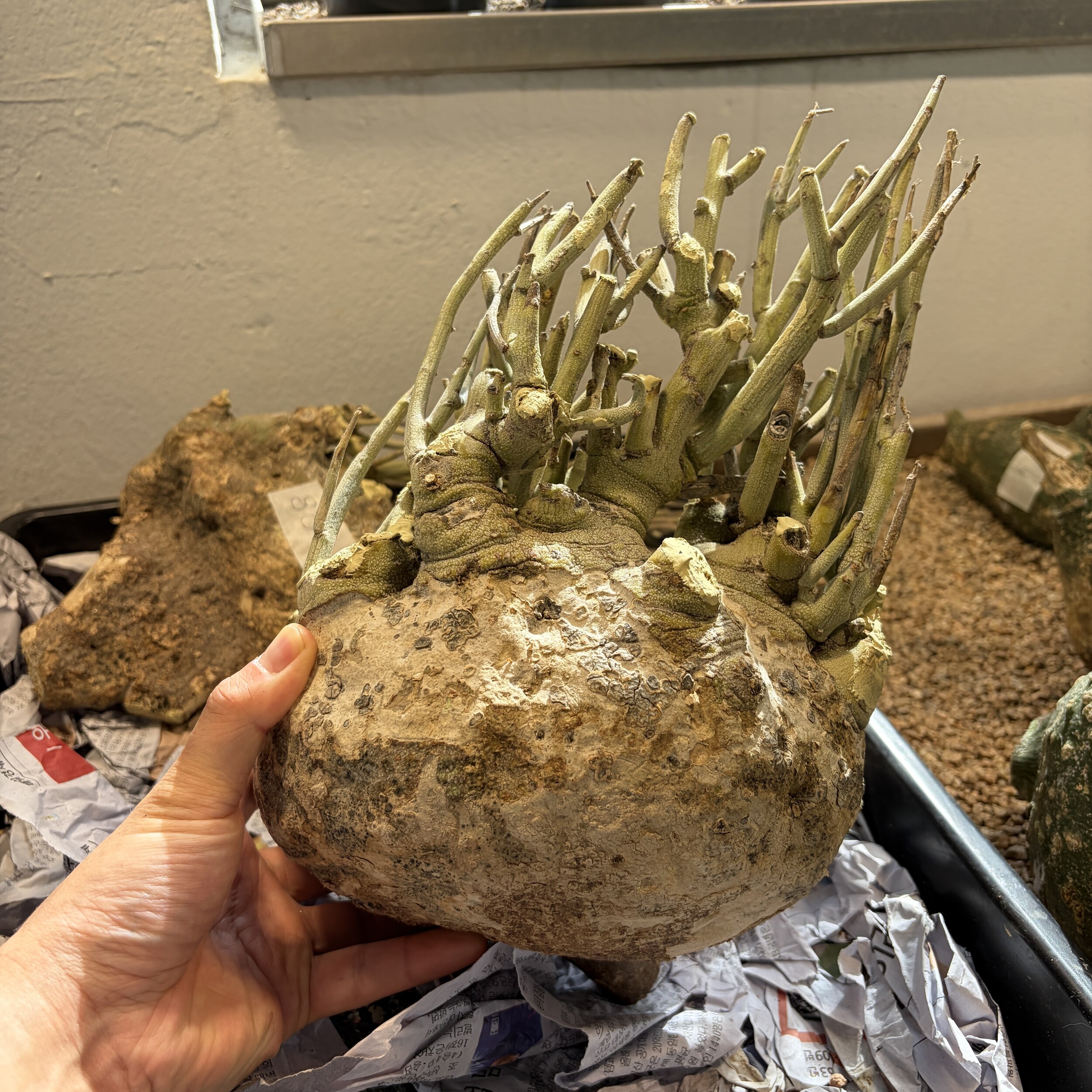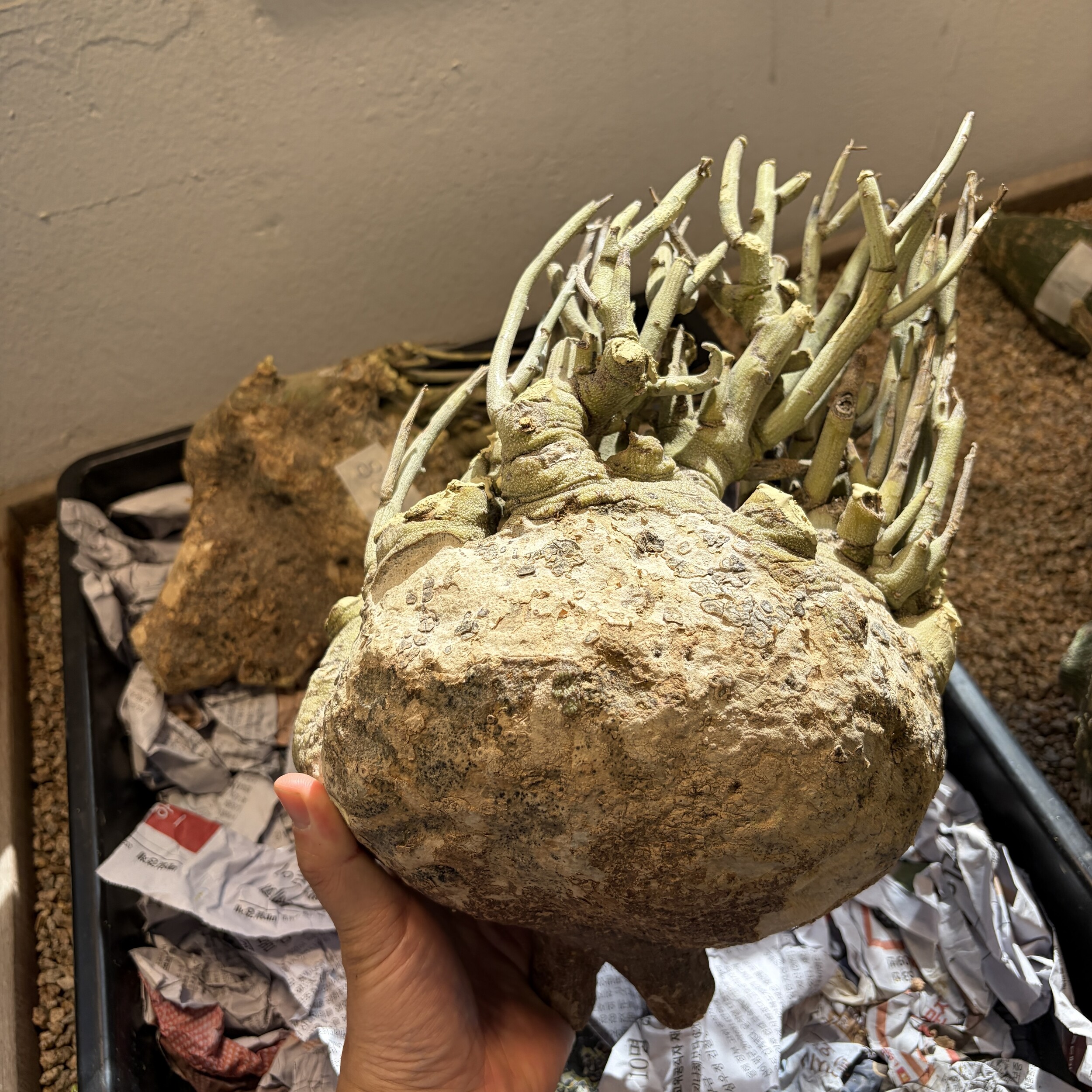 'Caudex' 식물들은 늦가을부터 자연스럽게 잎이 떨어집니다. (환경에 따라 잎이 지지 않을 수 있습니다.) 잎이 떨어지기 시작하면 서서히 물을 줄여나가며 휴면기인 겨울 동안에는 2-3주 1회 가볍게 분무 해주시면 됩니다.