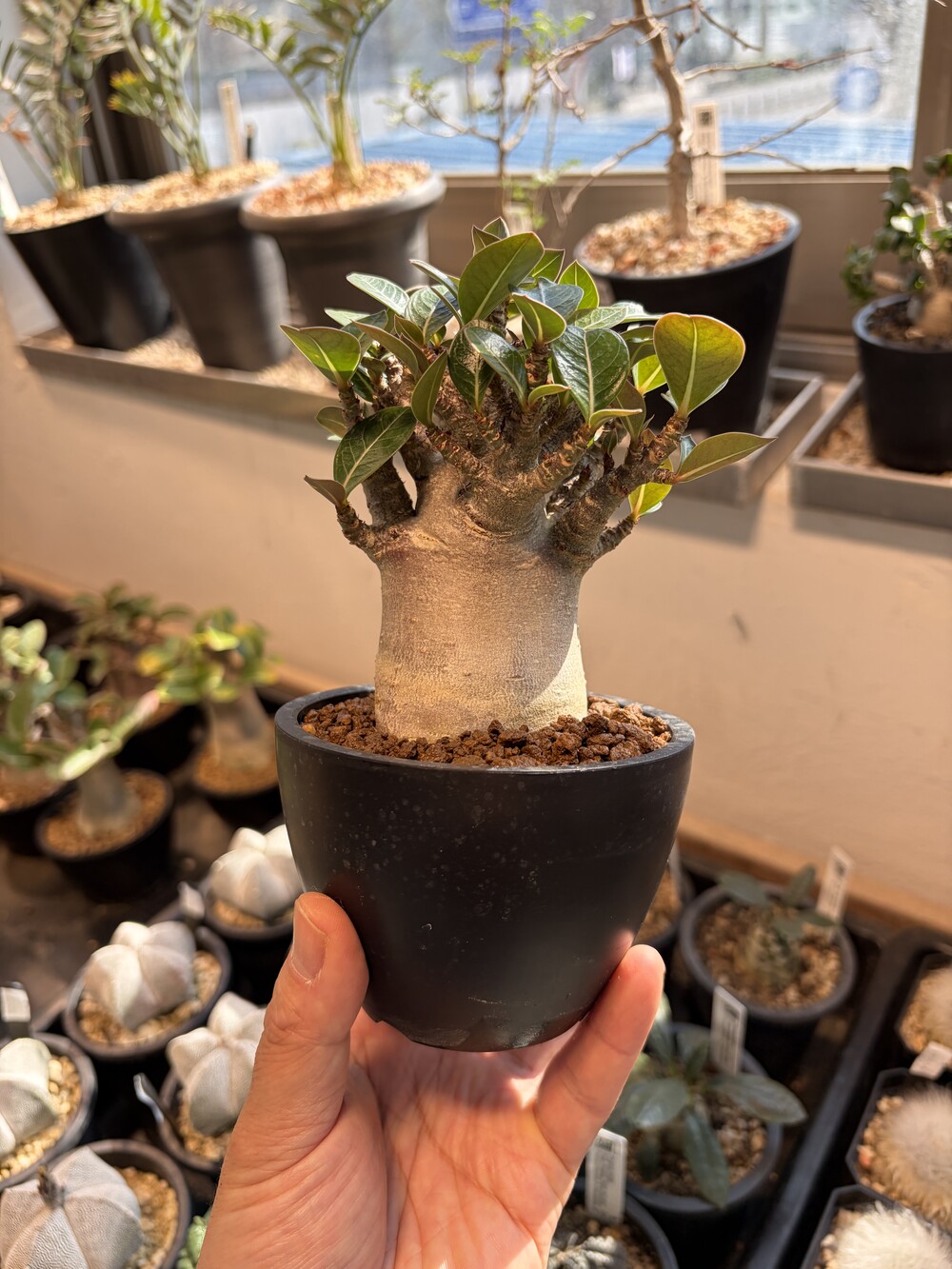 'Caudex' 식물들은 늦가을부터 자연스럽게 잎이 떨어집니다. (환경에 따라 잎이 지지 않을 수 있습니다.) 잎이 떨어지기 시작하면 서서히 물을 줄여나가며 휴면기인 겨울 동안에는 2-3주 1회 가볍게 분무 해주시면 됩니다.