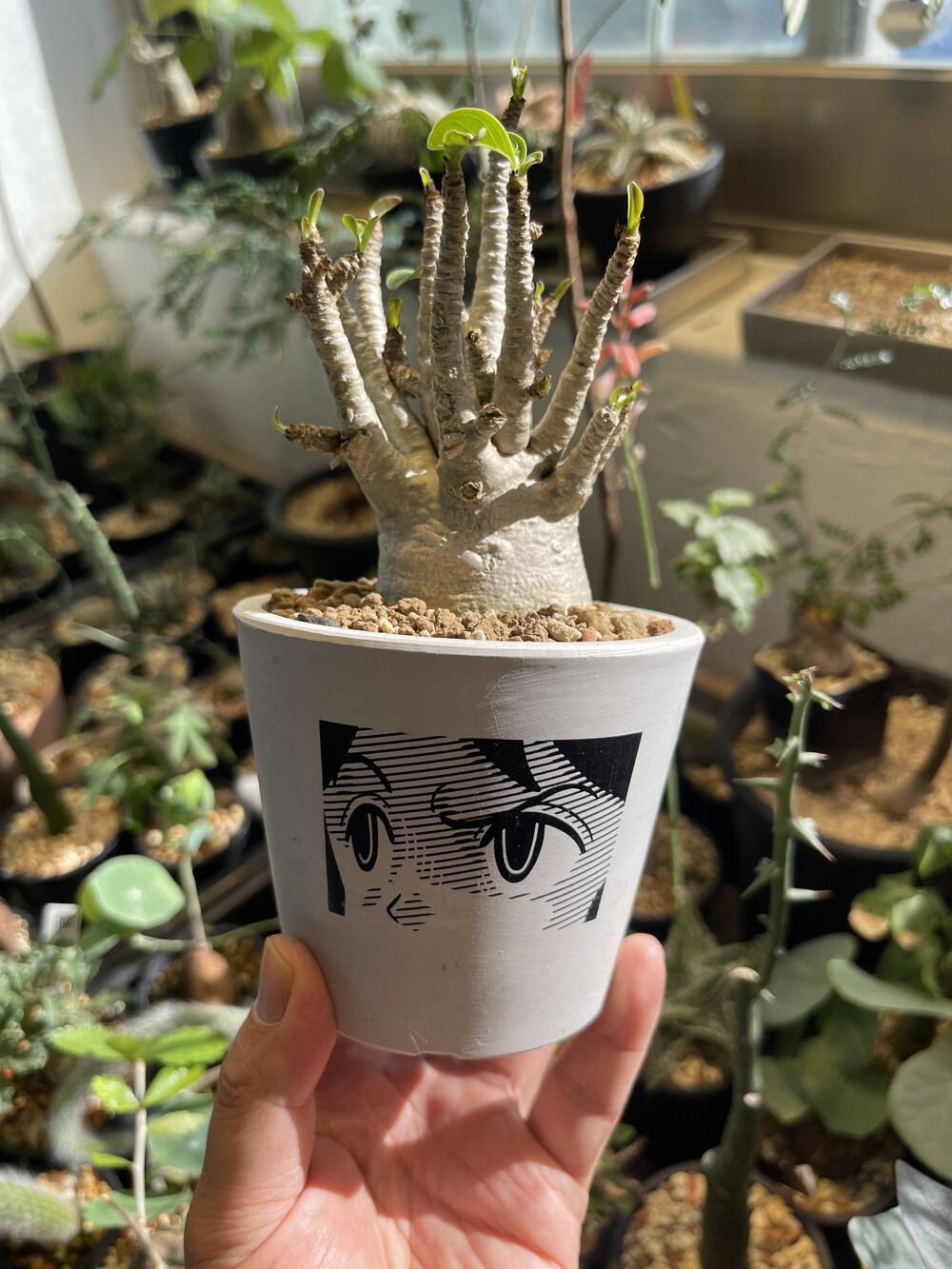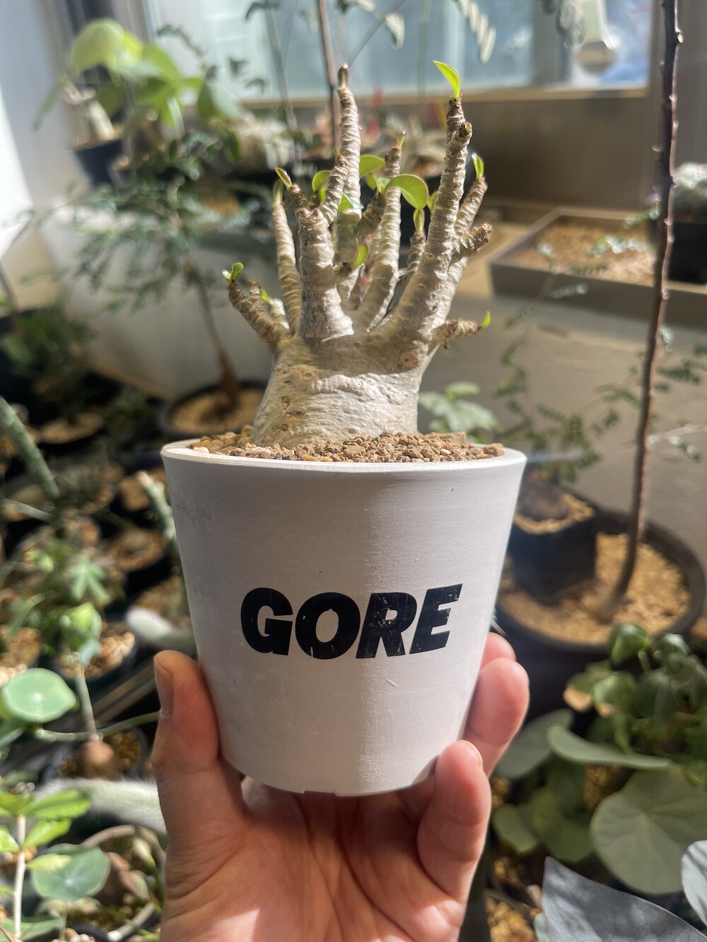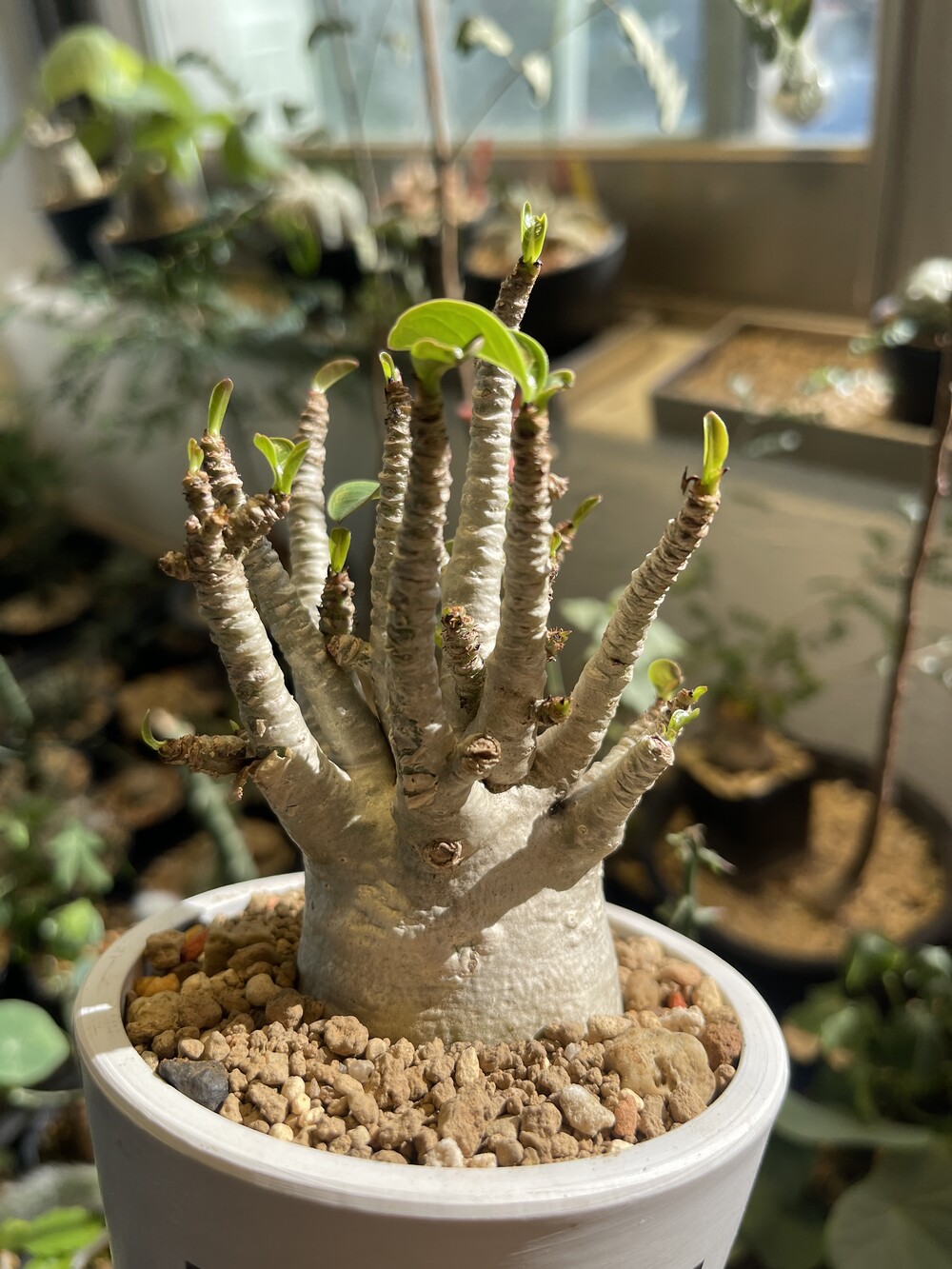 'Caudex' 식물들은 늦가을부터 자연스럽게 잎이 떨어집니다. (환경에 따라 잎이 지지 않을 수 있습니다.) 잎이 떨어지기 시작하면 서서히 물을 줄여나가며 휴면기인 겨울 동안에는 2-3주 1회 가볍게 분무 해주시면 됩니다.