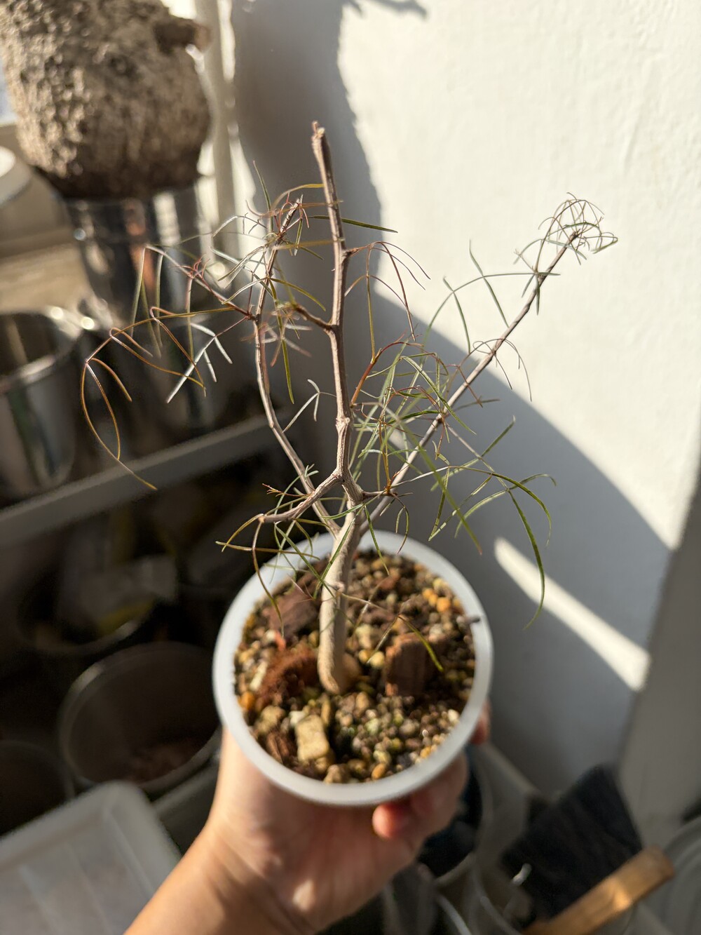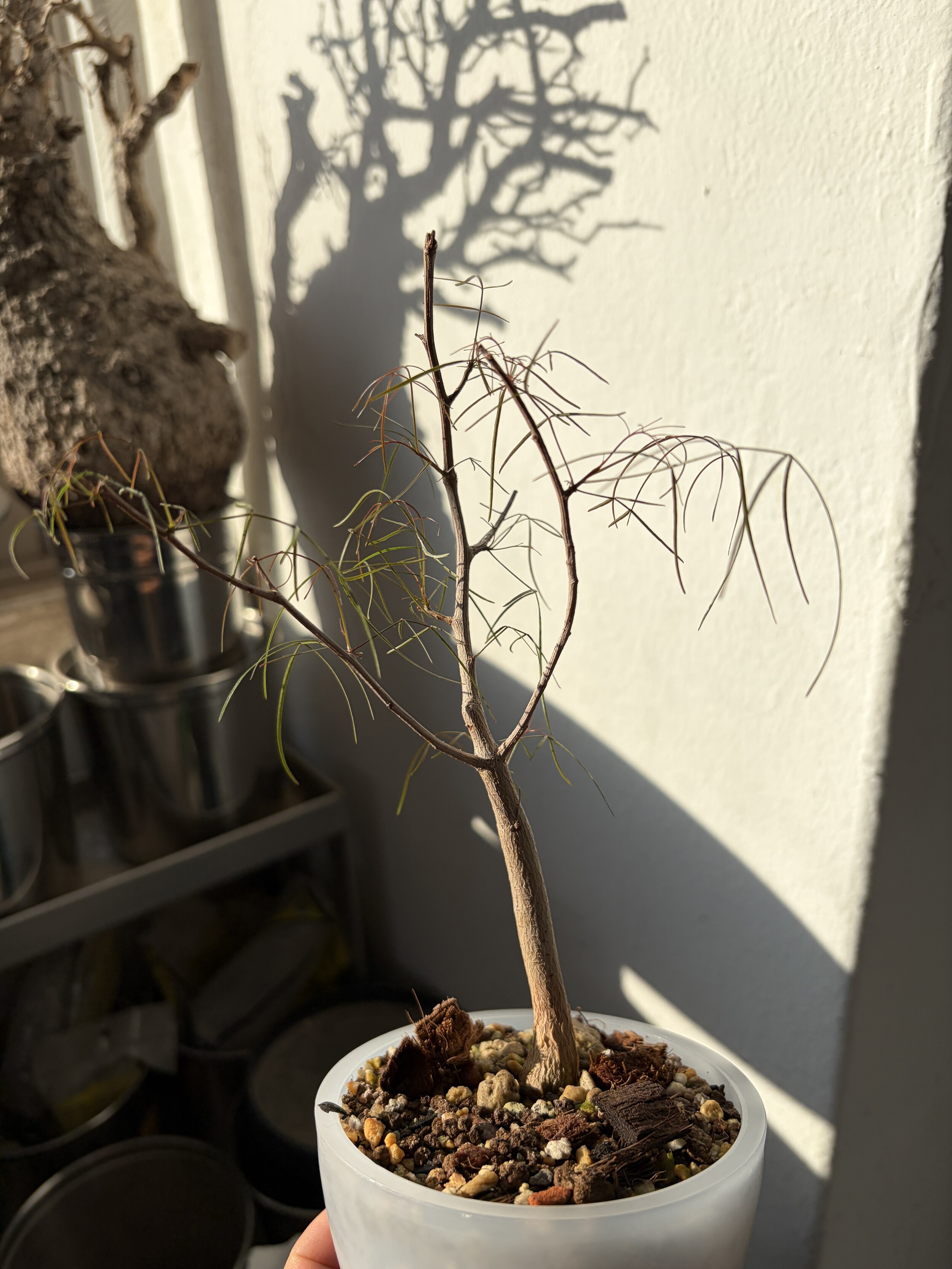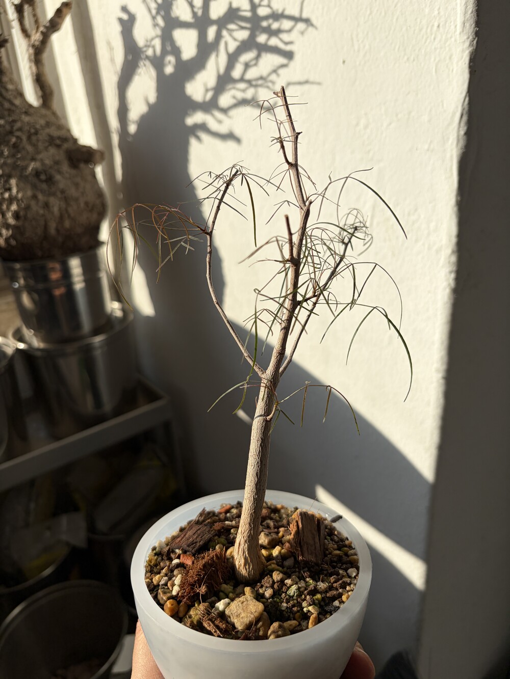 'Caudex' 식물들은 늦가을부터 자연스럽게 잎이 떨어집니다. (환경에 따라 잎이 지지 않을 수 있습니다.) 잎이 떨어지기 시작하면 서서히 물을 줄여나가며 휴면기인 겨울 동안에는 2-3주 1회 가볍게 분무 해주시면 됩니다.