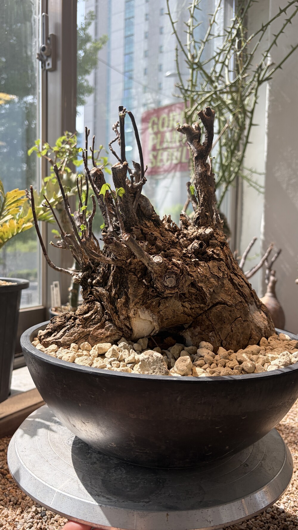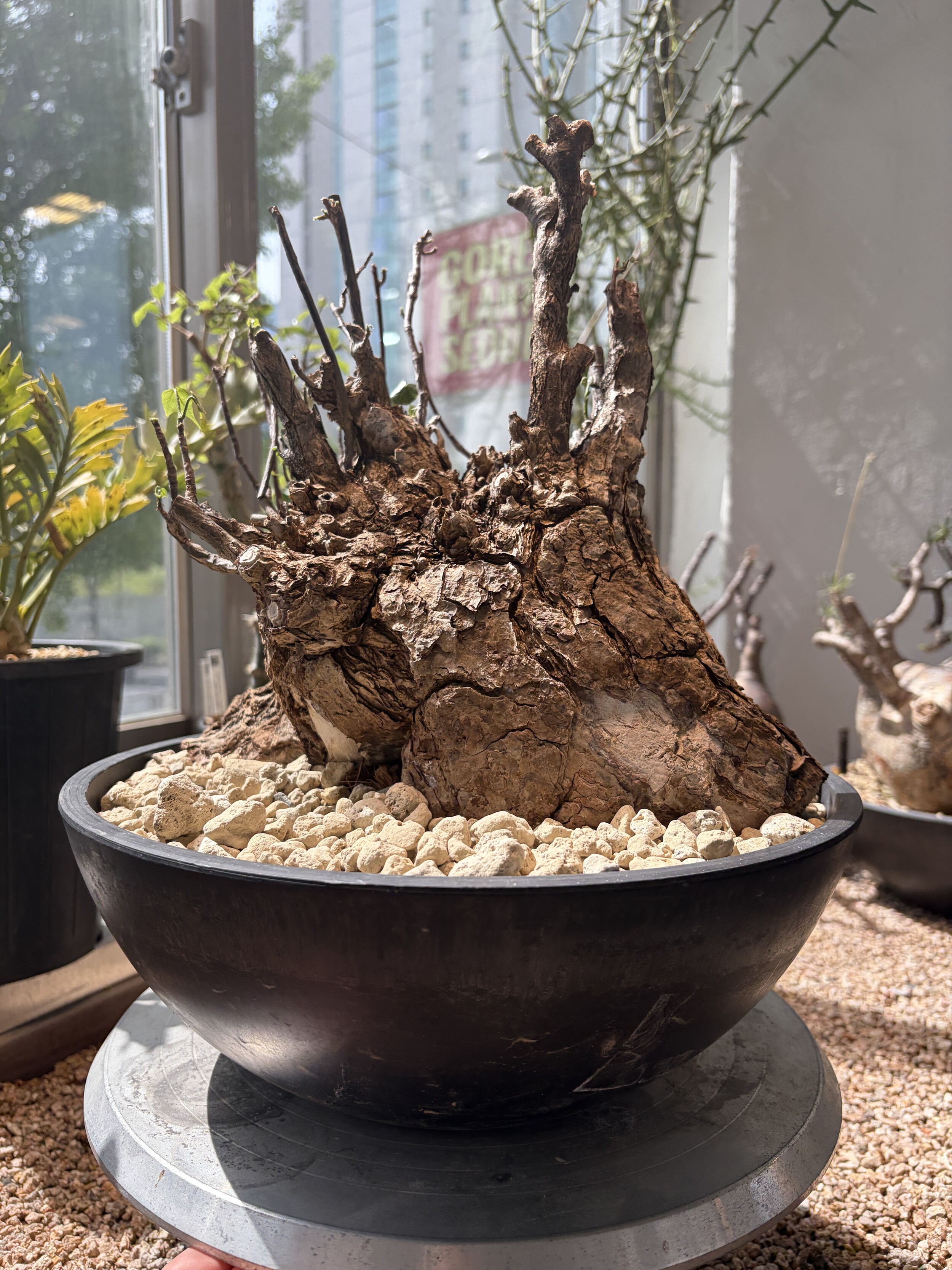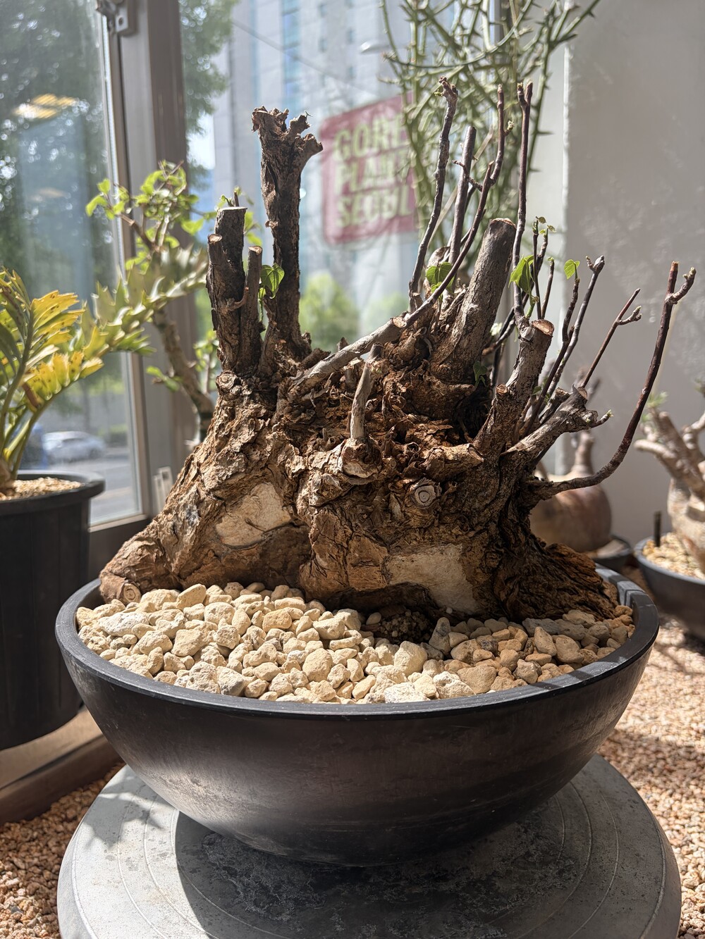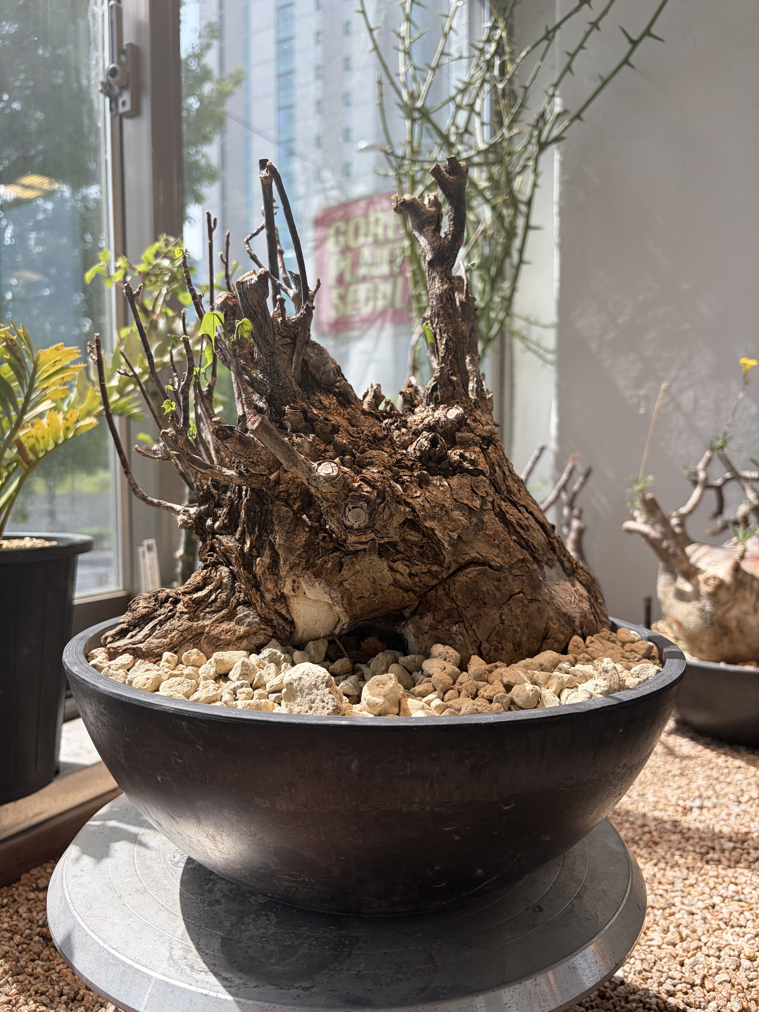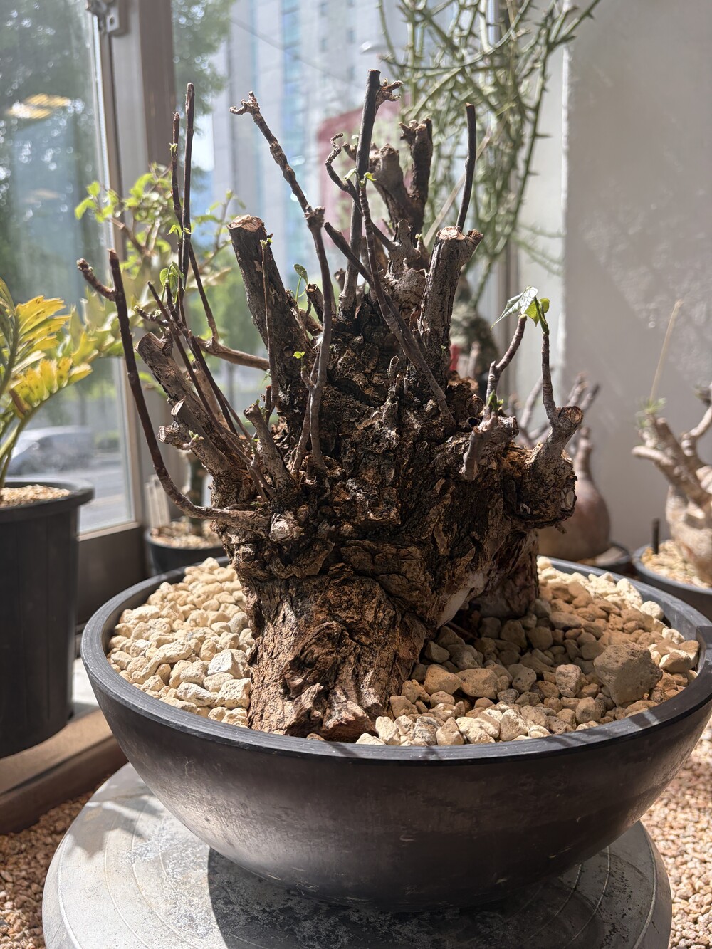 'Caudex' 식물들은 늦가을부터 자연스럽게 잎이 떨어집니다. (환경에 따라 잎이 지지 않을 수 있습니다.) 잎이 떨어지기 시작하면 서서히 물을 줄여나가며 휴면기인 겨울 동안에는 2-3주 1회 가볍게 분무 해주시면 됩니다.