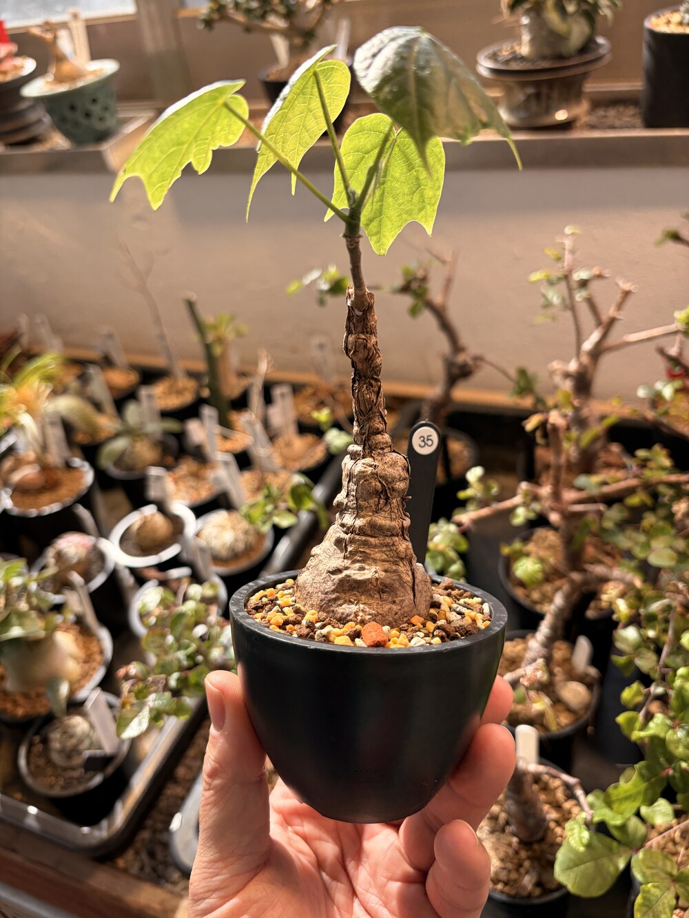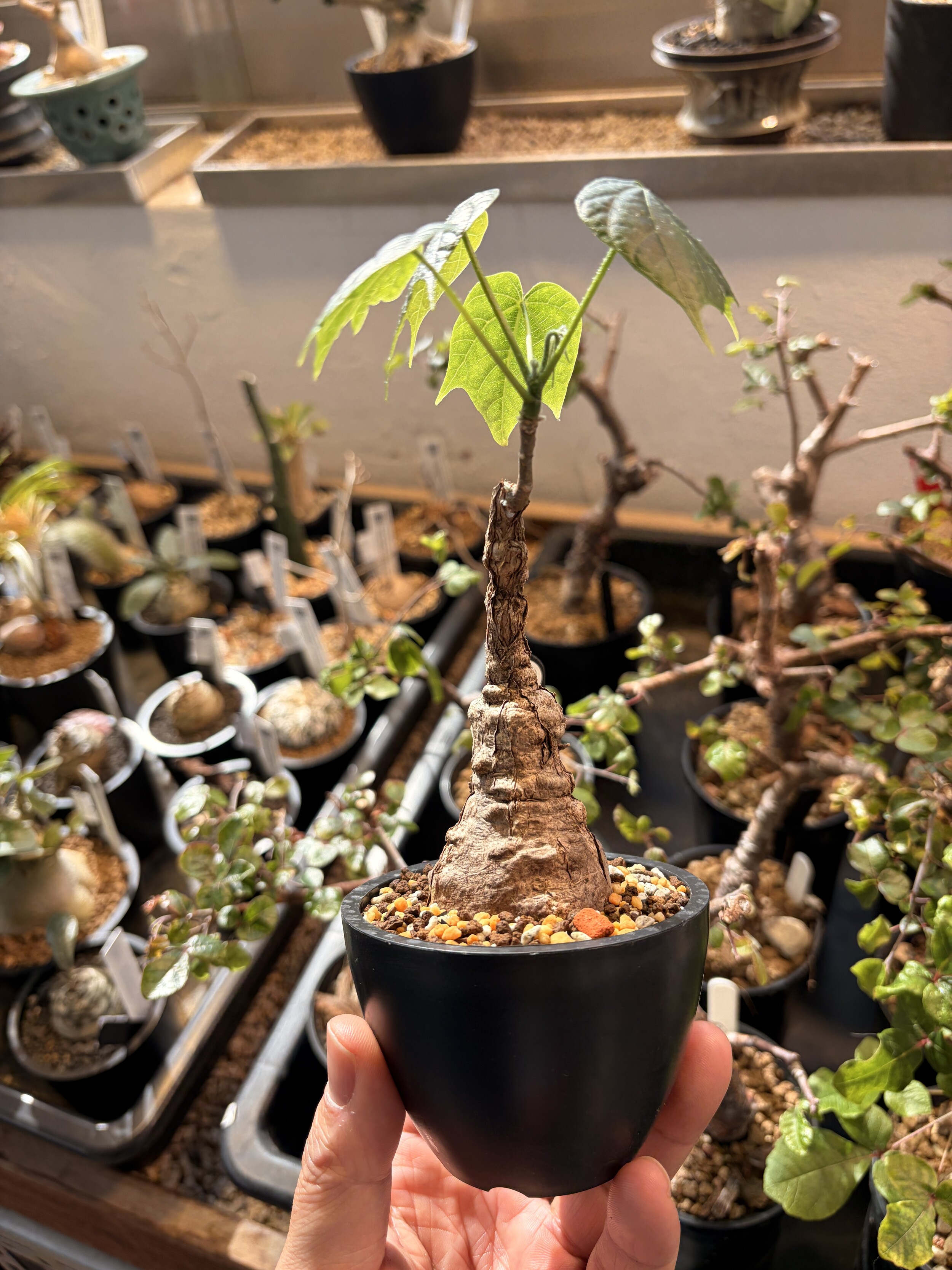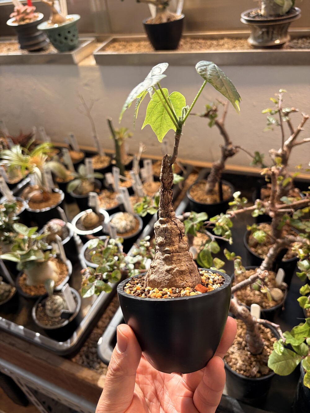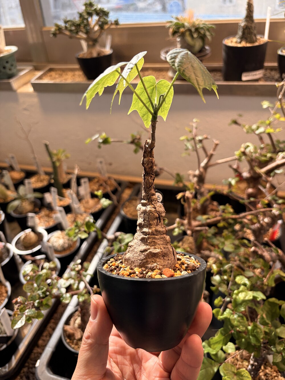 'Caudex' 식물들은 늦가을부터 자연스럽게 잎이 떨어집니다. (환경에 따라 잎이 지지 않을 수 있습니다.) 잎이 떨어지기 시작하면 서서히 물을 줄여나가며 휴면기인 겨울 동안에는 2-3주 1회 가볍게 분무 해주시면 됩니다.