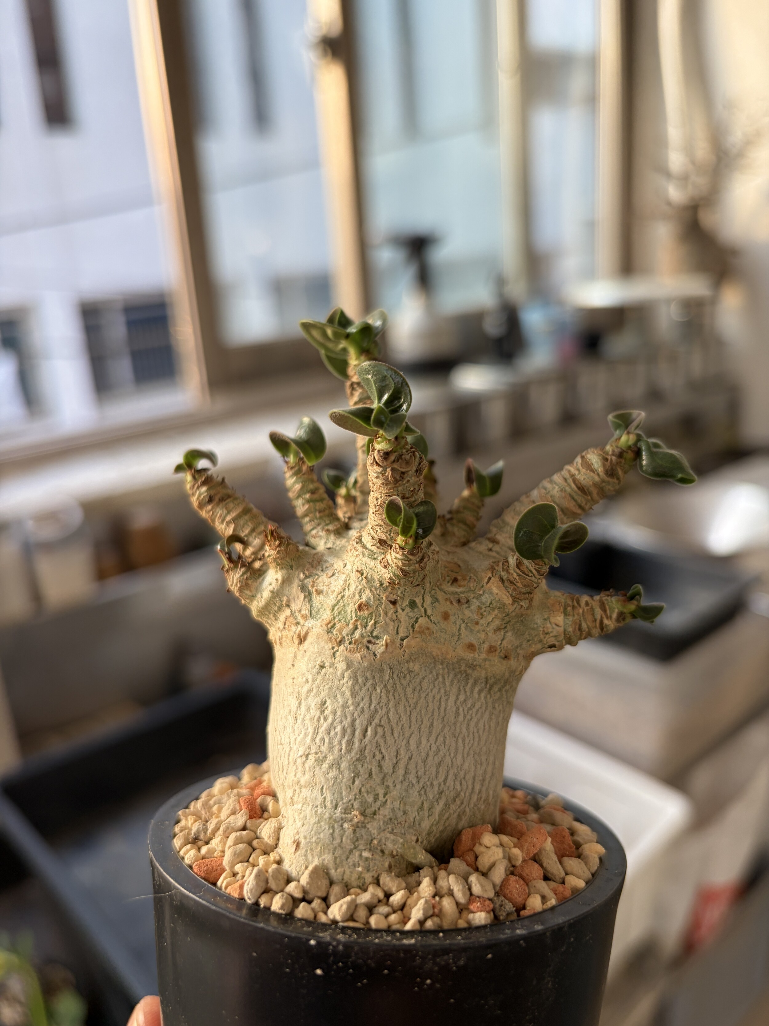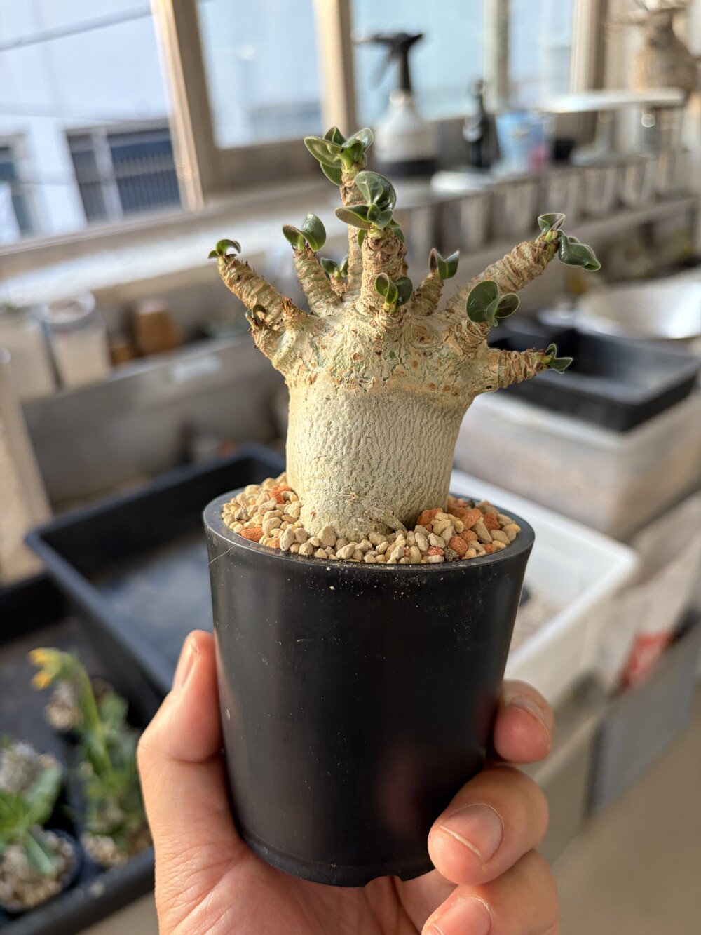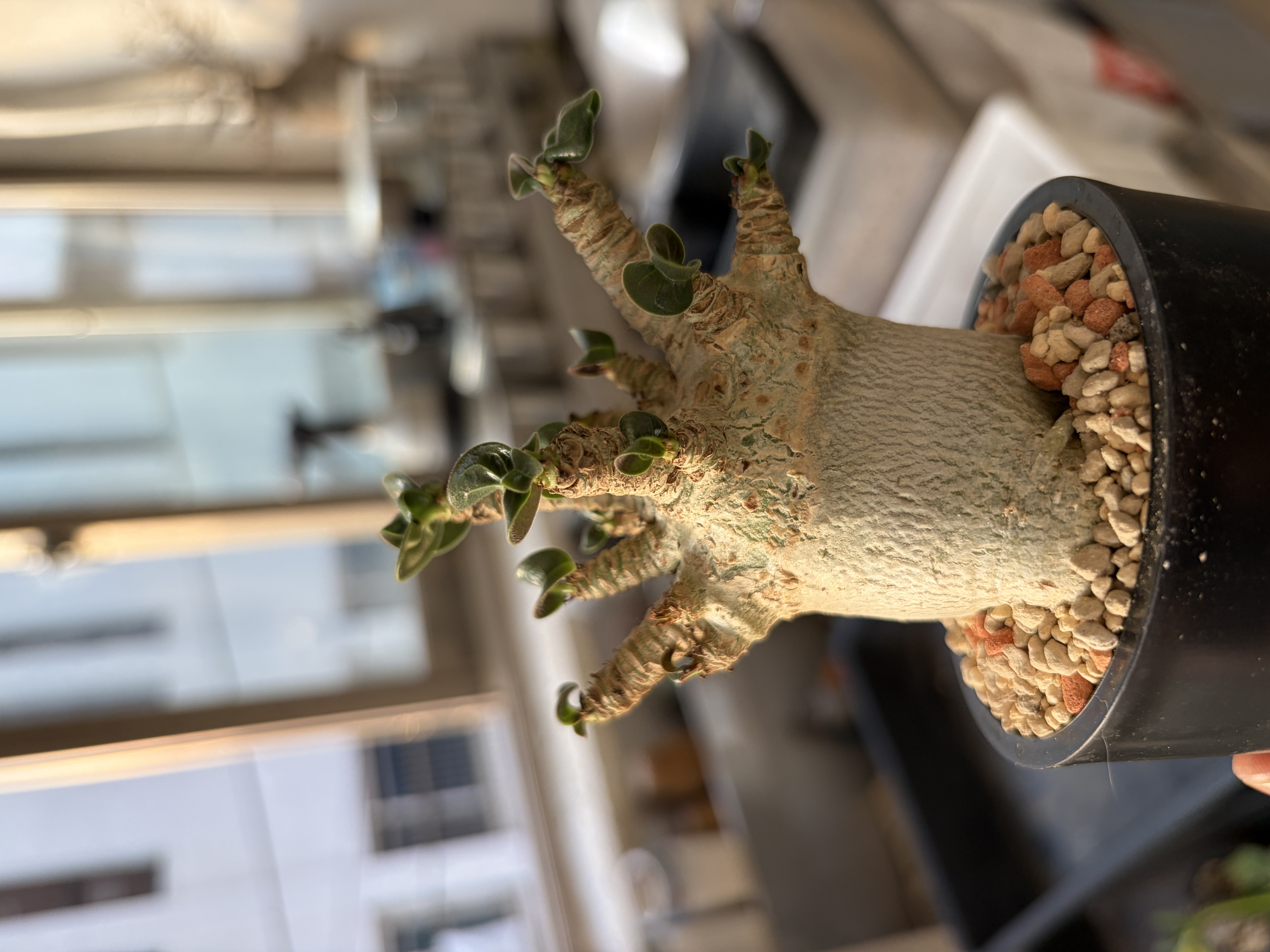 'Caudex' 식물들은 늦가을부터 자연스럽게 잎이 떨어집니다. (환경에 따라 잎이 지지 않을 수 있습니다.) 잎이 떨어지기 시작하면 서서히 물을 줄여나가며 휴면기인 겨울 동안에는 2-3주 1회 가볍게 분무 해주시면 됩니다.