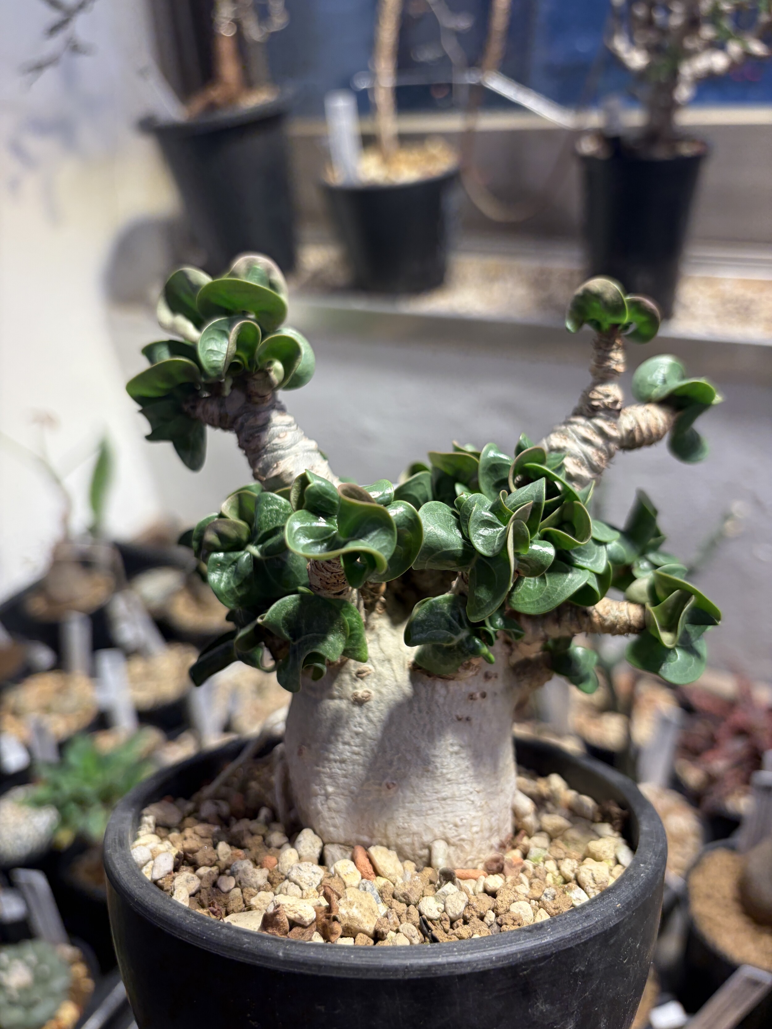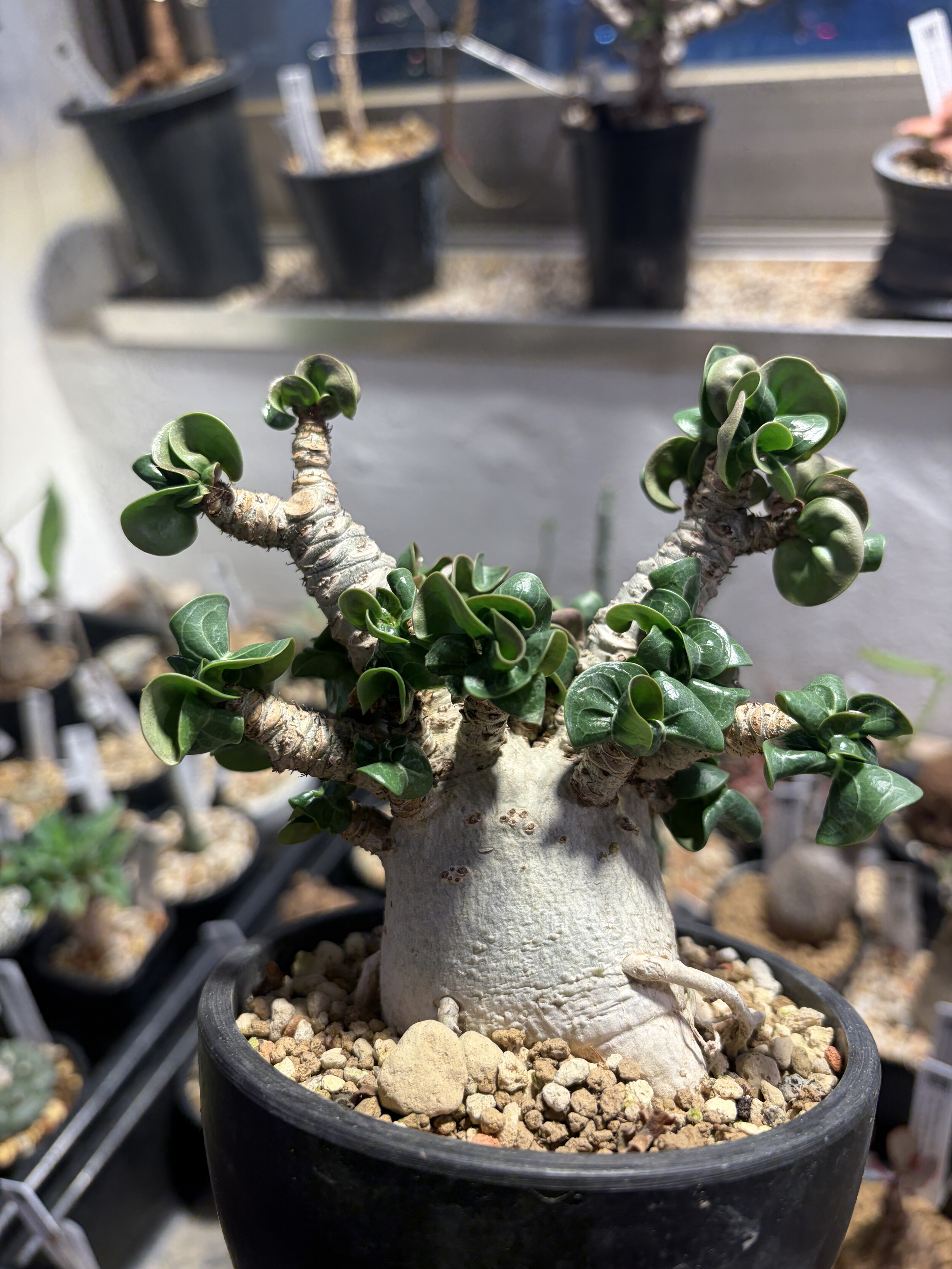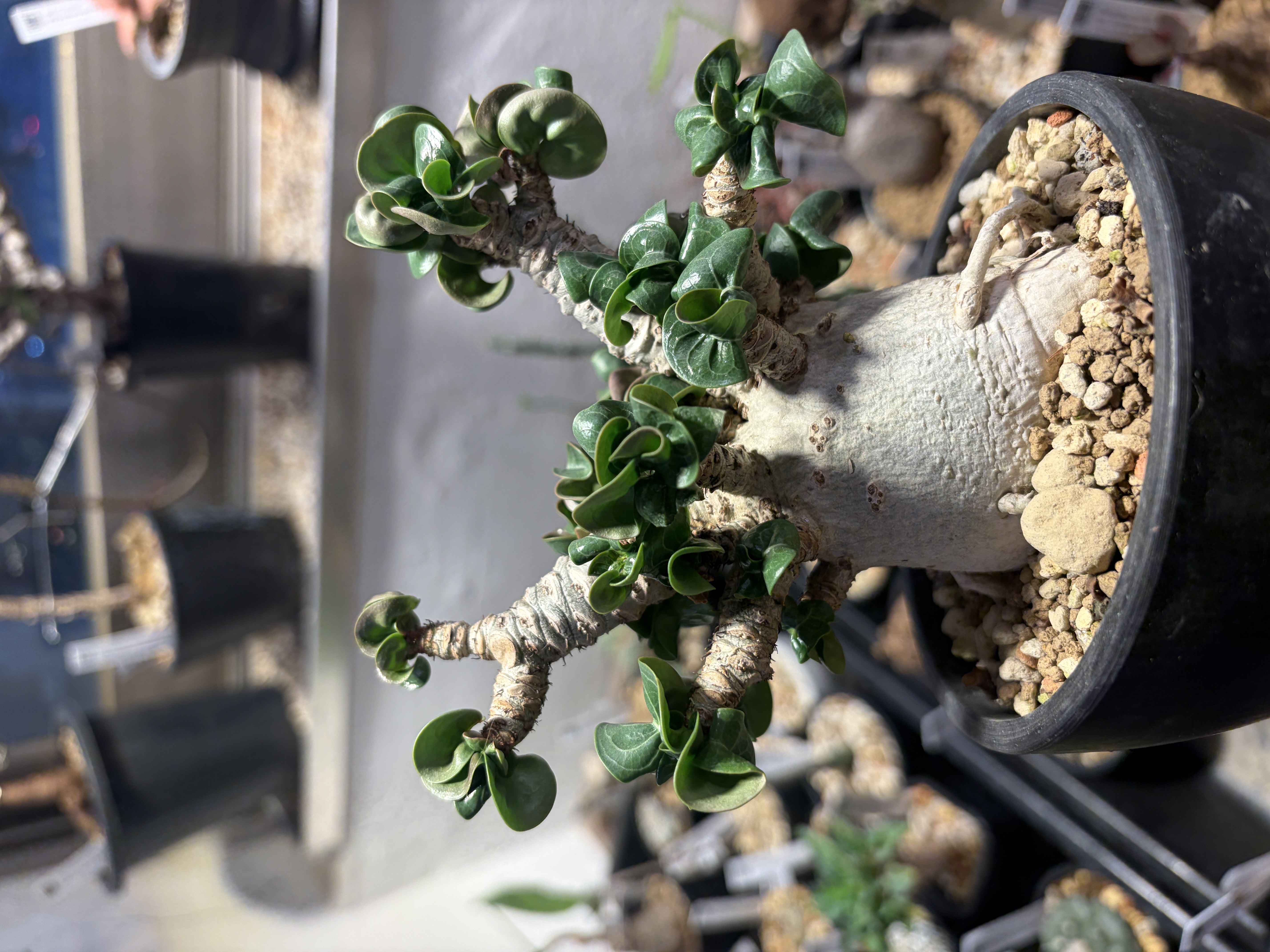 'Caudex' 식물들은 늦가을부터 자연스럽게 잎이 떨어집니다. (환경에 따라 잎이 지지 않을 수 있습니다.) 잎이 떨어지기 시작하면 서서히 물을 줄여나가며 휴면기인 겨울 동안에는 2-3주 1회 가볍게 분무 해주시면 됩니다.