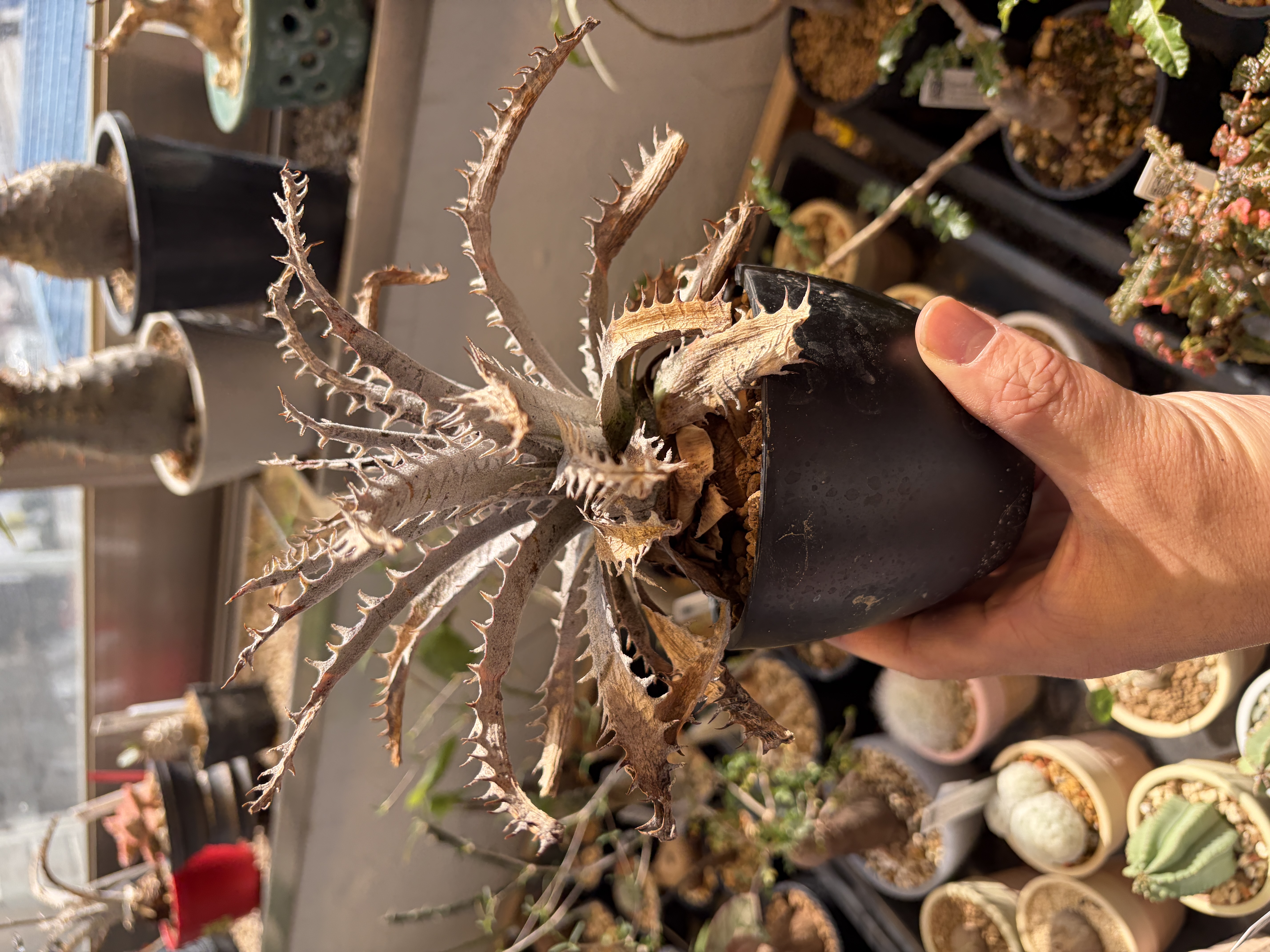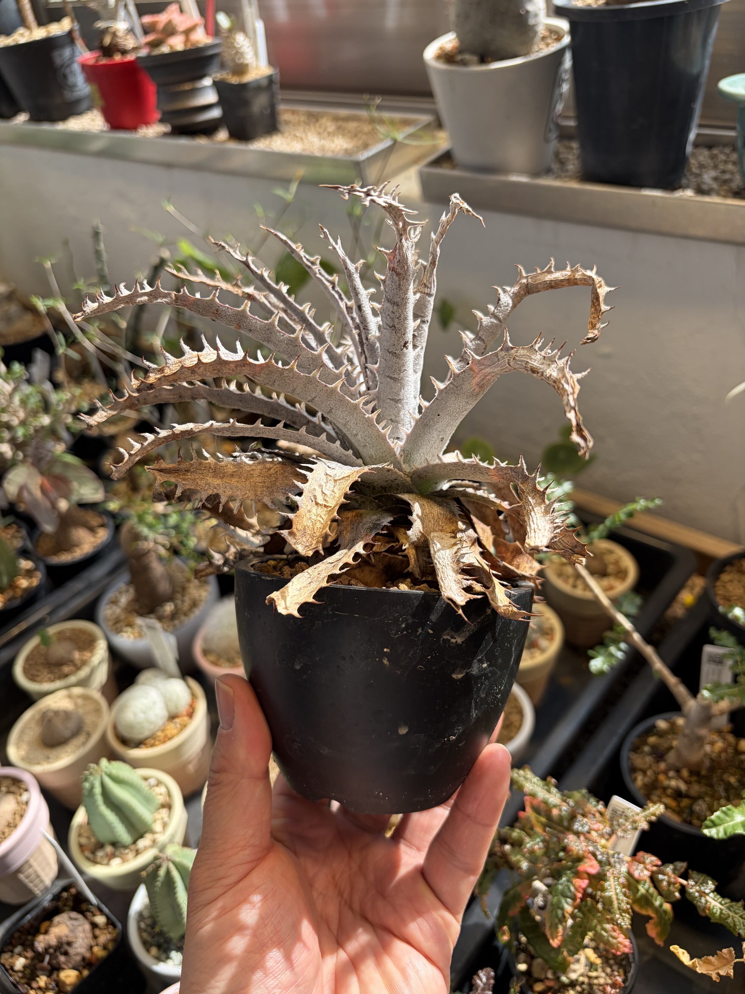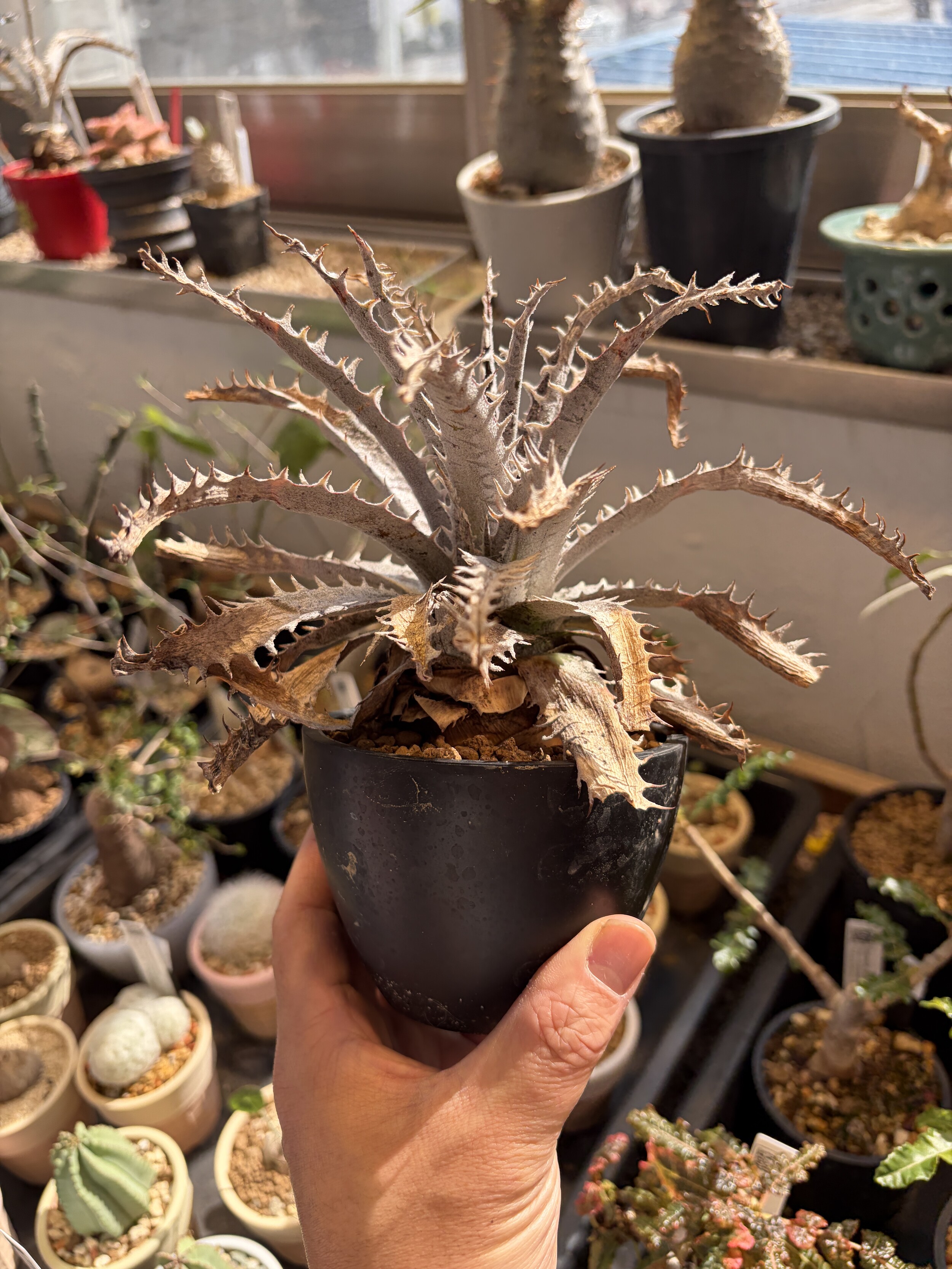 'Caudex' 식물들은 늦가을부터 자연스럽게 잎이 떨어집니다. (환경에 따라 잎이 지지 않을 수 있습니다.) 잎이 떨어지기 시작하면 서서히 물을 줄여나가며 휴면기인 겨울 동안에는 2-3주 1회 가볍게 분무 해주시면 됩니다.