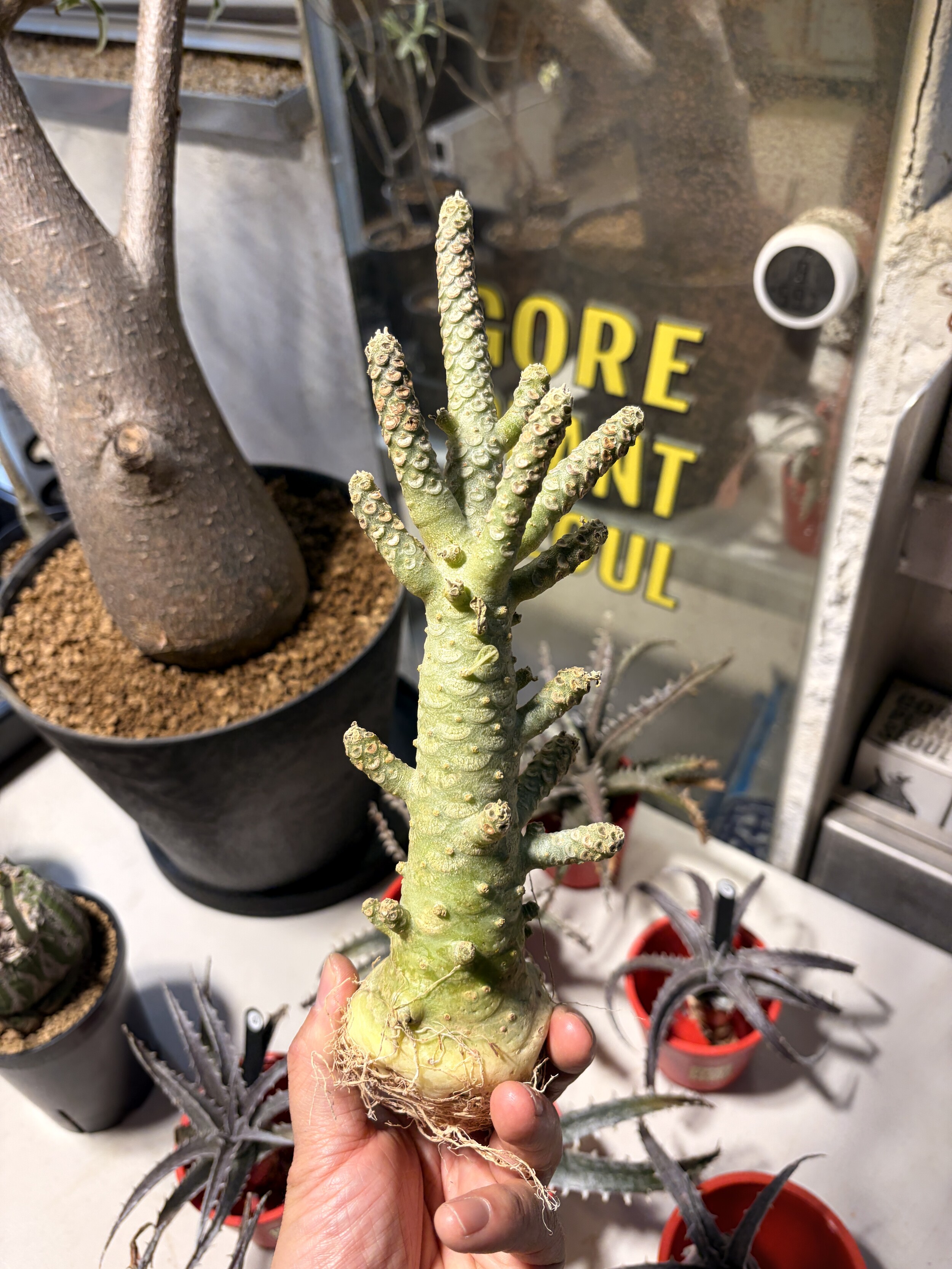 'Caudex' 식물들은 늦가을부터 자연스럽게 잎이 떨어집니다. (환경에 따라 잎이 지지 않을 수 있습니다.) 잎이 떨어지기 시작하면 서서히 물을 줄여나가며 휴면기인 겨울 동안에는 2-3주 1회 가볍게 분무 해주시면 됩니다.