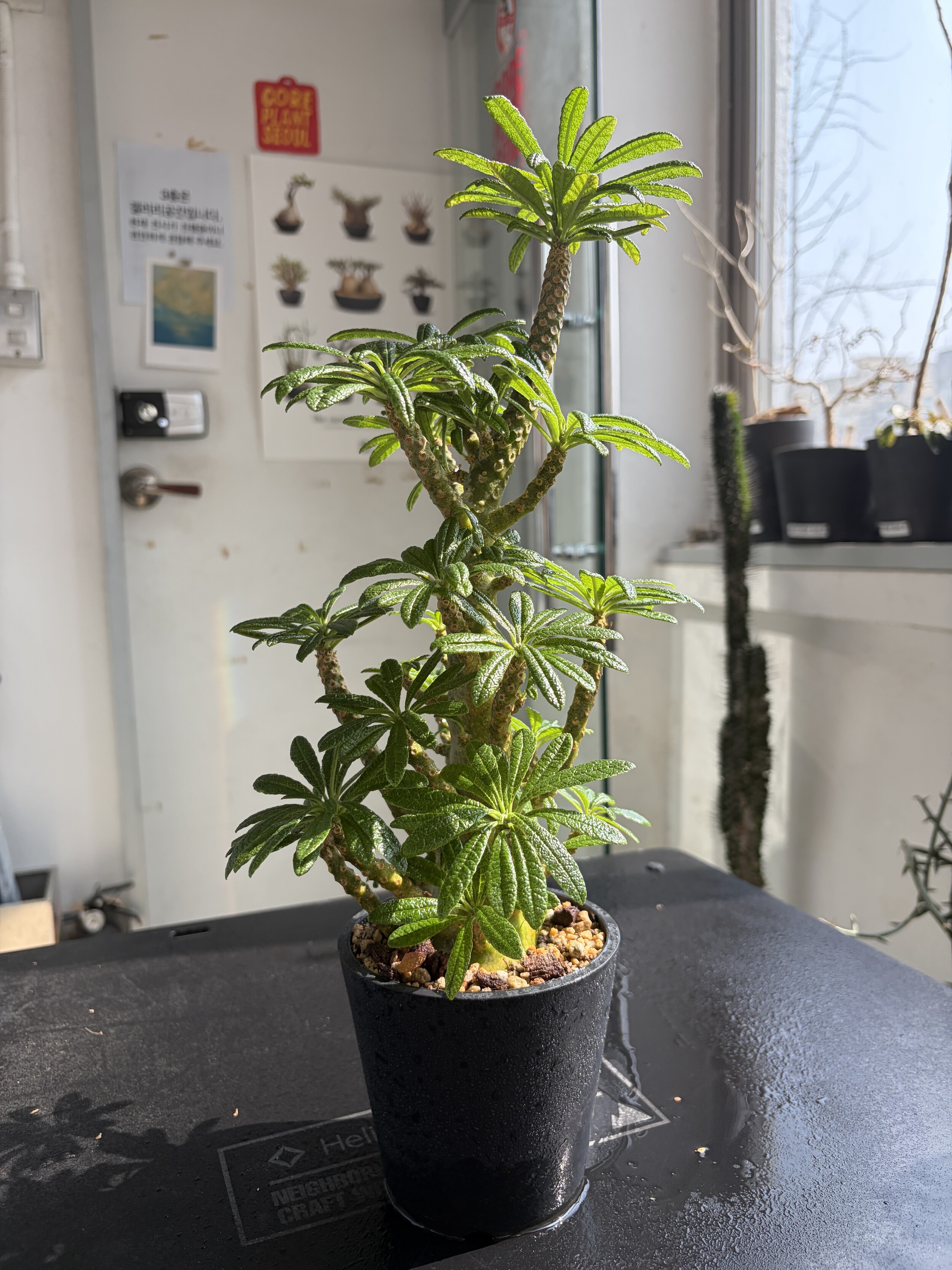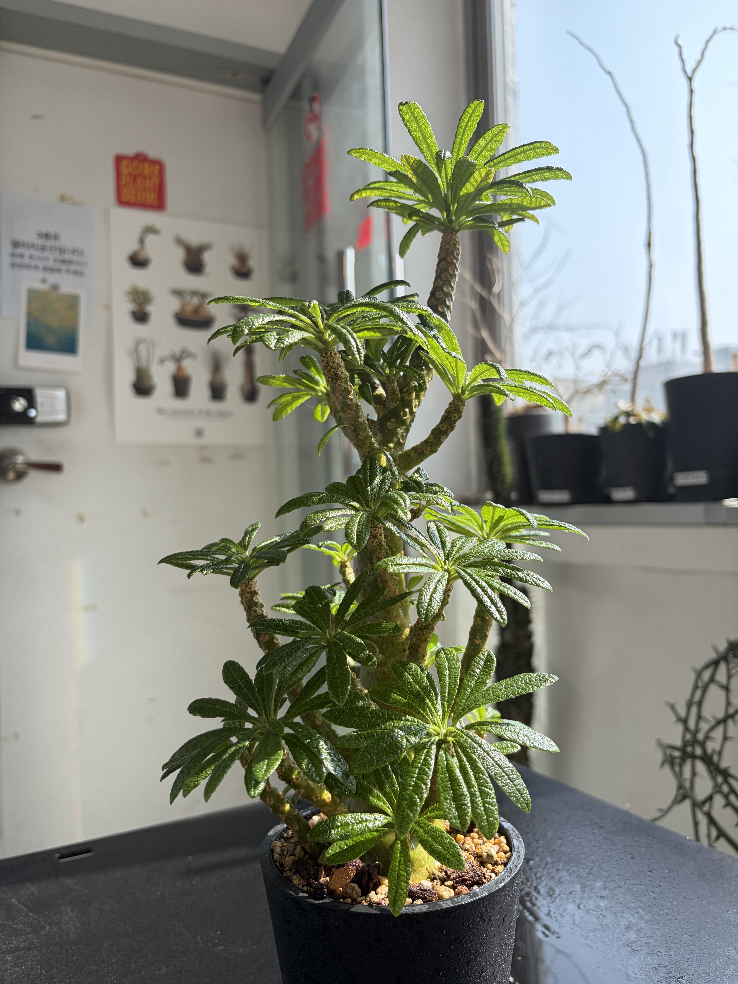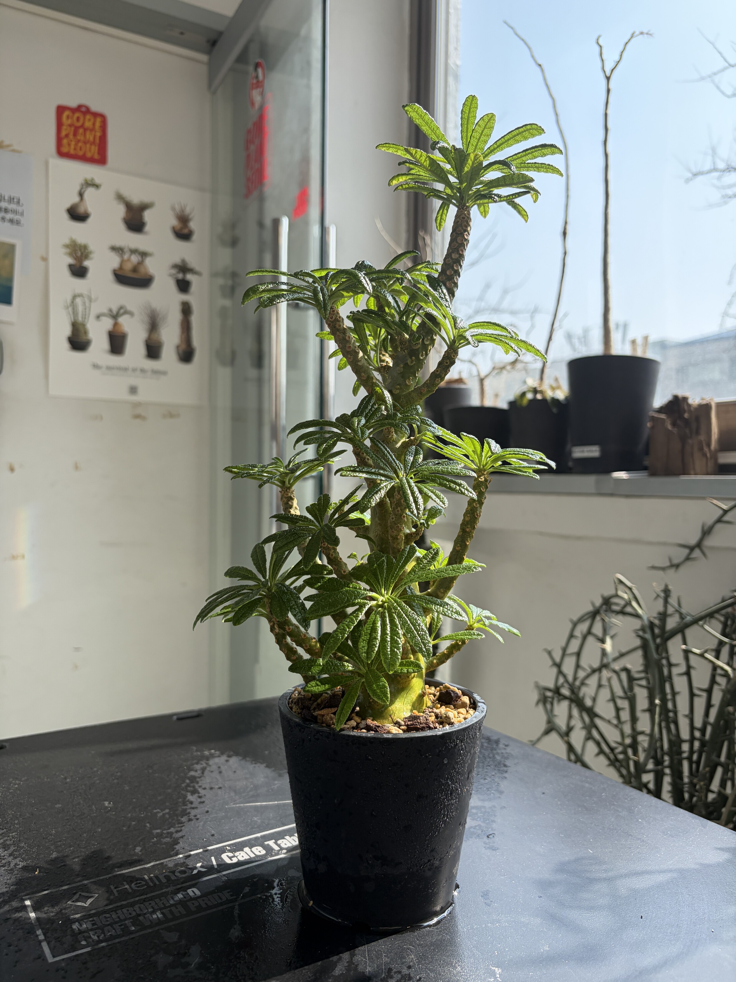 'Caudex' 식물들은 늦가을부터 자연스럽게 잎이 떨어집니다. (환경에 따라 잎이 지지 않을 수 있습니다.) 잎이 떨어지기 시작하면 서서히 물을 줄여나가며 휴면기인 겨울 동안에는 2-3주 1회 가볍게 분무 해주시면 됩니다.