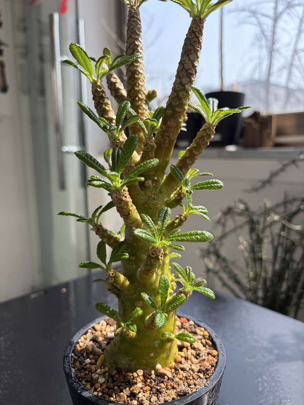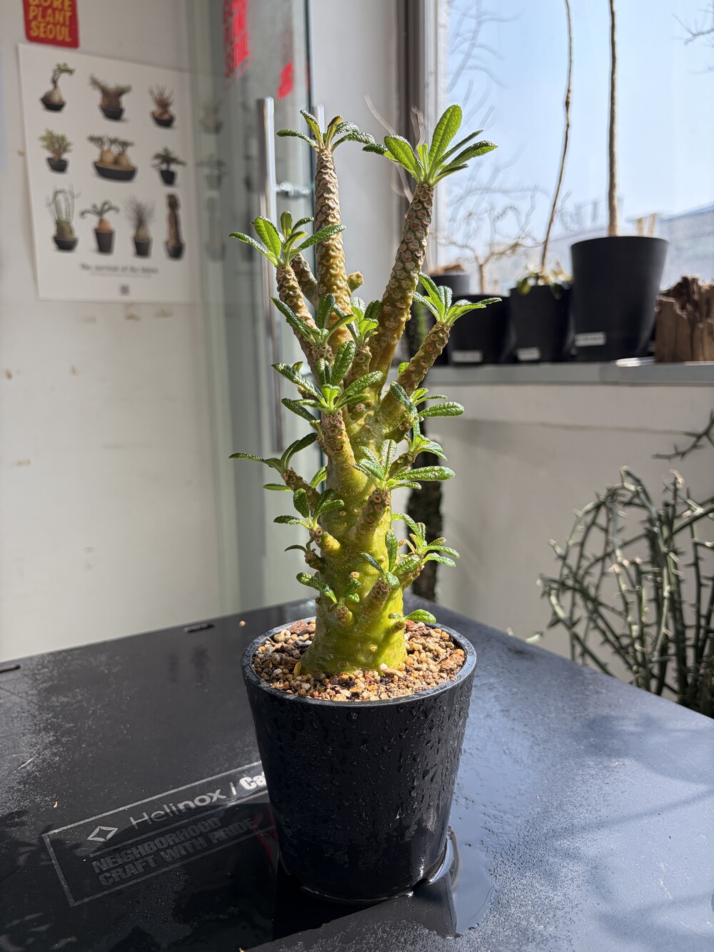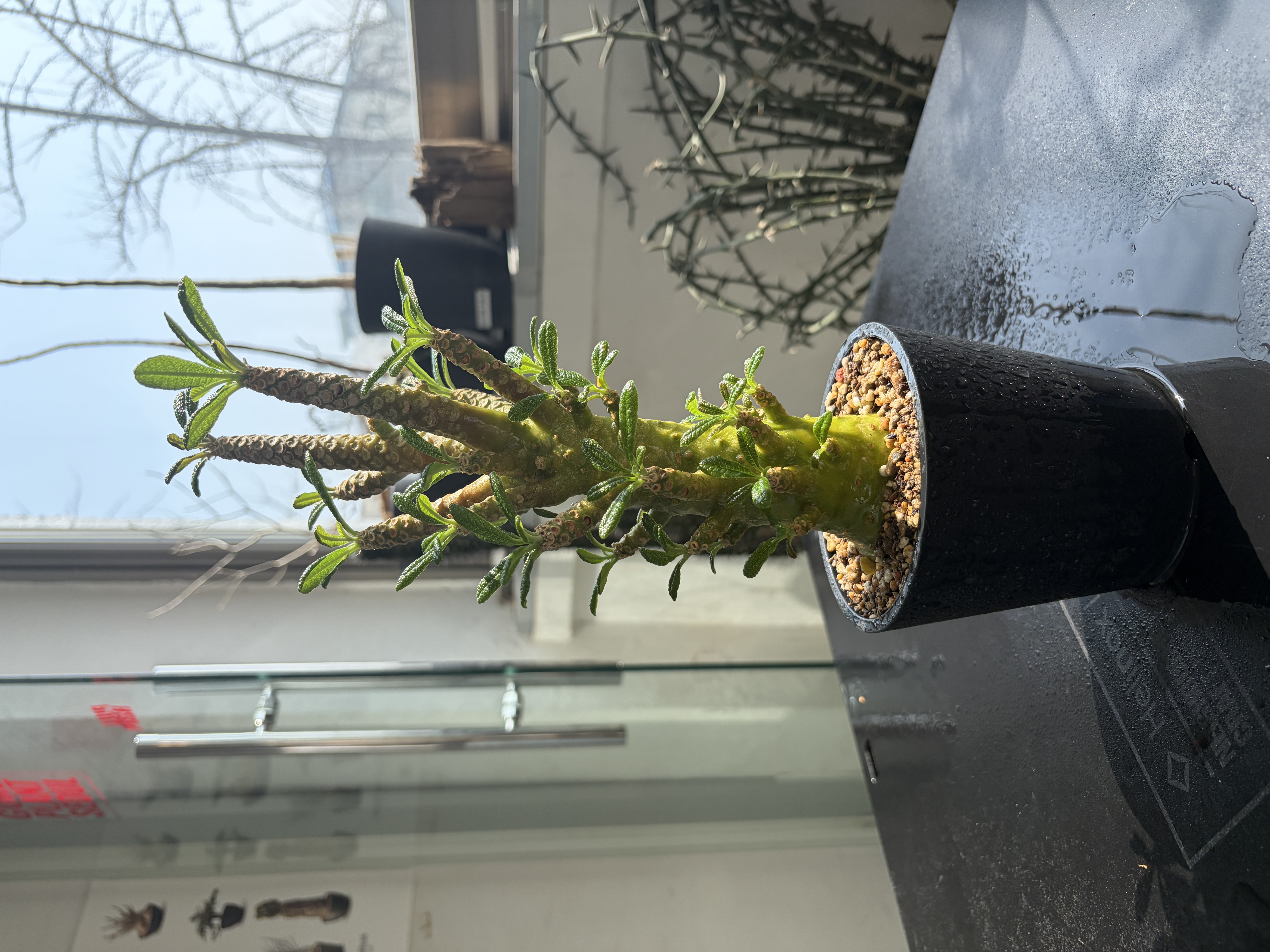 'Caudex' 식물들은 늦가을부터 자연스럽게 잎이 떨어집니다. (환경에 따라 잎이 지지 않을 수 있습니다.) 잎이 떨어지기 시작하면 서서히 물을 줄여나가며 휴면기인 겨울 동안에는 2-3주 1회 가볍게 분무 해주시면 됩니다.