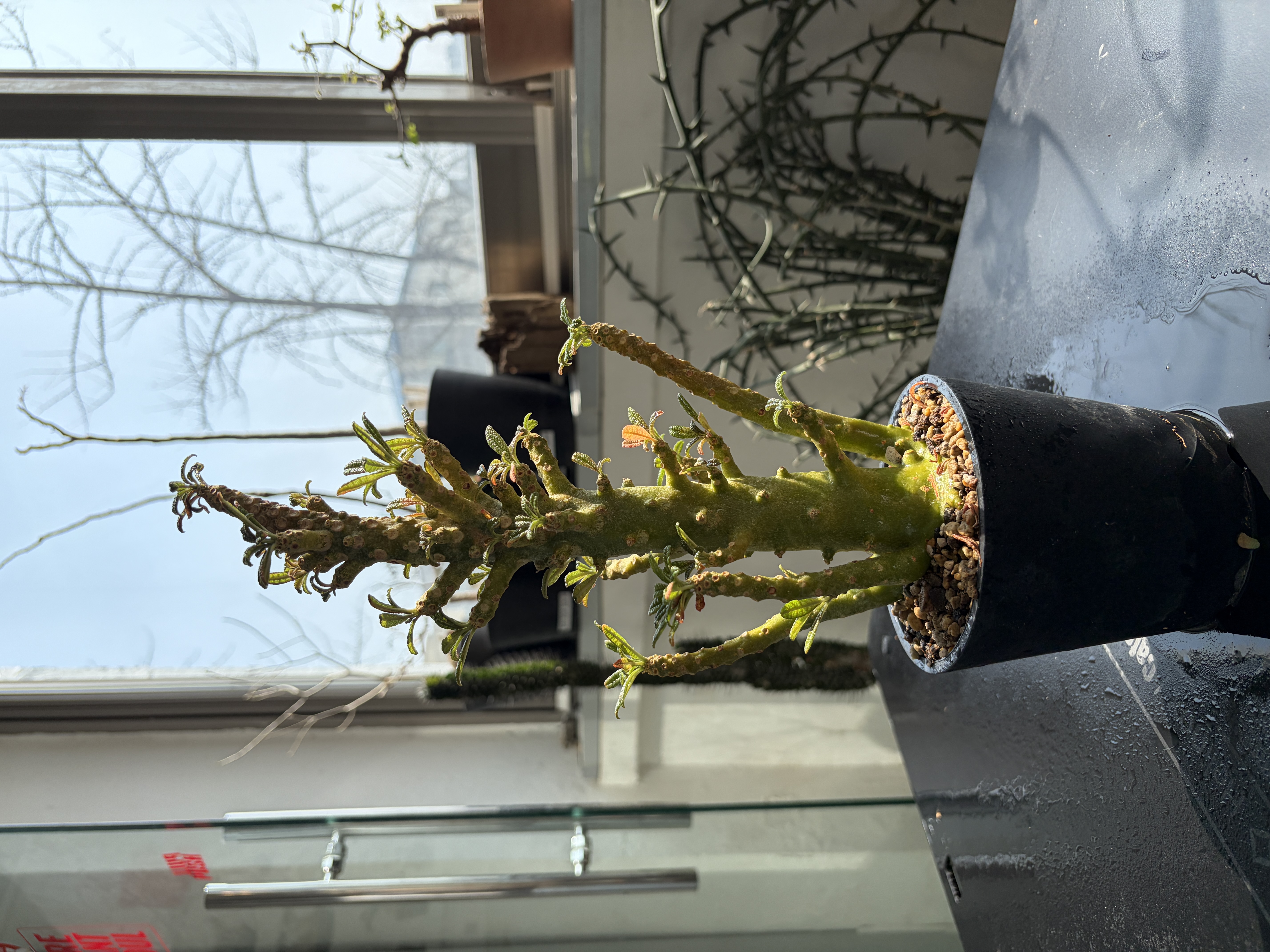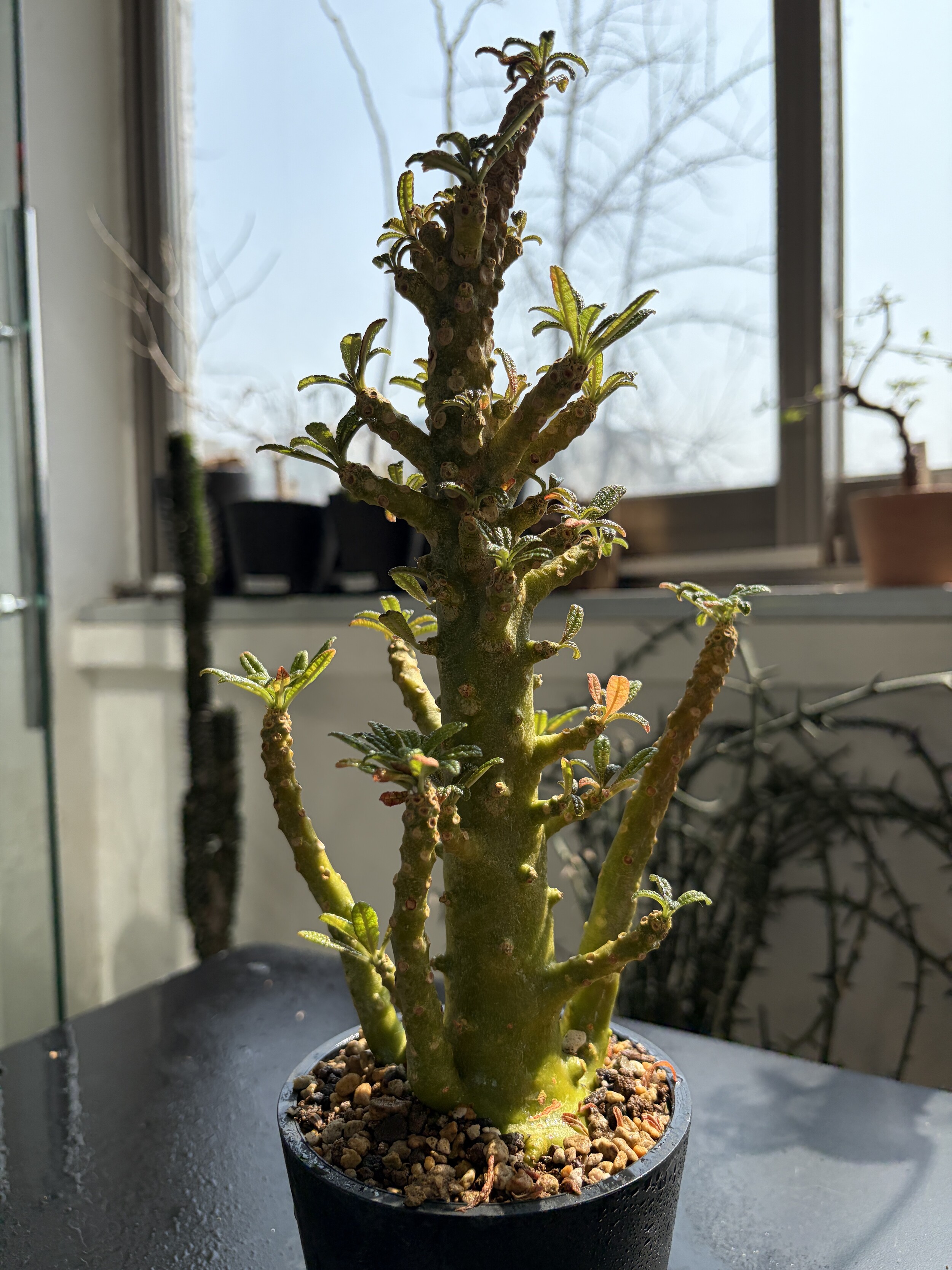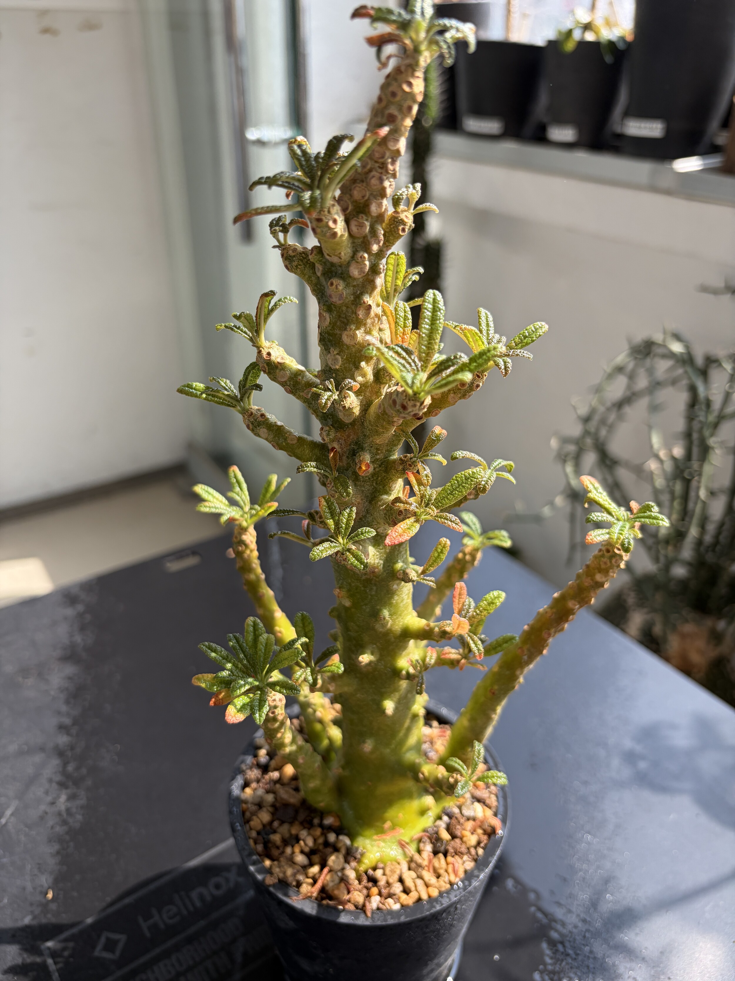 'Caudex' 식물들은 늦가을부터 자연스럽게 잎이 떨어집니다. (환경에 따라 잎이 지지 않을 수 있습니다.) 잎이 떨어지기 시작하면 서서히 물을 줄여나가며 휴면기인 겨울 동안에는 2-3주 1회 가볍게 분무 해주시면 됩니다.