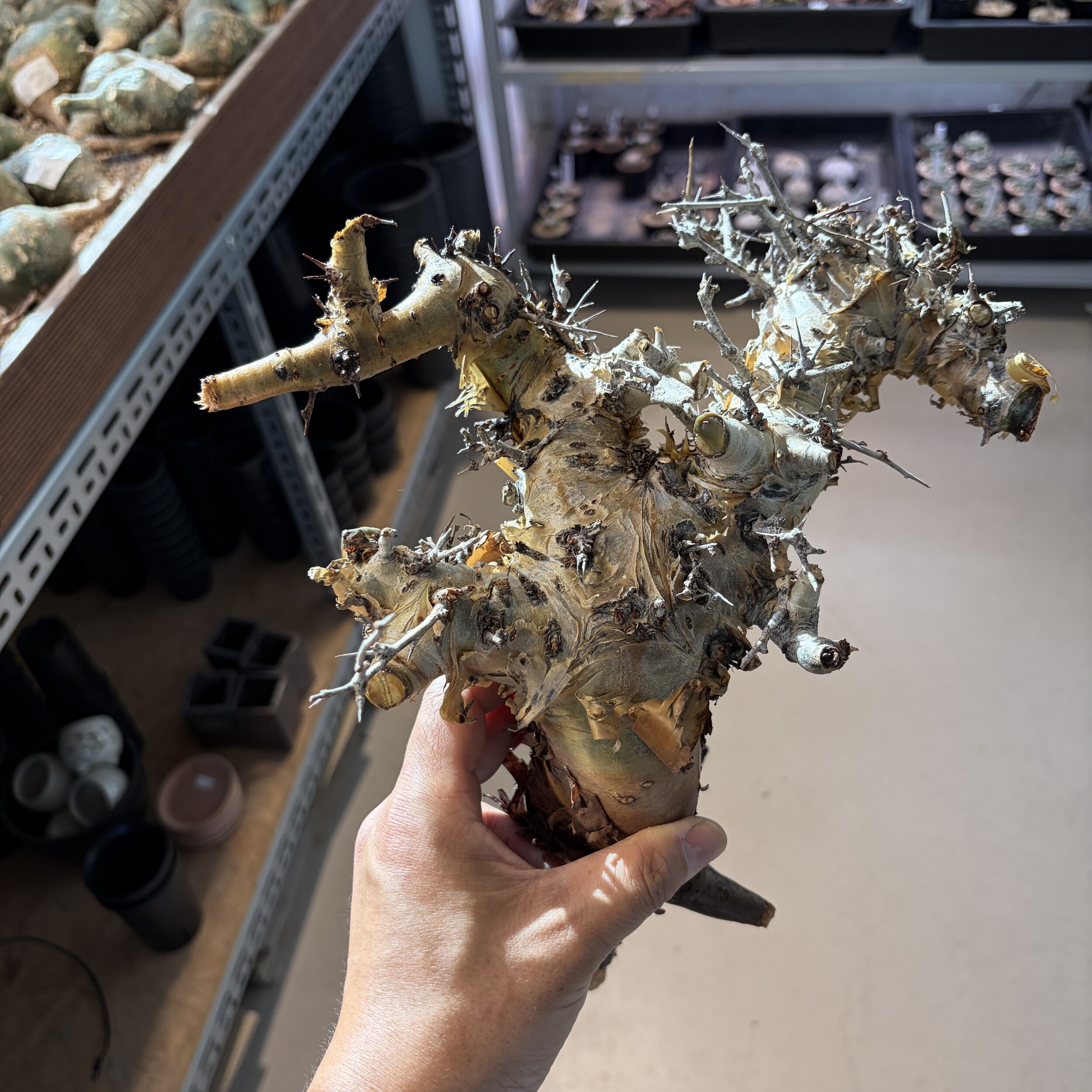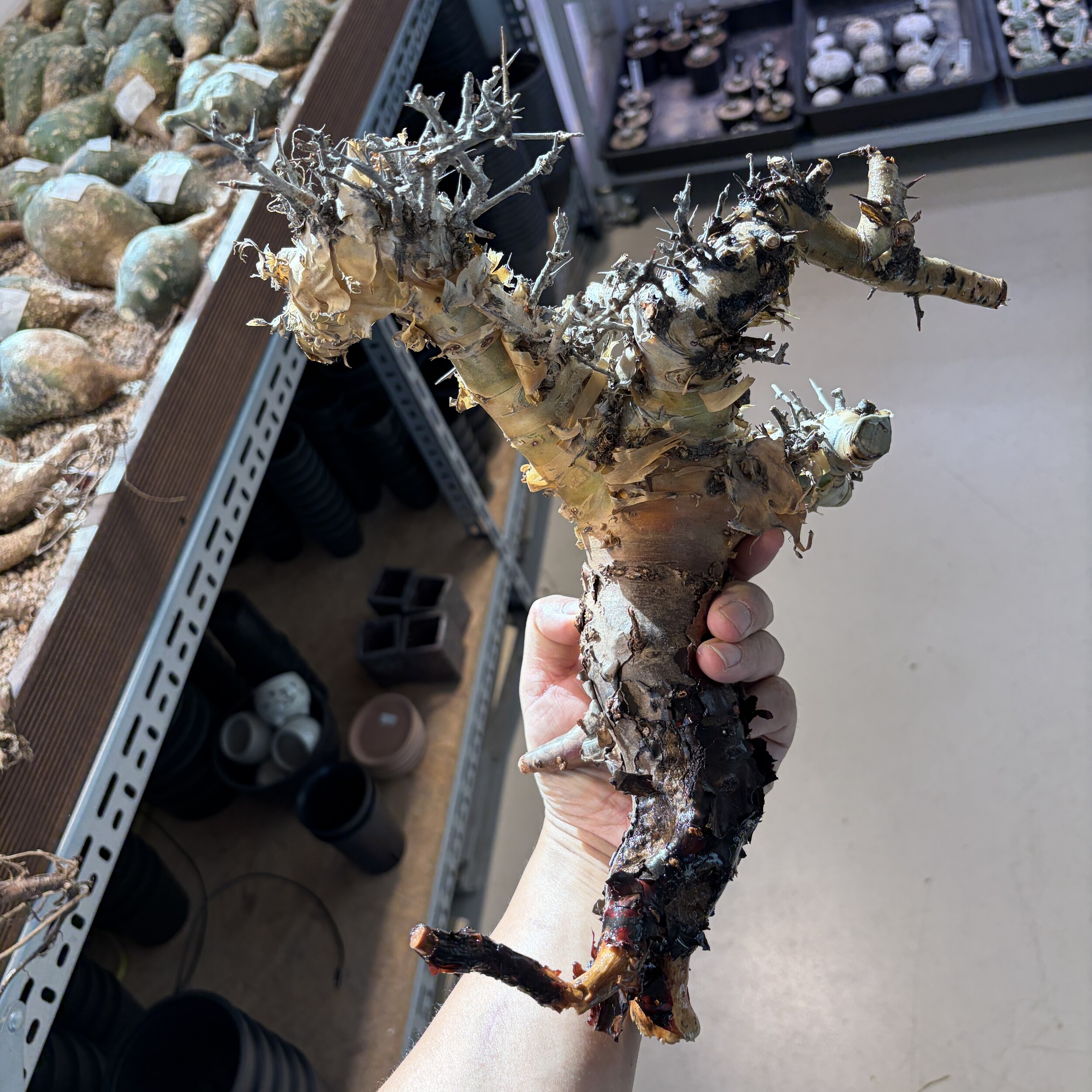 'Caudex' 식물들은 늦가을부터 자연스럽게 잎이 떨어집니다. (환경에 따라 잎이 지지 않을 수 있습니다.) 잎이 떨어지기 시작하면 서서히 물을 줄여나가며 휴면기인 겨울 동안에는 2-3주 1회 가볍게 분무 해주시면 됩니다.