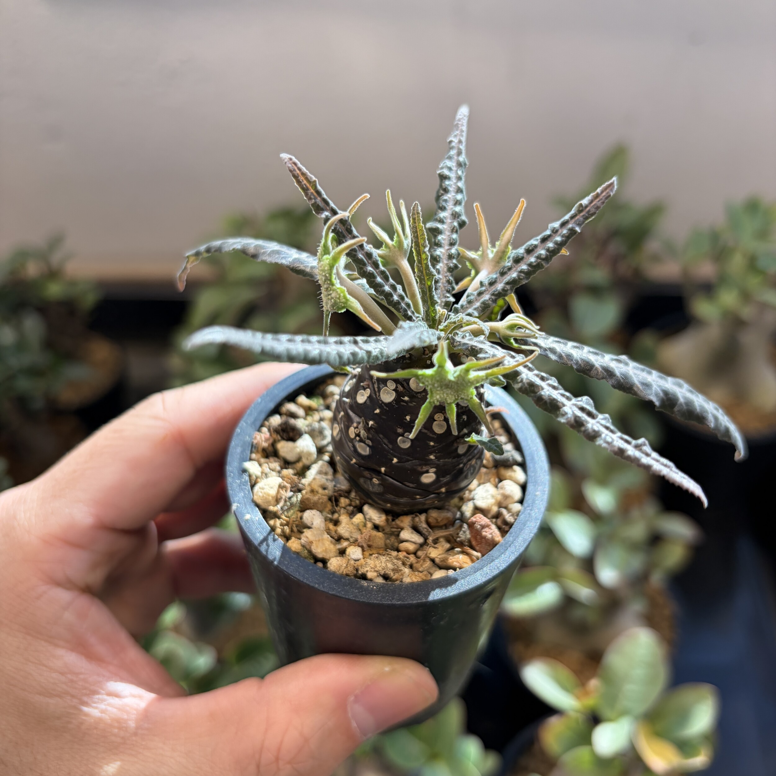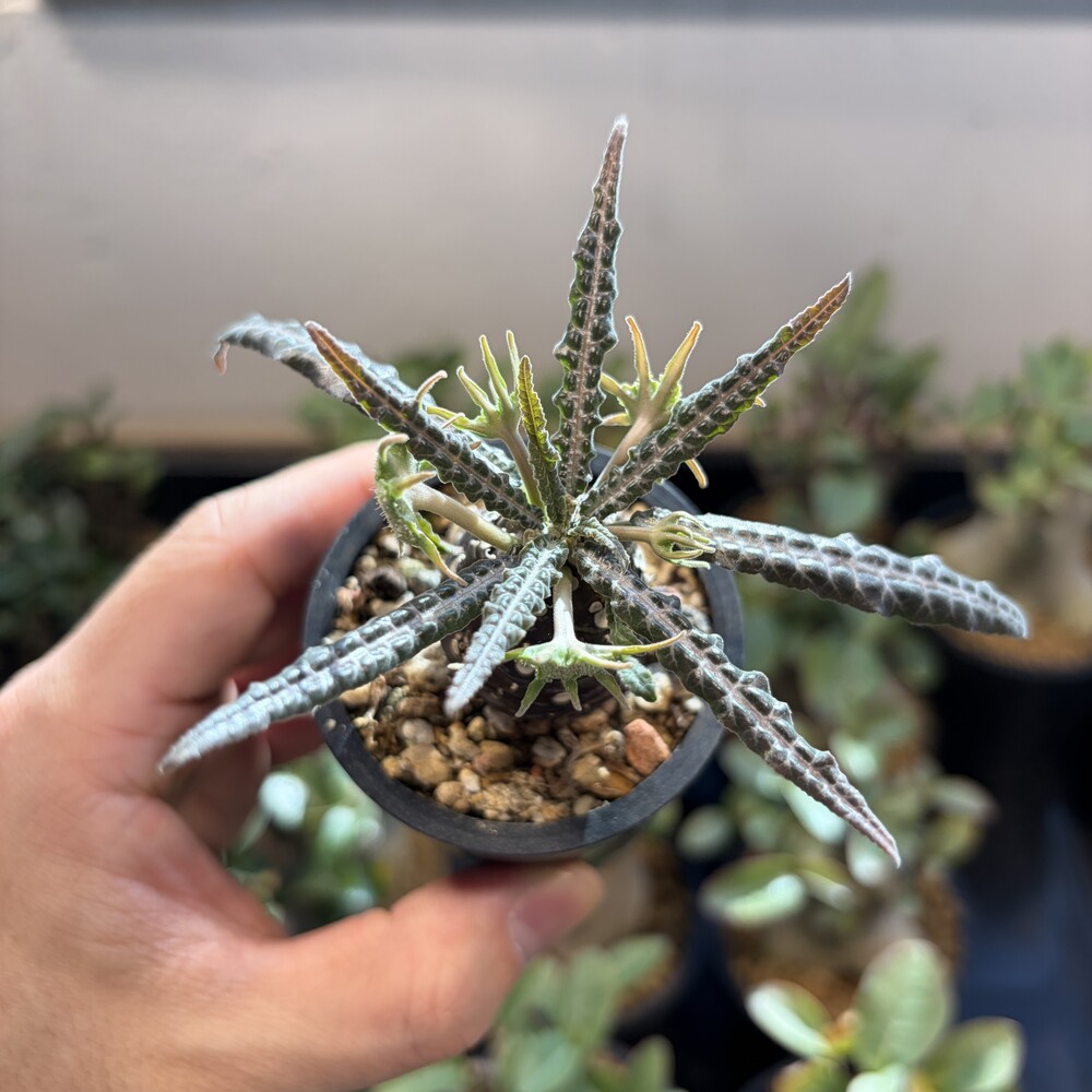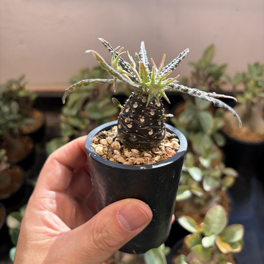 'Caudex' 식물들은 늦가을부터 자연스럽게 잎이 떨어집니다. (환경에 따라 잎이 지지 않을 수 있습니다.) 잎이 떨어지기 시작하면 서서히 물을 줄여나가며 휴면기인 겨울 동안에는 2-3주 1회 가볍게 분무 해주시면 됩니다.