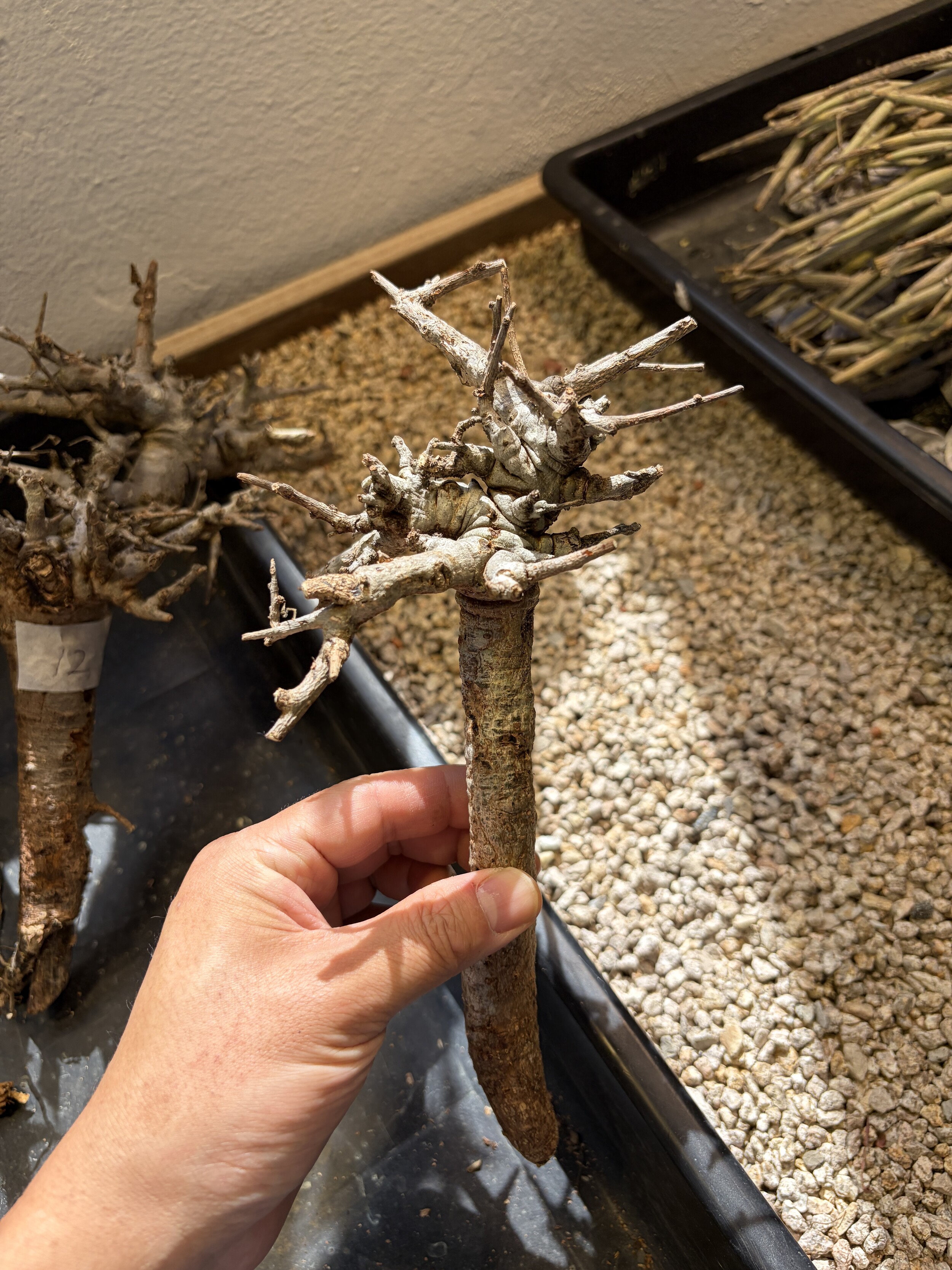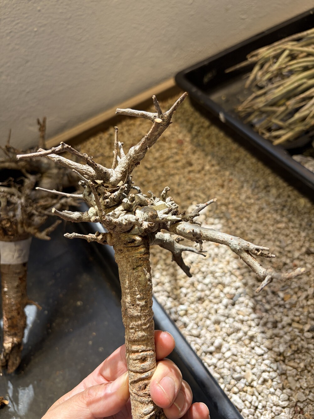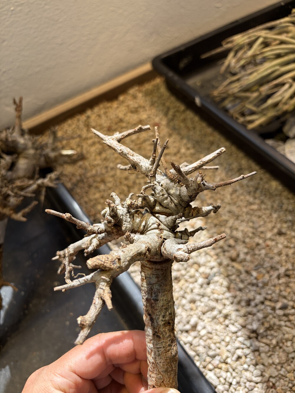 'Caudex' 식물들은 늦가을부터 자연스럽게 잎이 떨어집니다. (환경에 따라 잎이 지지 않을 수 있습니다.) 잎이 떨어지기 시작하면 서서히 물을 줄여나가며 휴면기인 겨울 동안에는 2-3주 1회 가볍게 분무 해주시면 됩니다.