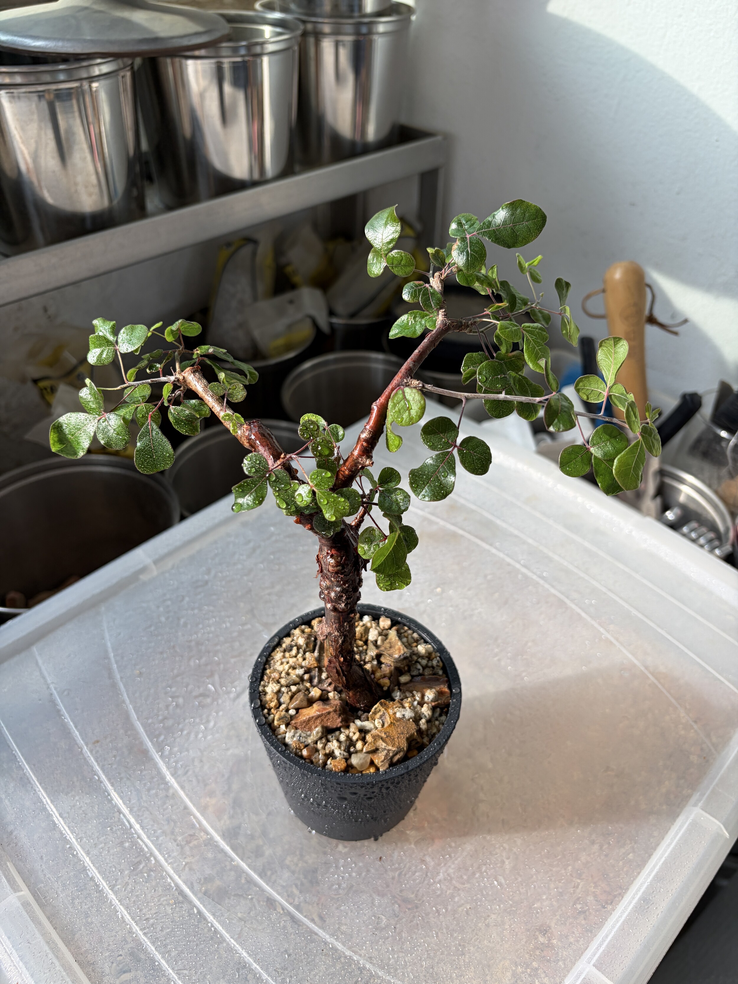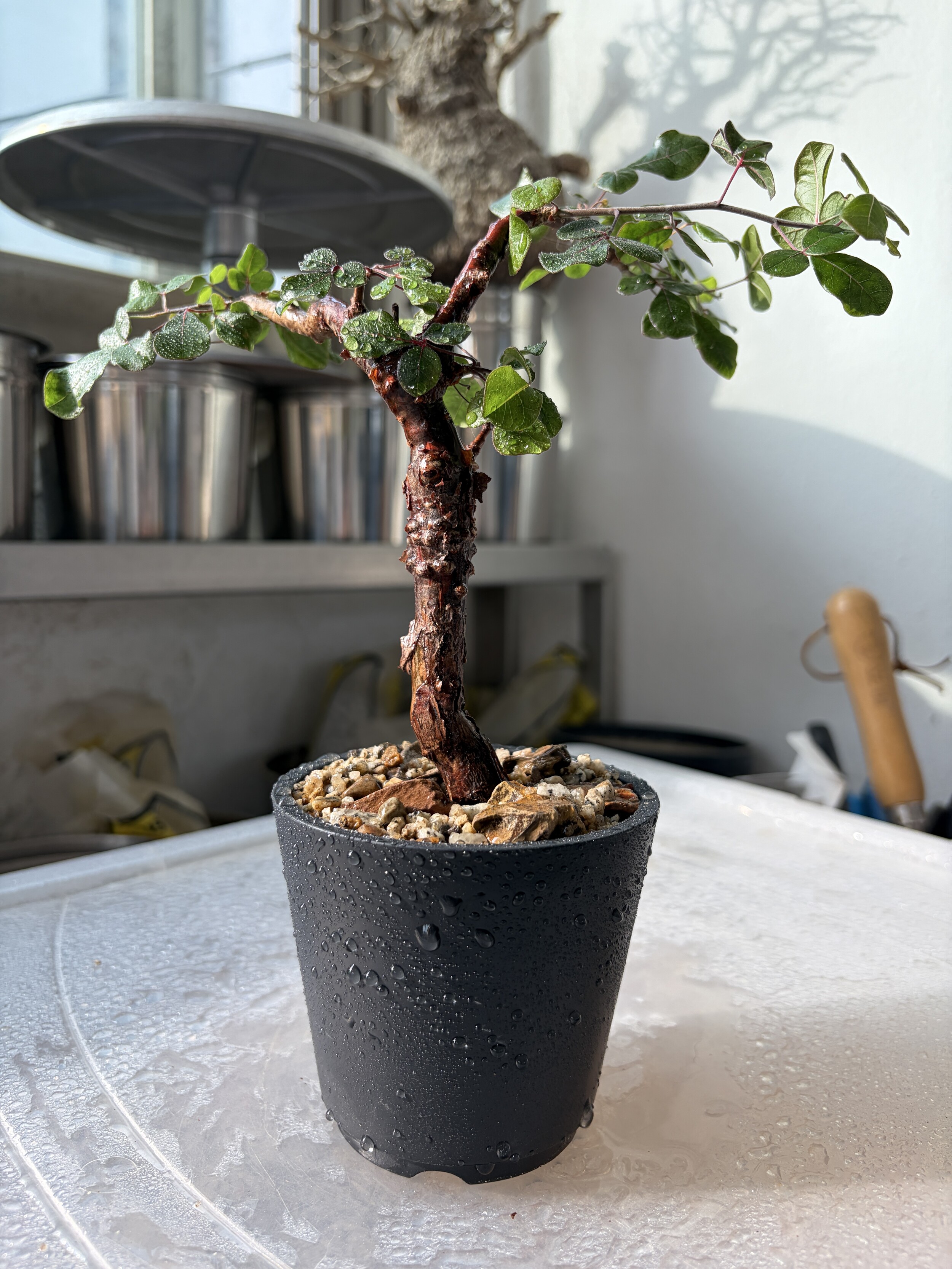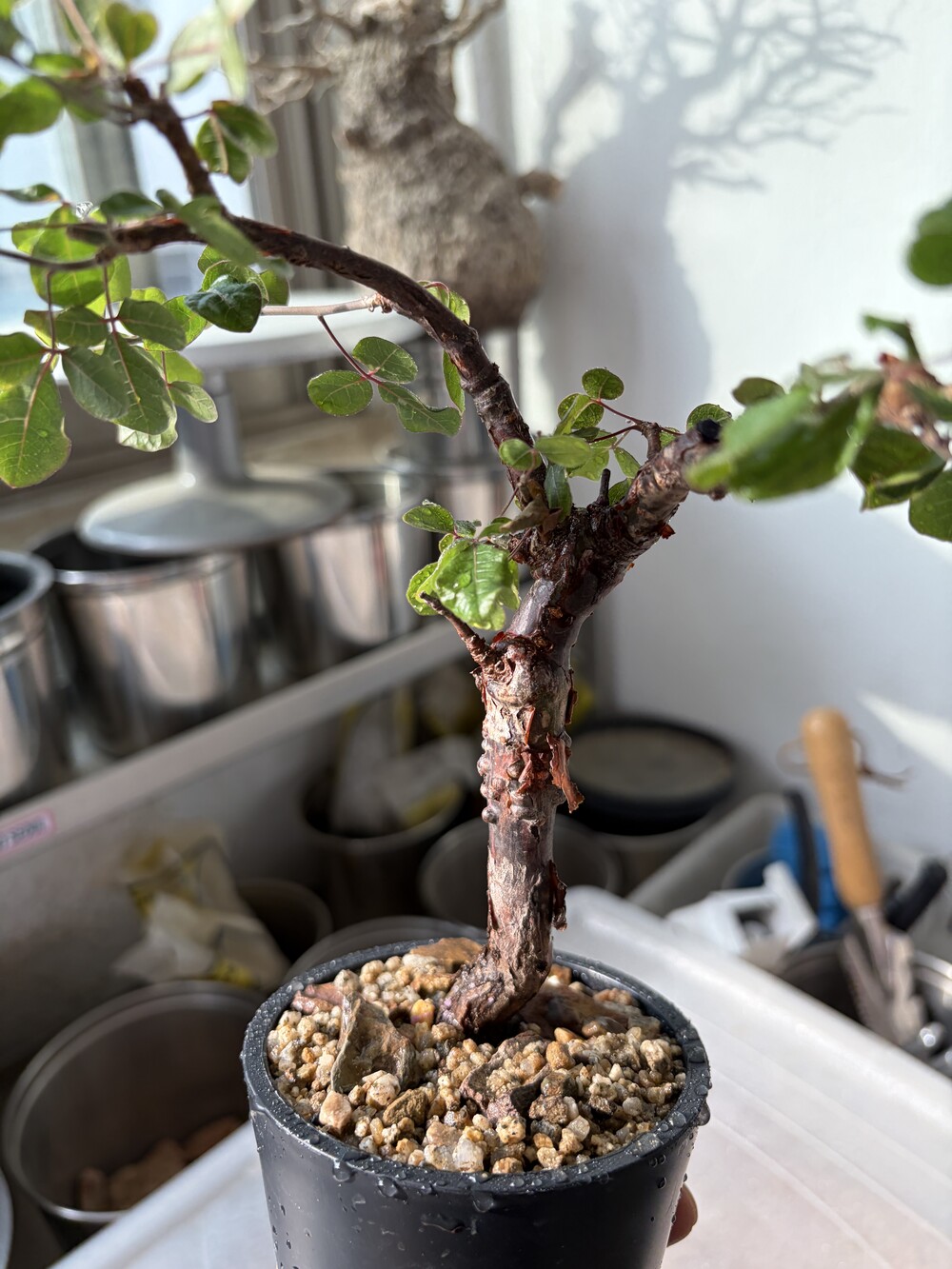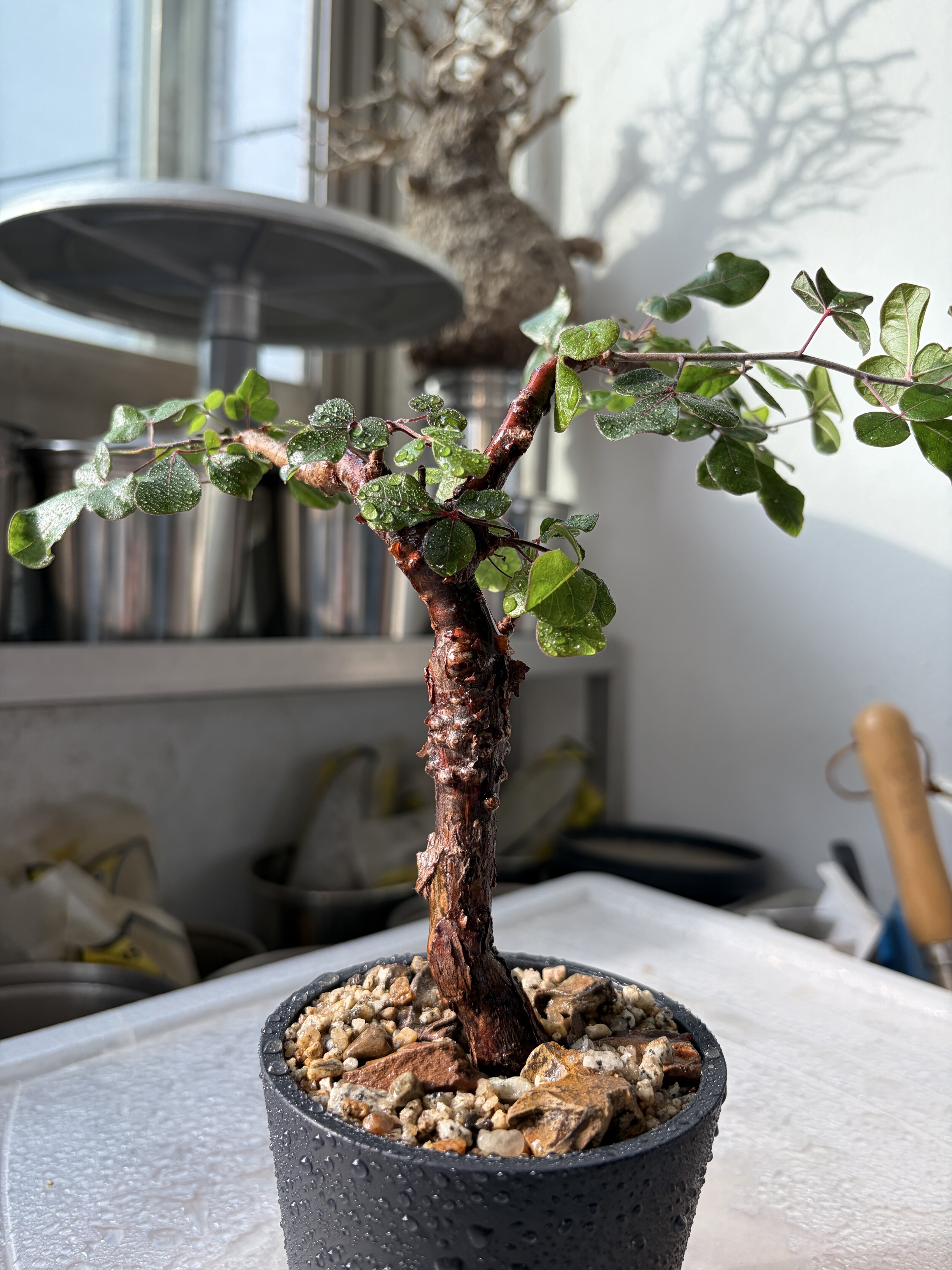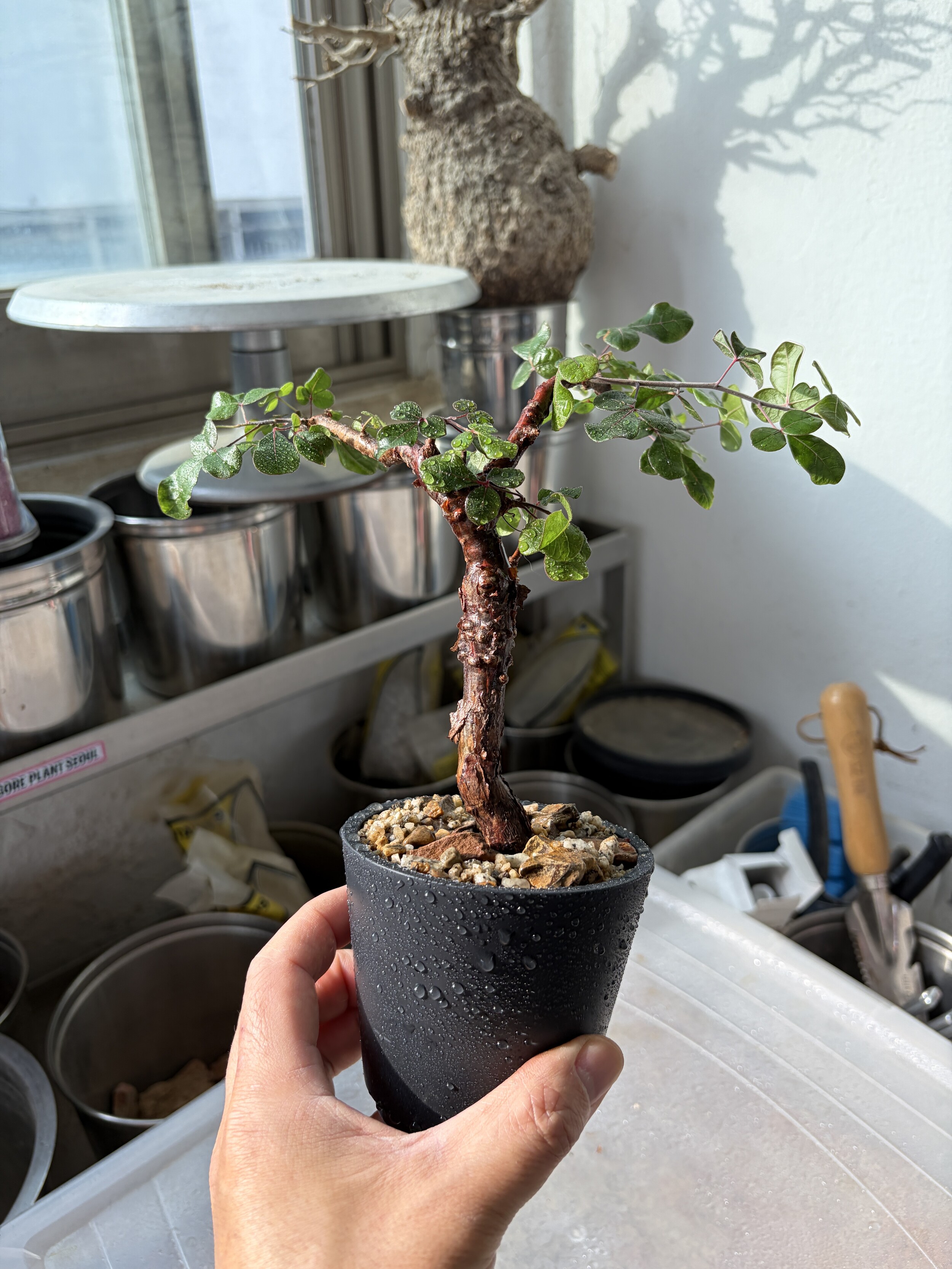 'Caudex' 식물들은 늦가을부터 자연스럽게 잎이 떨어집니다. (환경에 따라 잎이 지지 않을 수 있습니다.) 잎이 떨어지기 시작하면 서서히 물을 줄여나가며 휴면기인 겨울 동안에는 2-3주 1회 가볍게 분무 해주시면 됩니다.
