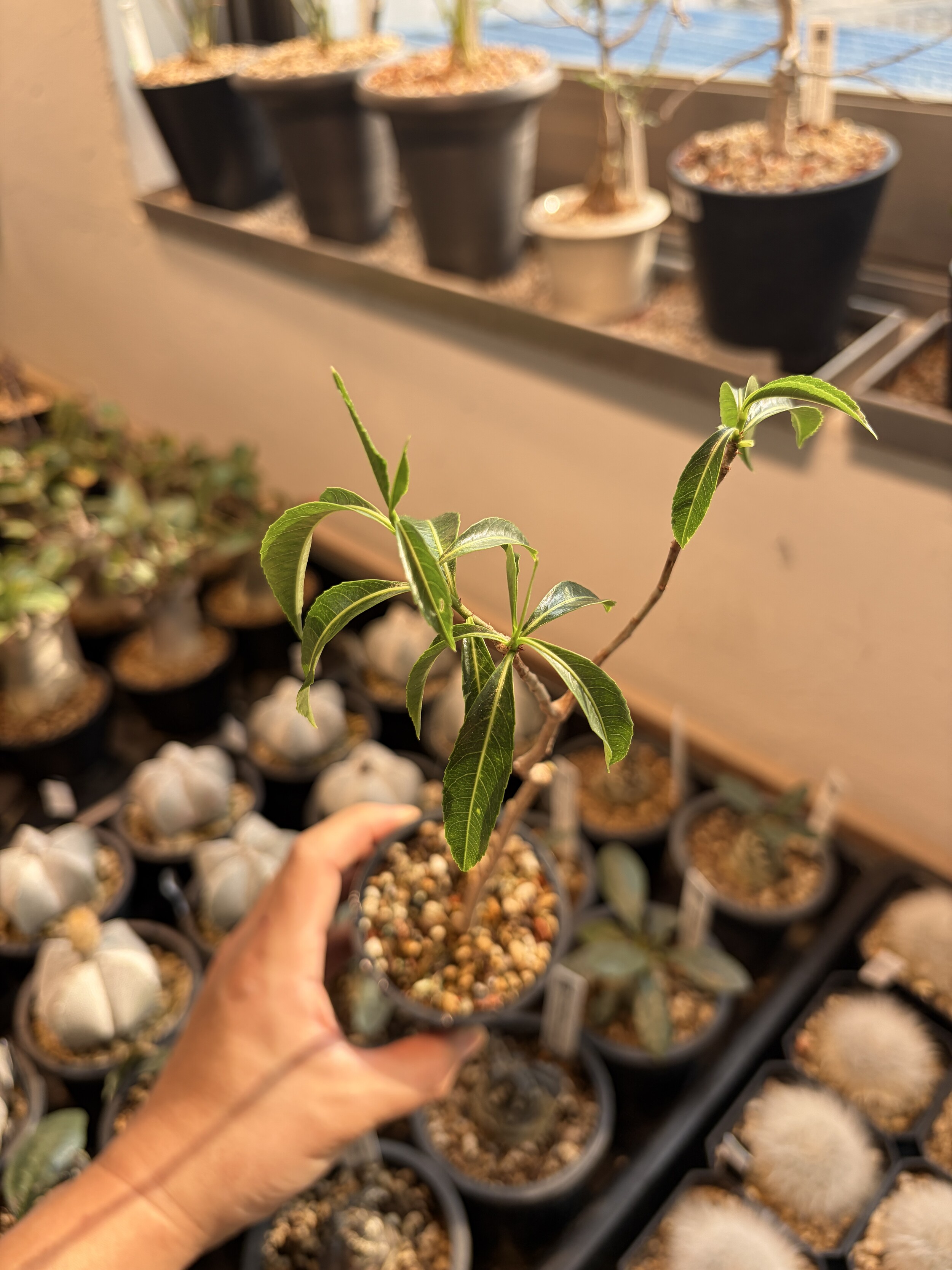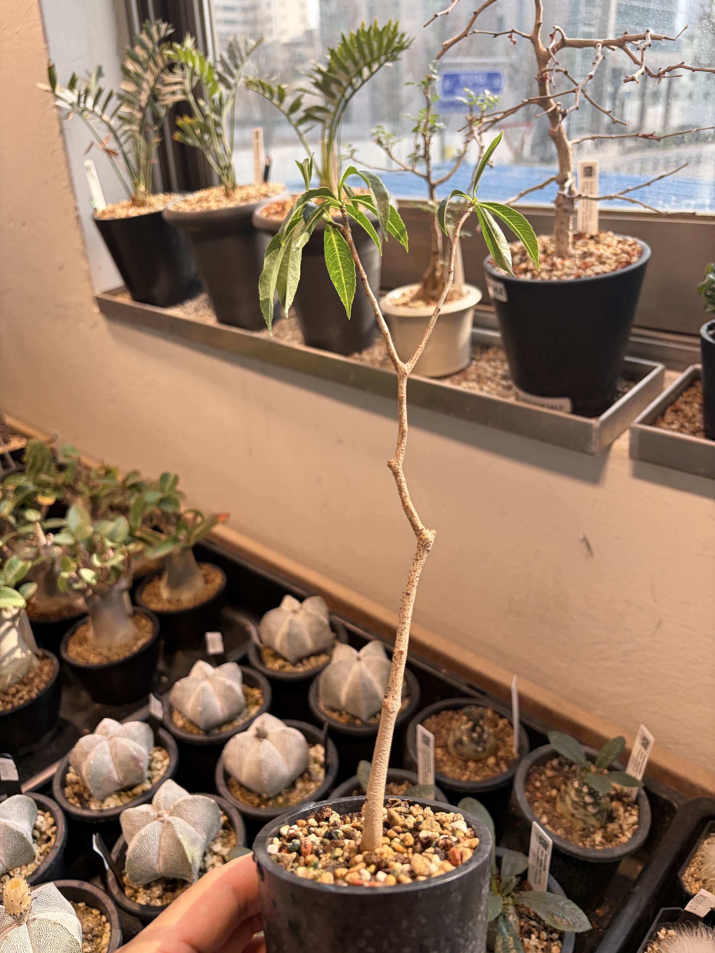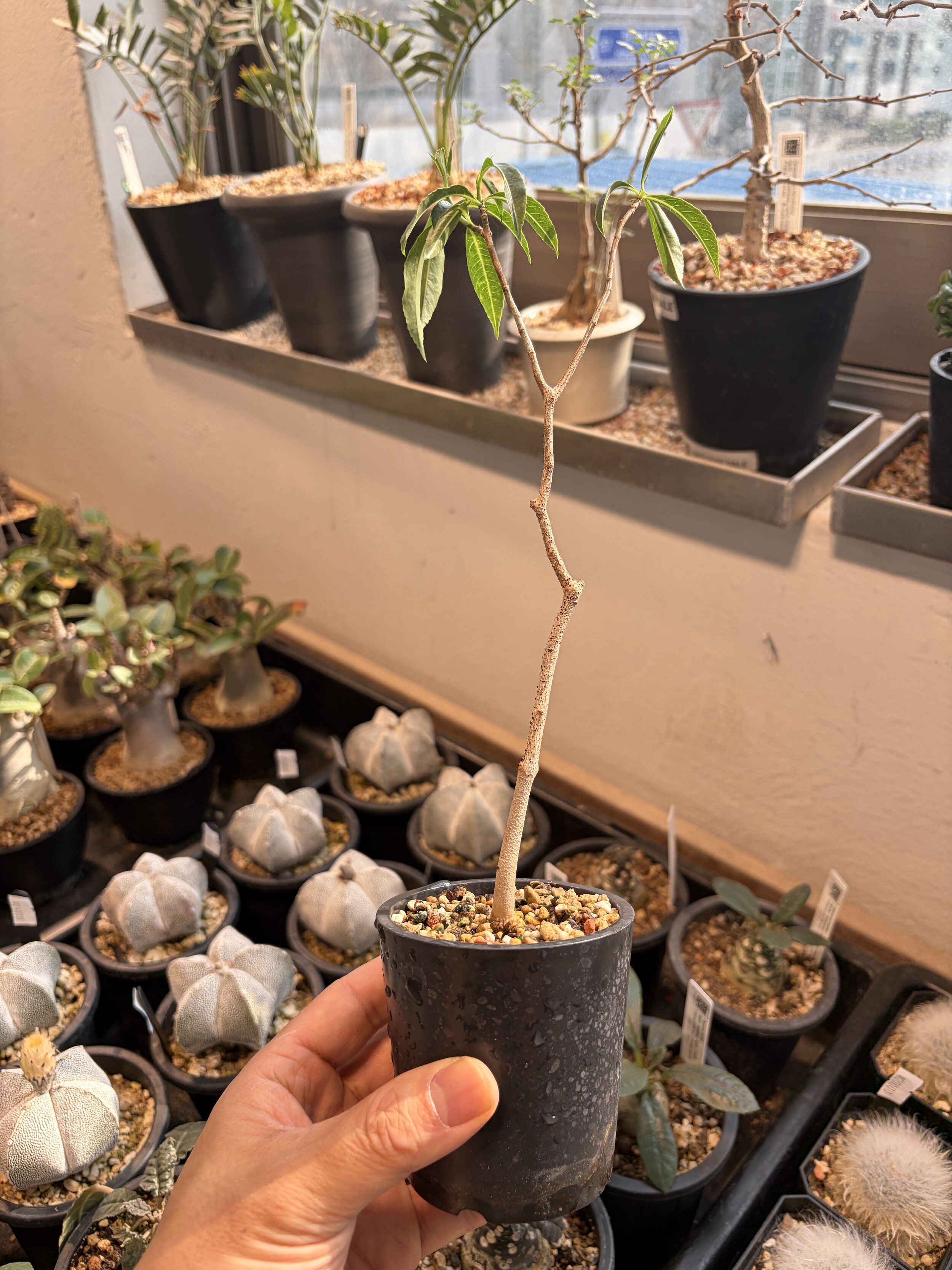 'Caudex' 식물들은 늦가을부터 자연스럽게 잎이 떨어집니다. (환경에 따라 잎이 지지 않을 수 있습니다.) 잎이 떨어지기 시작하면 서서히 물을 줄여나가며 휴면기인 겨울 동안에는 2-3주 1회 가볍게 분무 해주시면 됩니다.