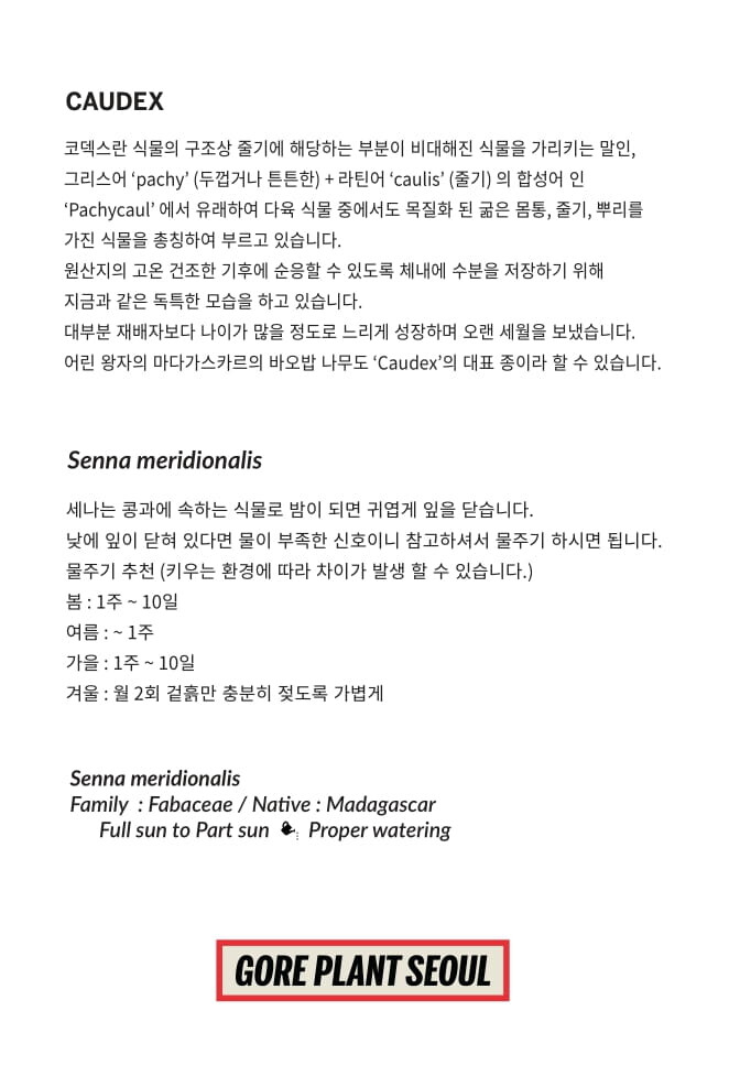 'Caudex' 식물들은 늦가을부터 자연스럽게 잎이 떨어집니다. 잎이 떨어지기 시작하면 서서히 물을 줄여나가며 휴면기인 겨울 동안에는 급수를 중단해야 합니다.