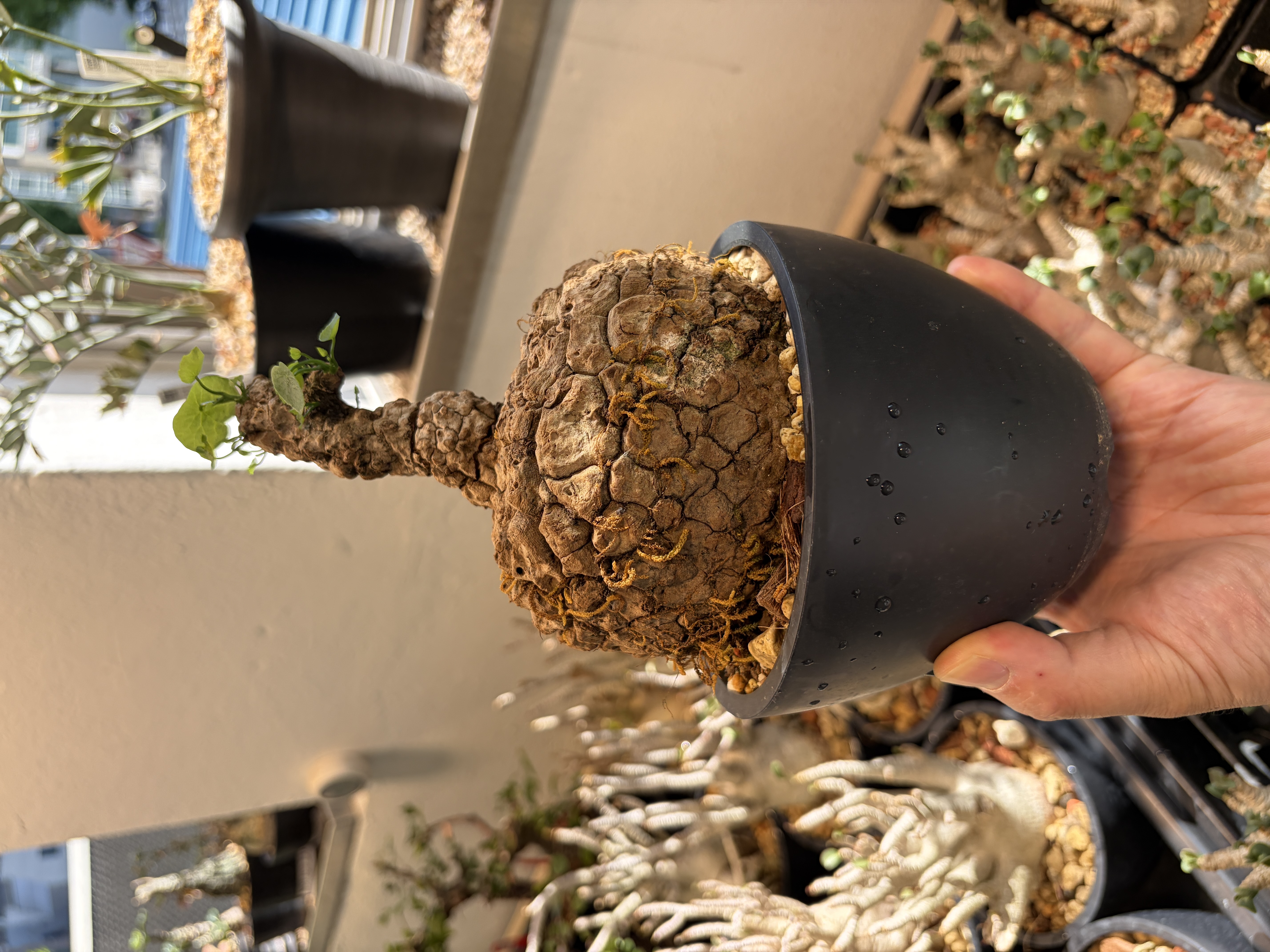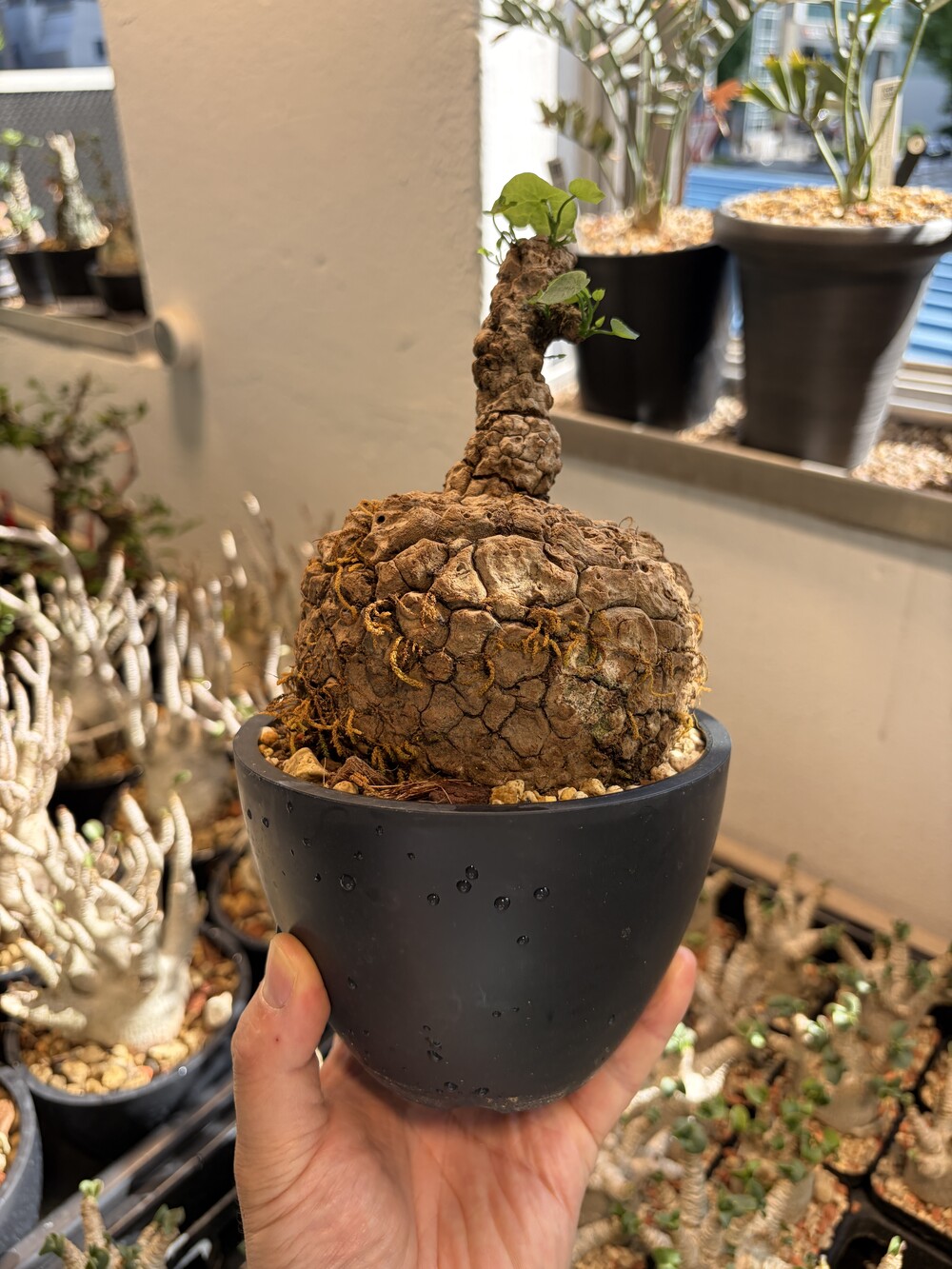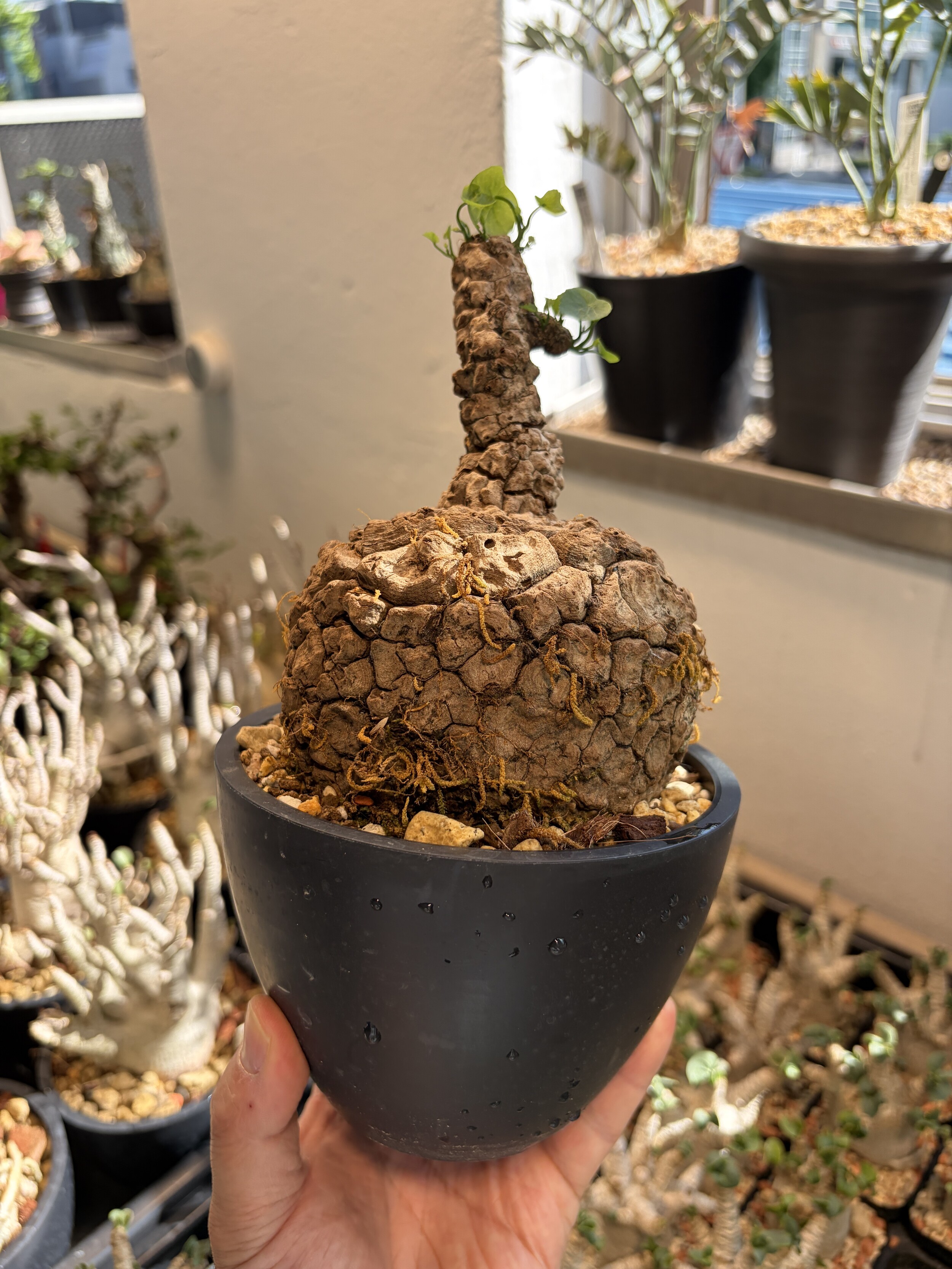 'Caudex' 식물들은 늦가을부터 자연스럽게 잎이 떨어집니다. (환경에 따라 잎이 지지 않을 수 있습니다.) 잎이 떨어지기 시작하면 서서히 물을 줄여나가며 휴면기인 겨울 동안에는 2-3주 1회 가볍게 분무 해주시면 됩니다.