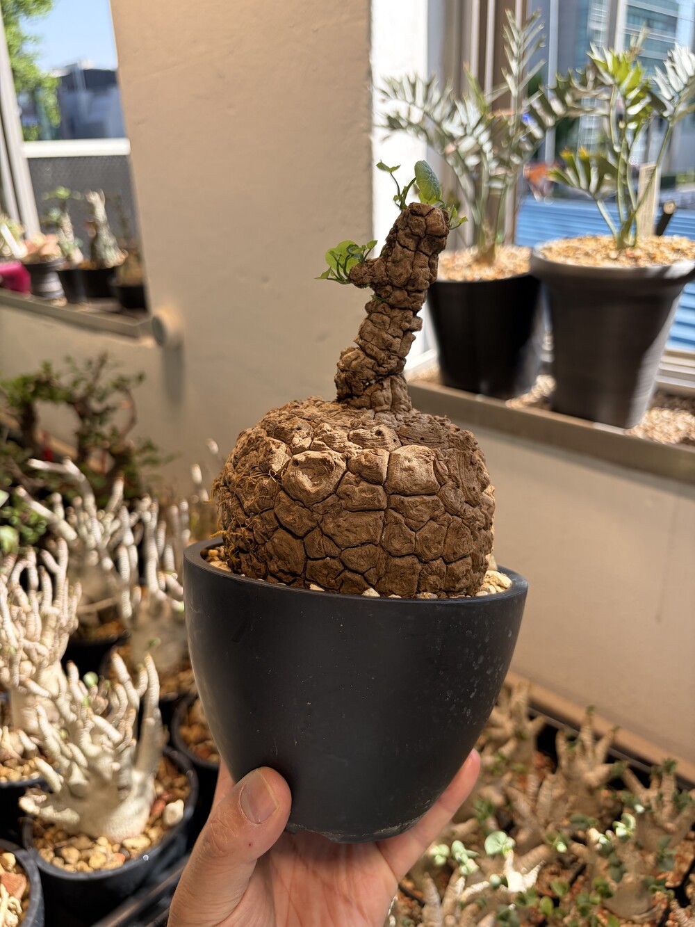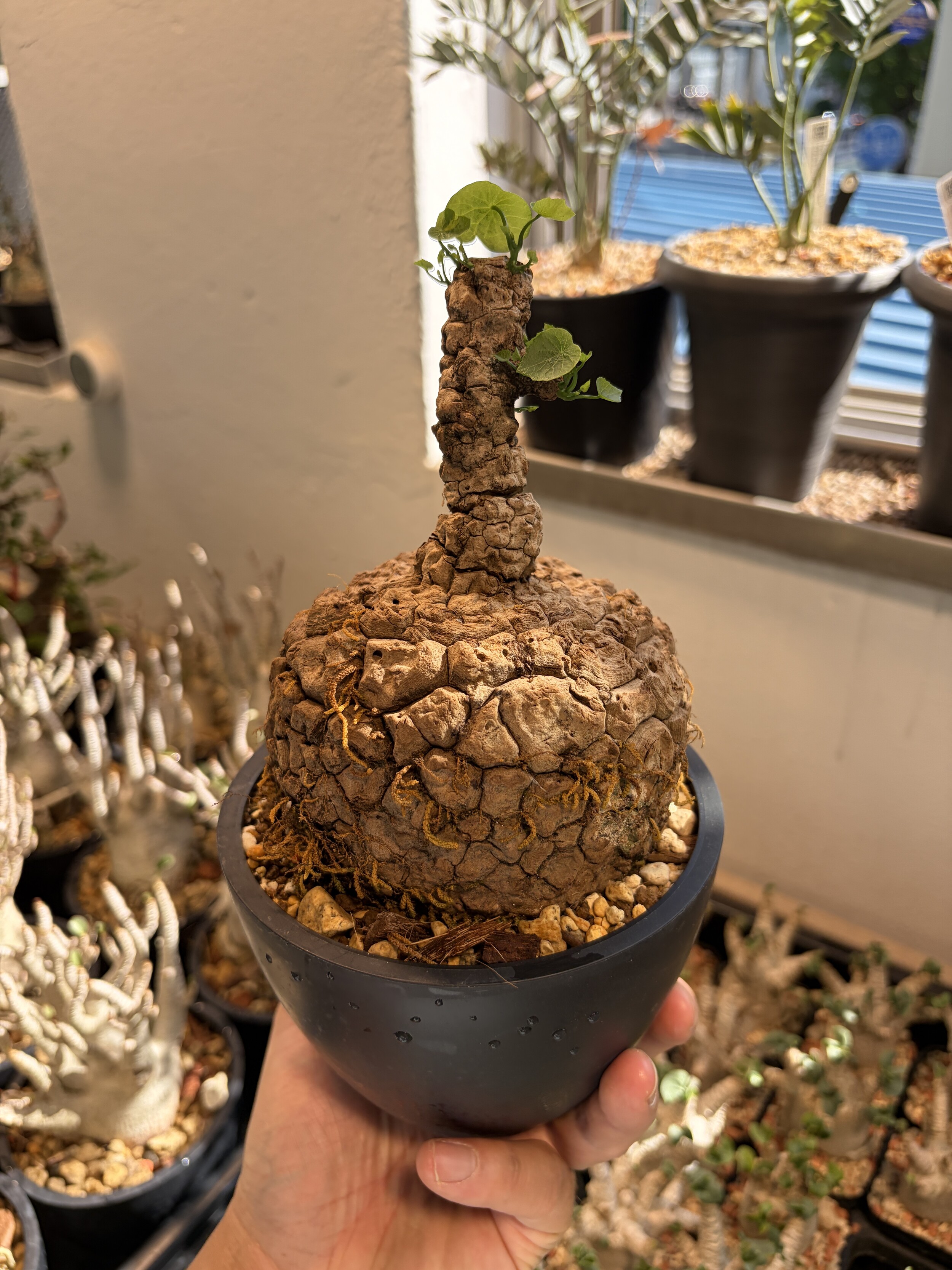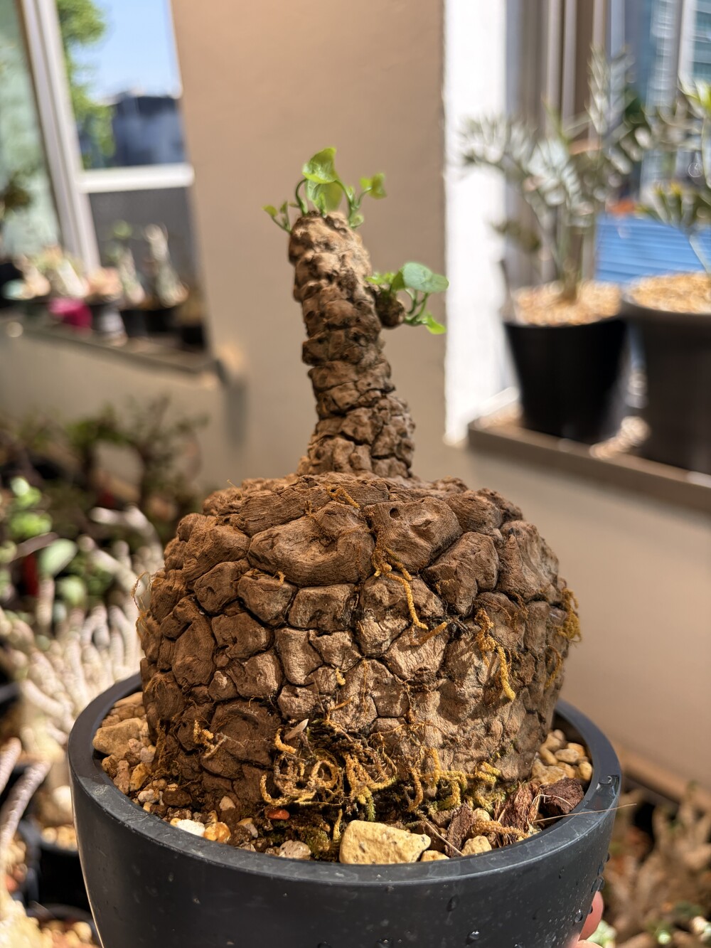 'Caudex' 식물들은 늦가을부터 자연스럽게 잎이 떨어집니다. (환경에 따라 잎이 지지 않을 수 있습니다.) 잎이 떨어지기 시작하면 서서히 물을 줄여나가며 휴면기인 겨울 동안에는 2-3주 1회 가볍게 분무 해주시면 됩니다.