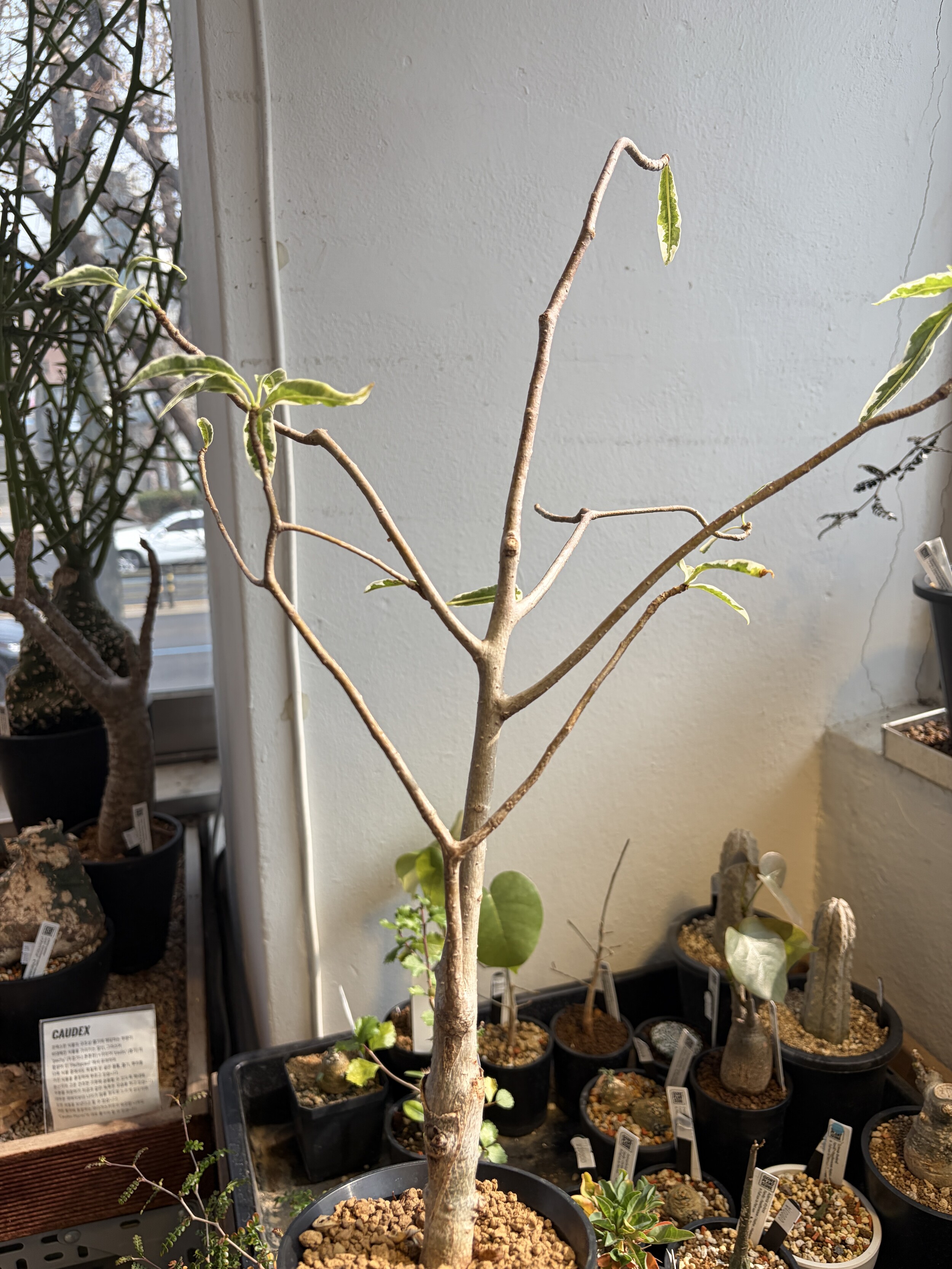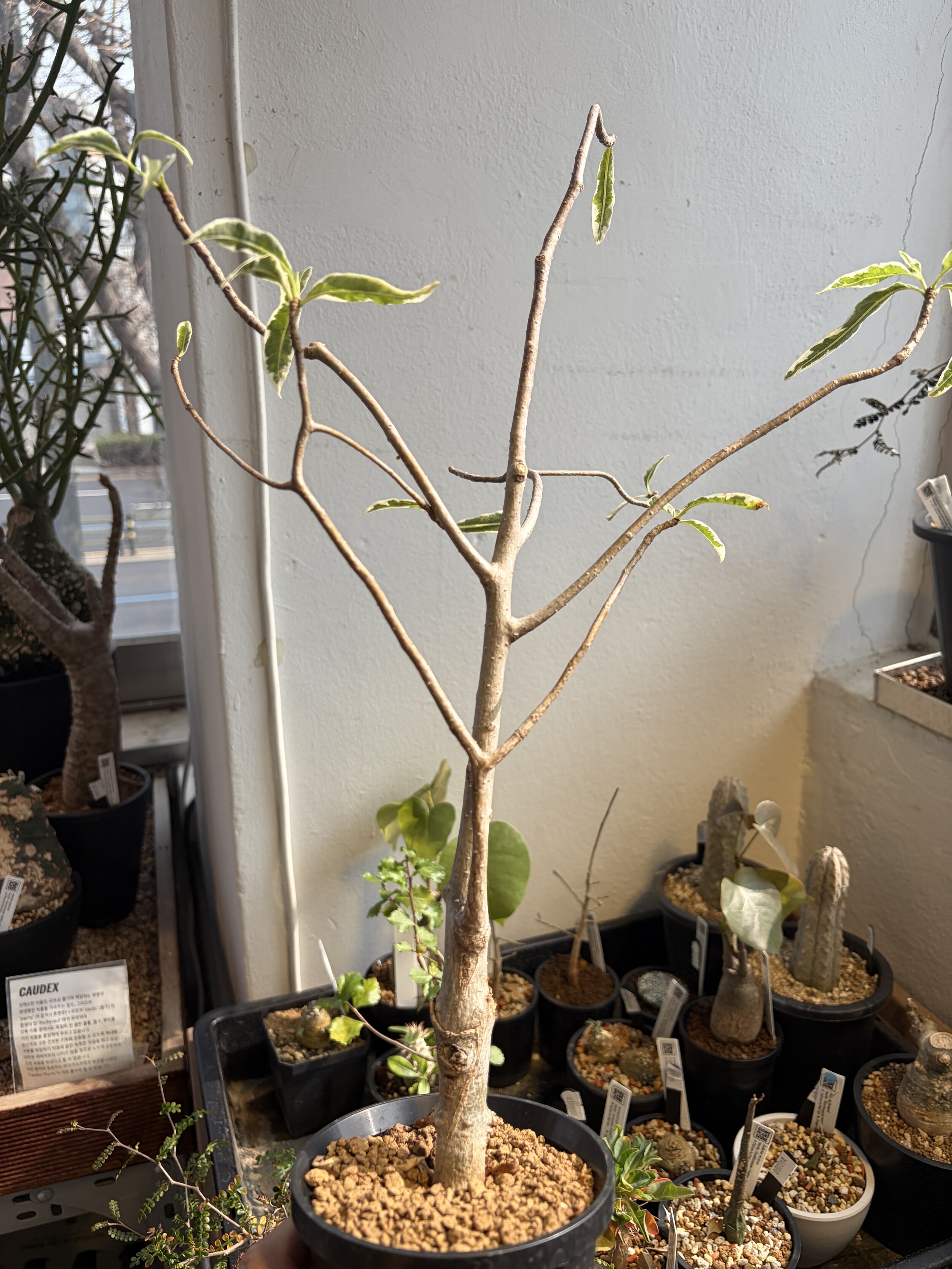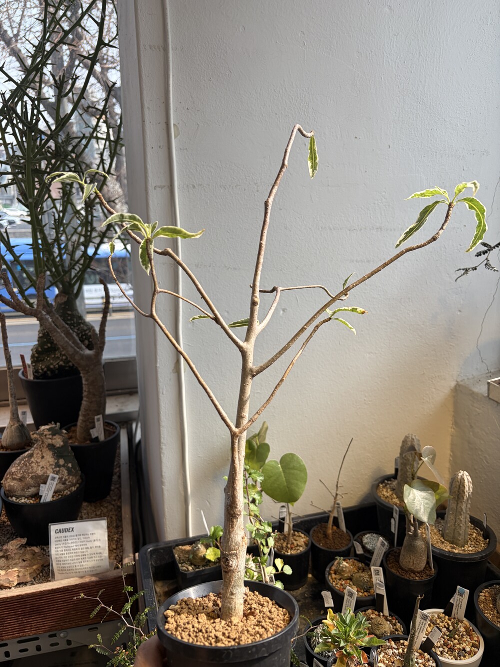 'Caudex' 식물들은 늦가을부터 자연스럽게 잎이 떨어집니다. (환경에 따라 잎이 지지 않을 수 있습니다.) 잎이 떨어지기 시작하면 서서히 물을 줄여나가며 휴면기인 겨울 동안에는 2-3주 1회 가볍게 분무 해주시면 됩니다.